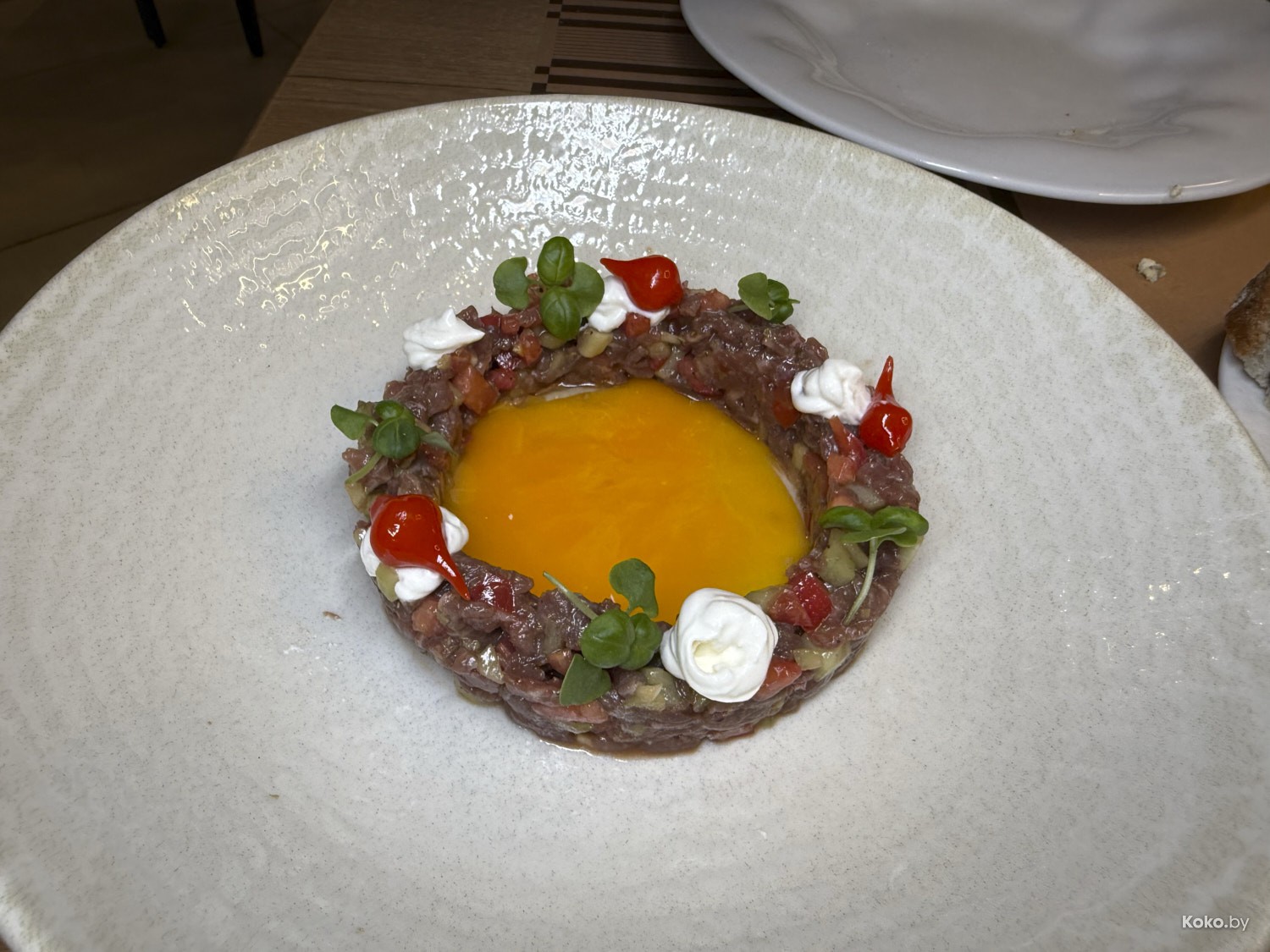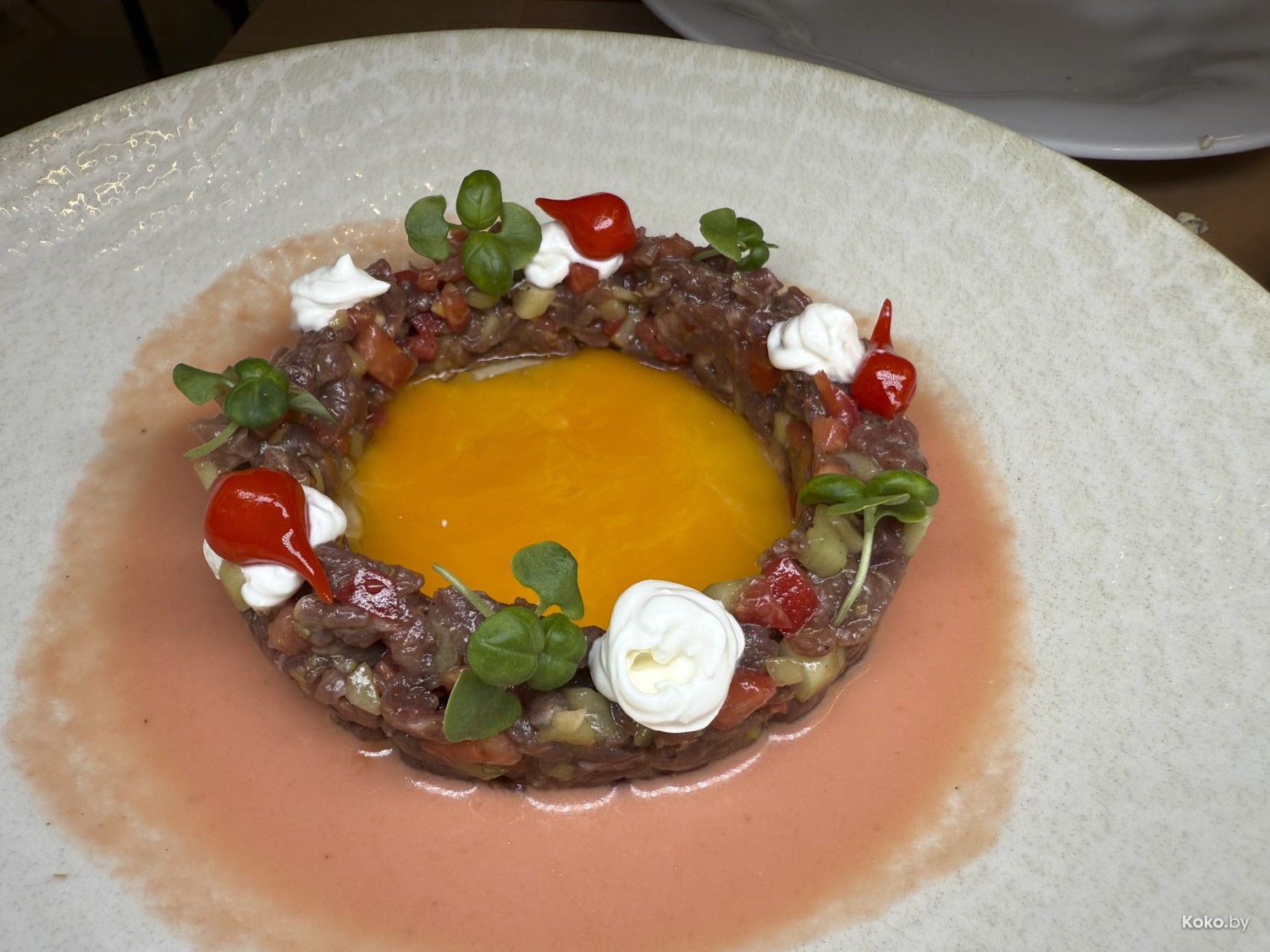 3. Тартар по-колизейски - внутри желток, снаружи ров из арбузного гаспачо. Суперское сочетание говядины со свежестью лета, с вас 28р.