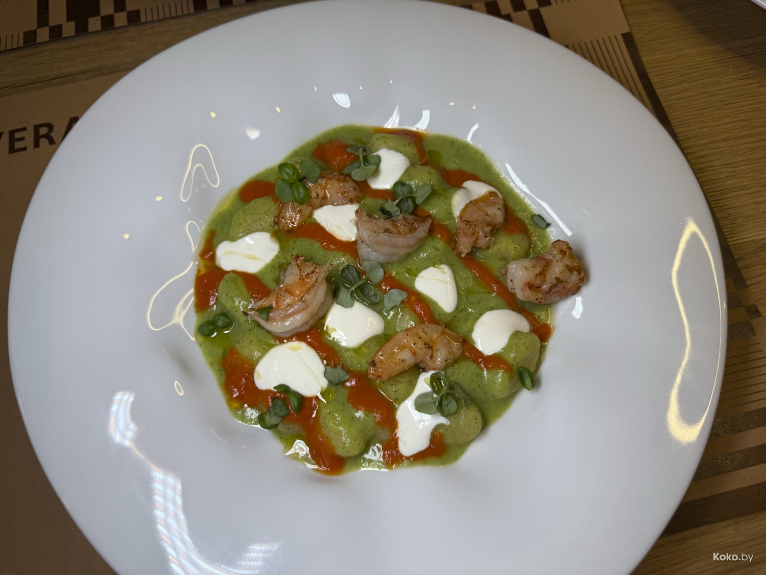 6. Картофельные клёцки с хрустящей порубленной креветкой в двух соусах - 26р. По вкусности не уступает горгонзольной пасте.