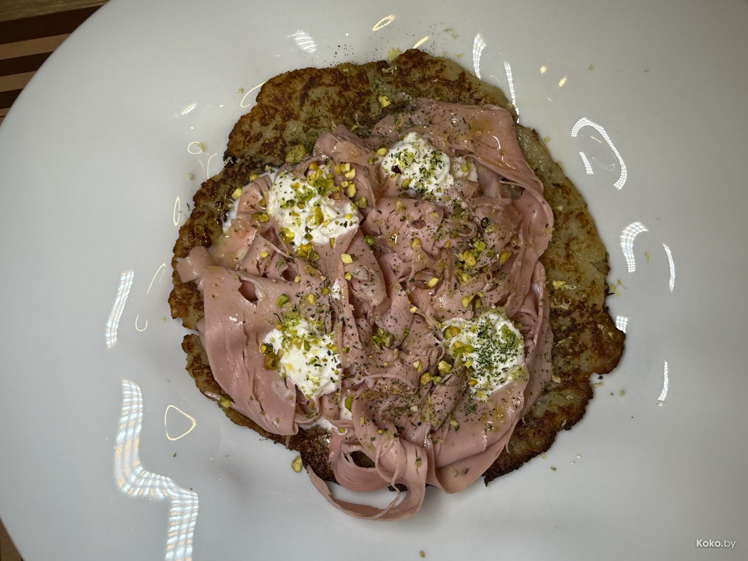 2. Цельный драник без золотистой корочки с потрёпанной мортаделлой, страчателлой и фисташкой. Дед такое на завтрак делал, когда бабуля не успевала доставку еды оформить. Обычное явление за 24р.
