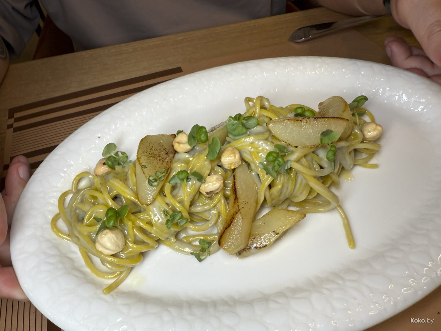 5. За 22р самодельные спагетти в щекочущем нос синеватом сырном соусе Горгонзола, сладкой грушей с обжареным филе фундука. За остатки макарон дрались, уж слишком вкусная комбинация.