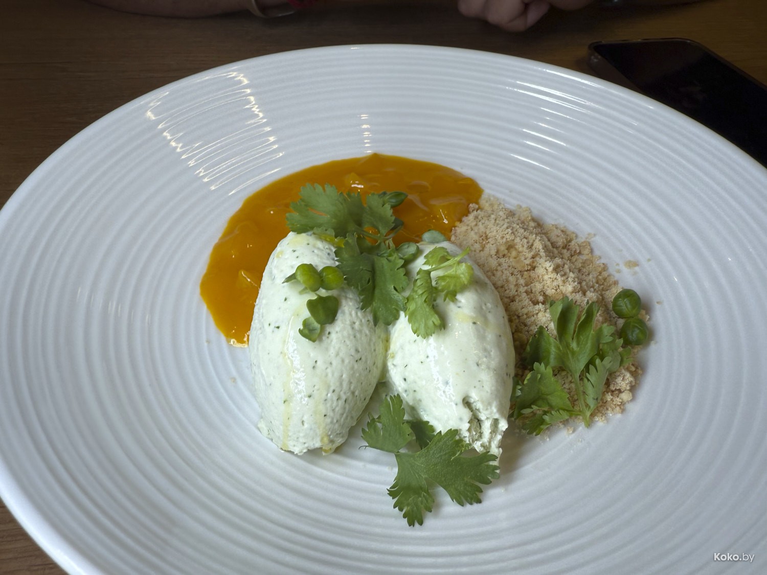 На сладкое - коварная панна-котта из кокоса за 16р с манговым болотом, кинзой и острым пепердочино. Пойдёт, едал вкуснее.