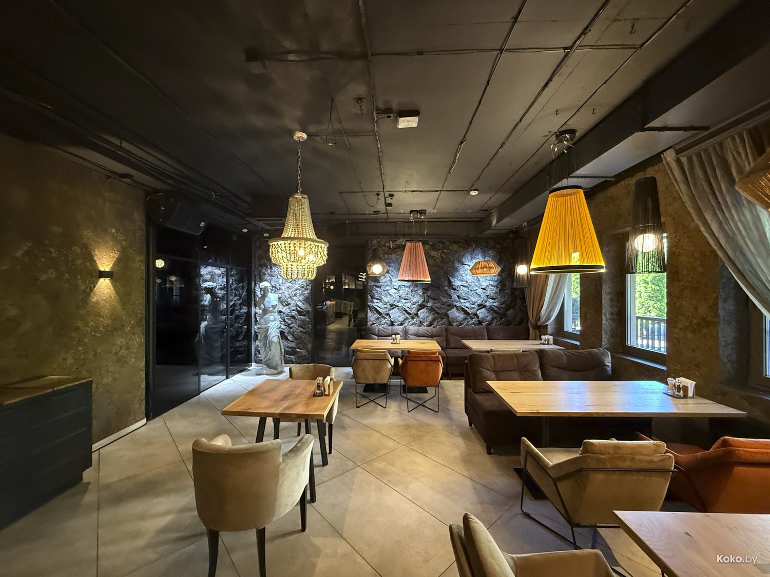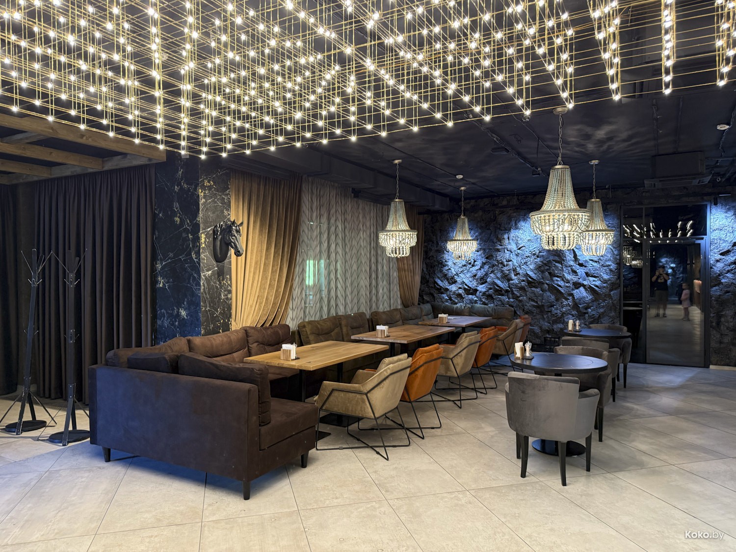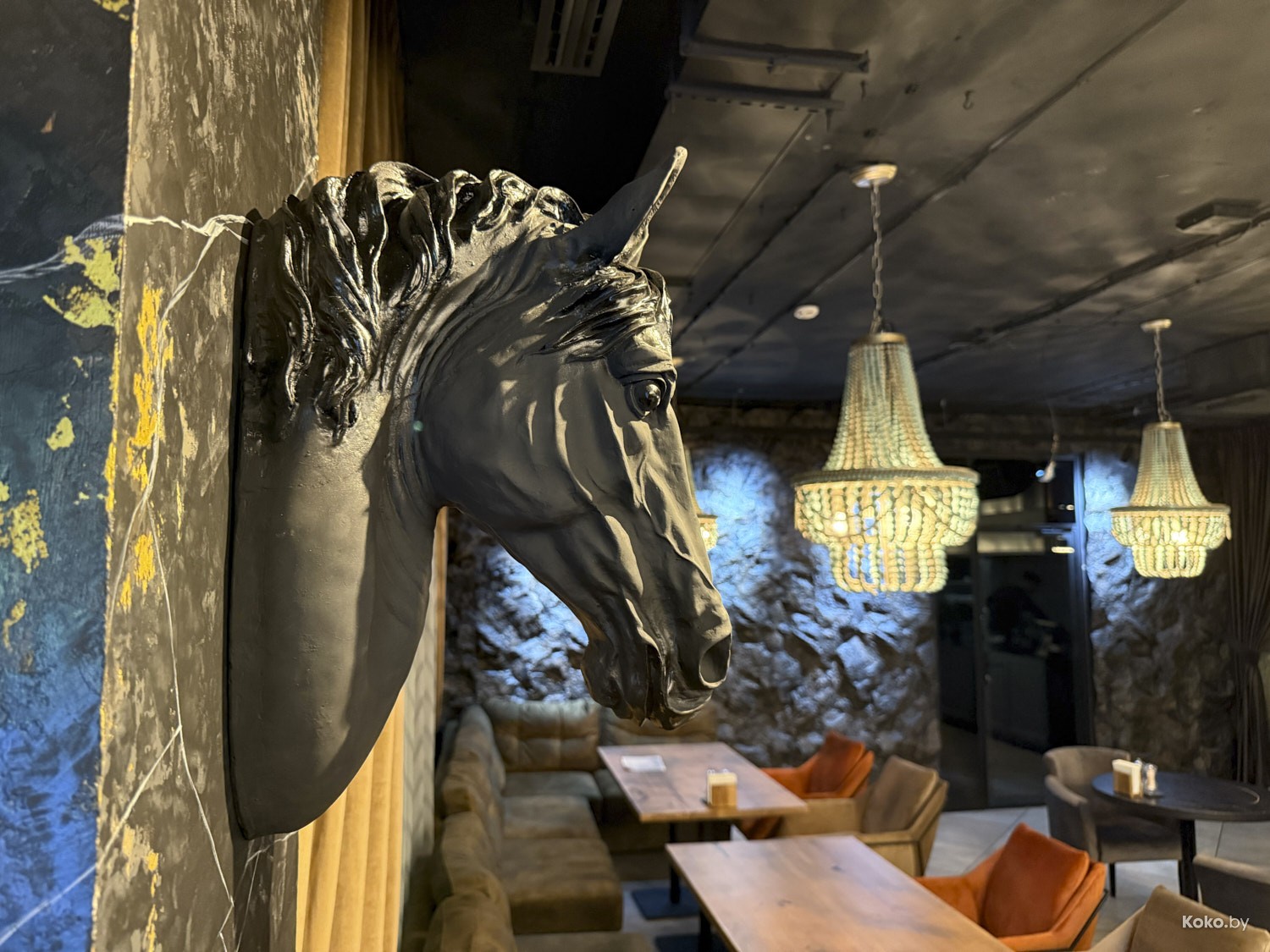 Простенько, но уютно, на стенах головы лошадей, чёрный камень в декоре, тонированные стёкла, интимное освещение, с десяток столов под различные поводы и полностью просматриваемая кухня, где делают всё в рамках закона. Атмосфера безликая, шумных гостей не хватает.
