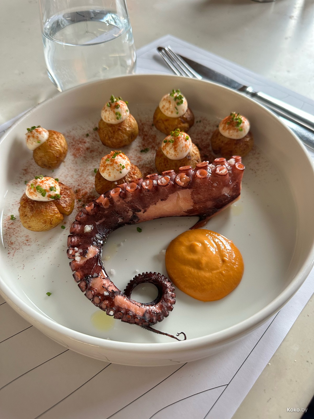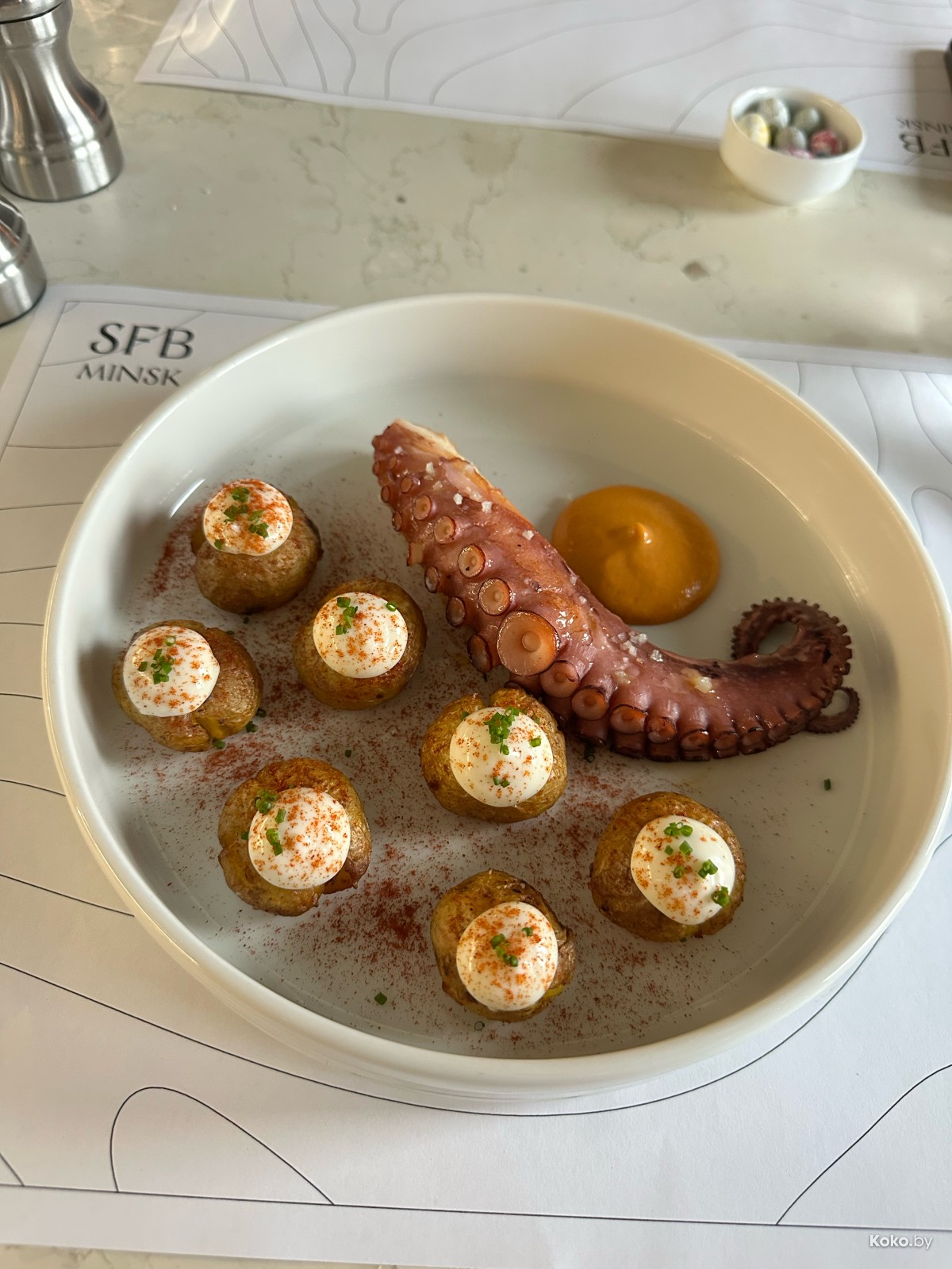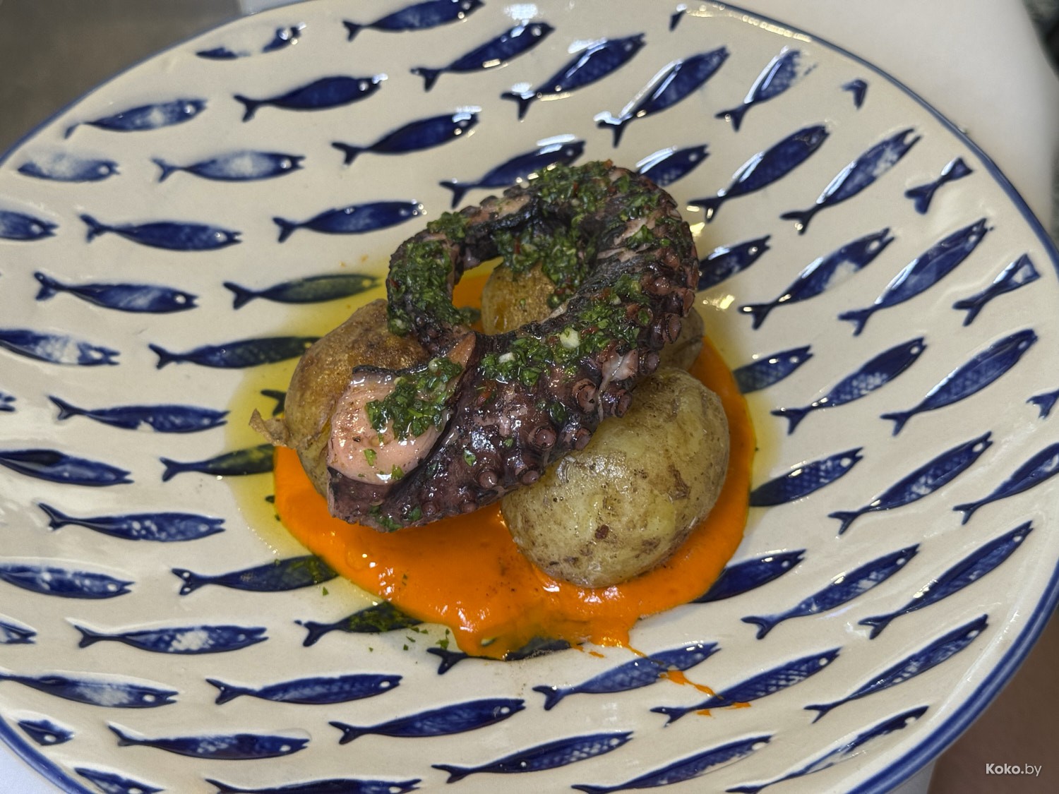 4. За 39р на гриле руки осьминога в пряном чимичурри на печёном картофеле, опять в ромеско. Богато выглядел в первый раз, видимо, посчитали себес и разделили щупальца на две порции.