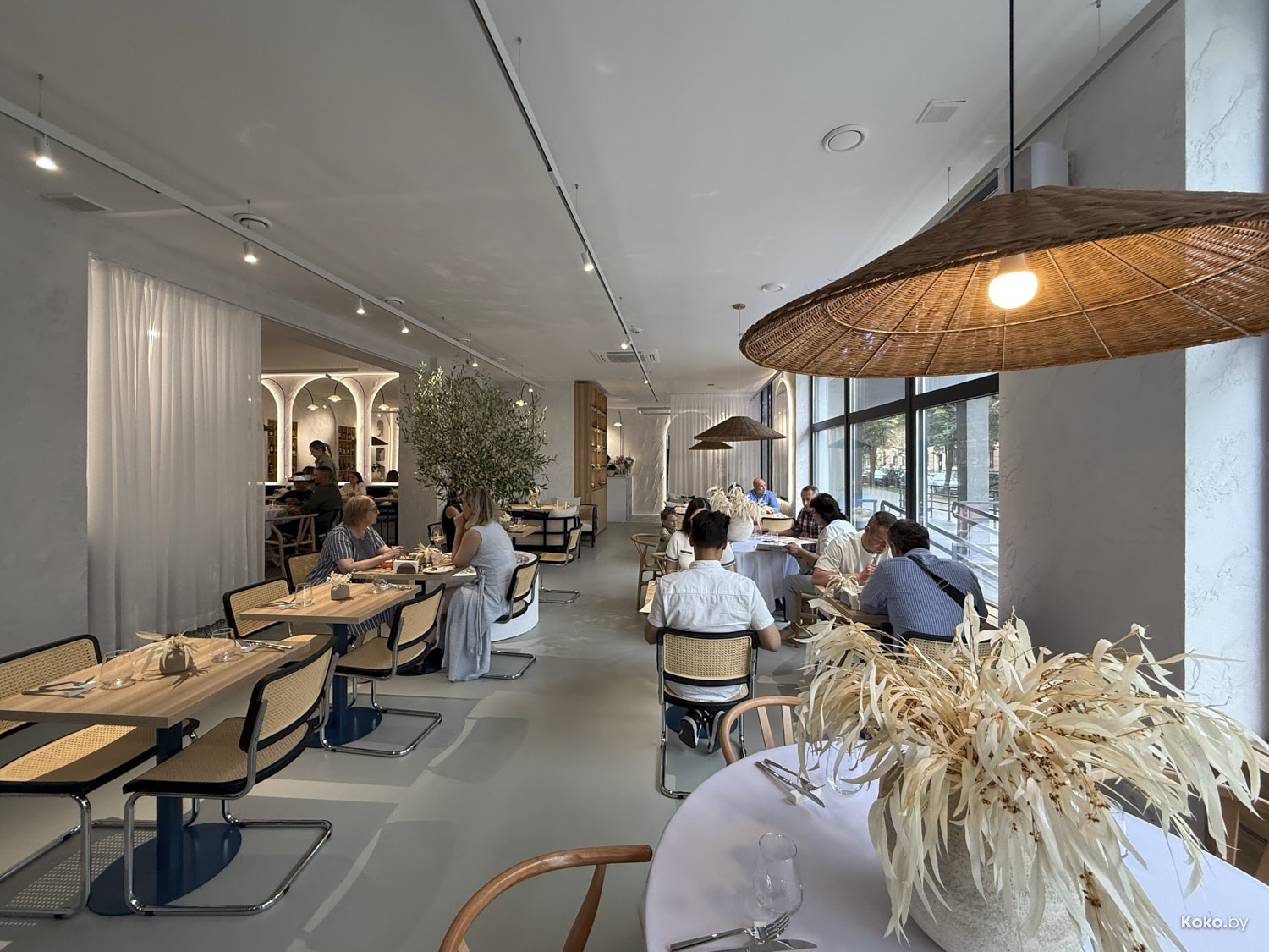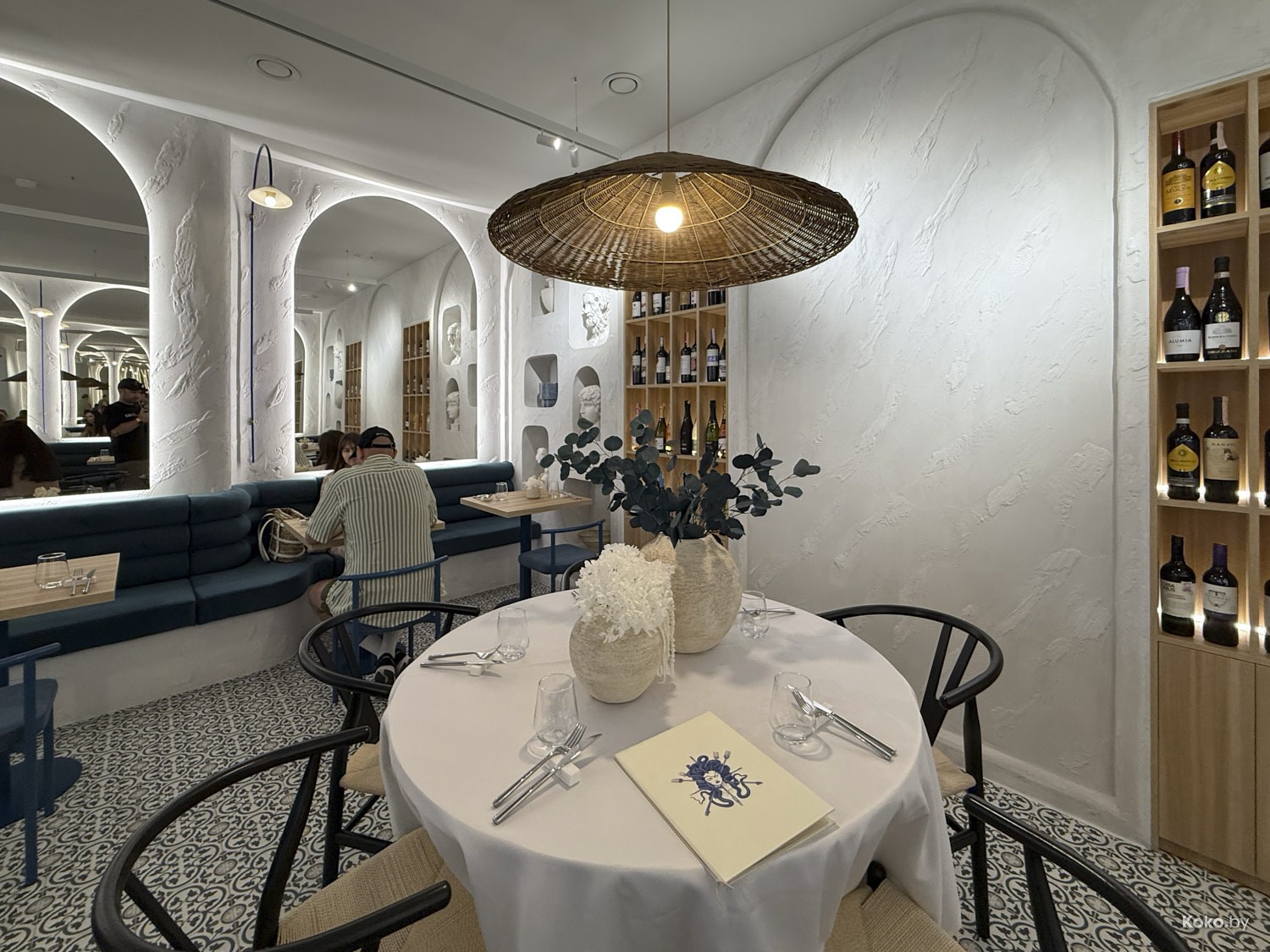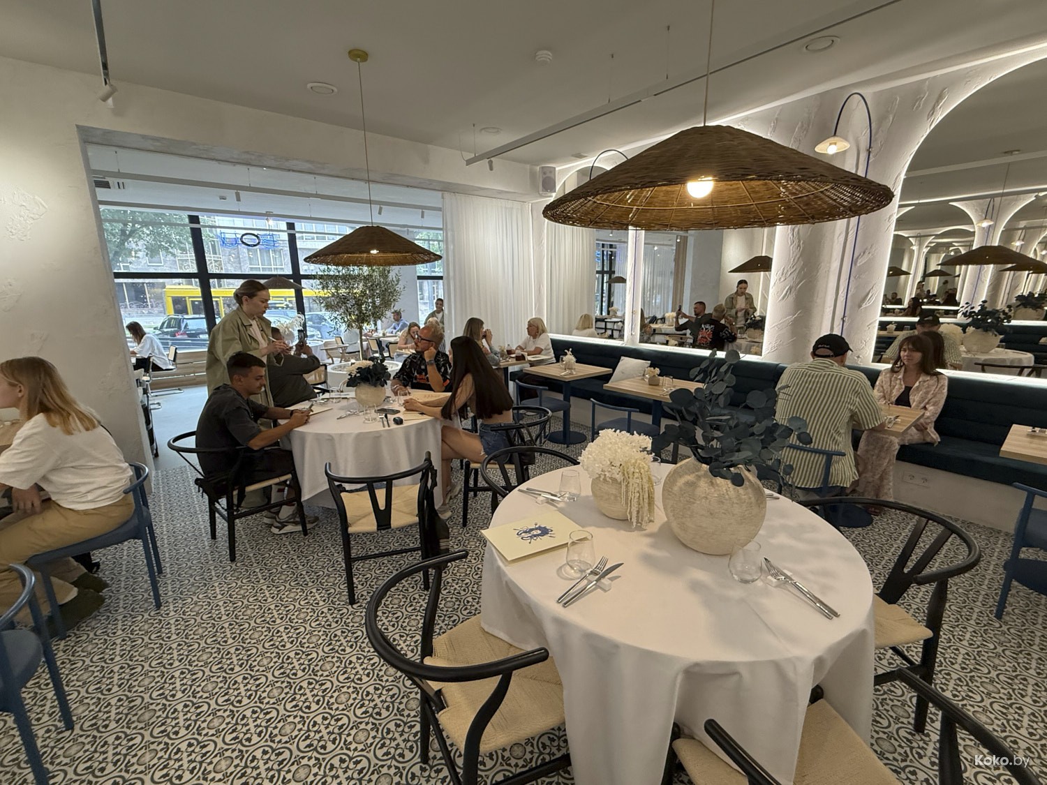 Просторное помещение с видом через сплошные окна на дом для богатых, да, окна не мешало бы хорошенько натереть. Греческое бистро в простом, но комфортном дизайне на любой случай в жизни, без пафоса, без понтов, без сильных вложений в то, что с собой не забрать.
