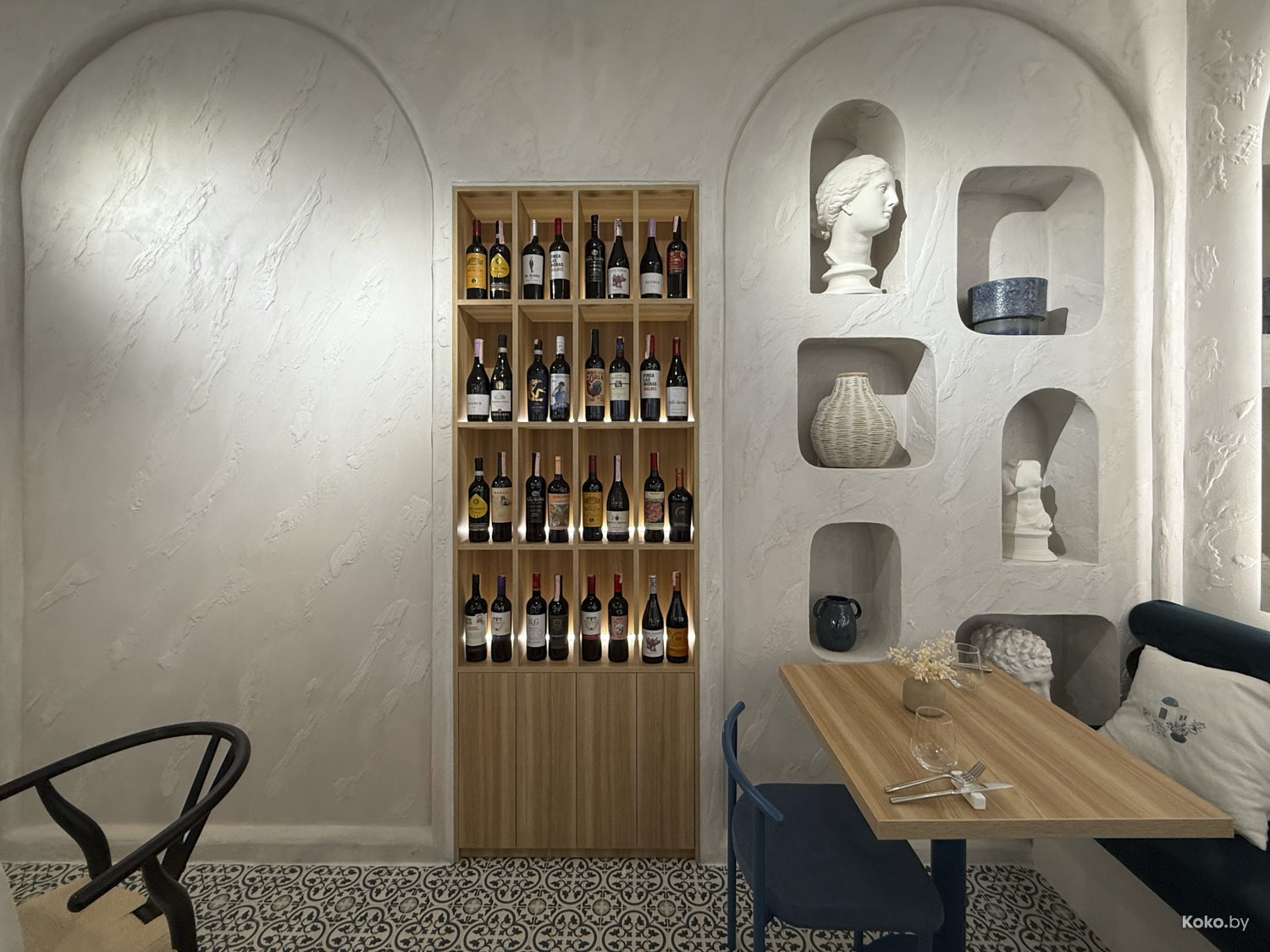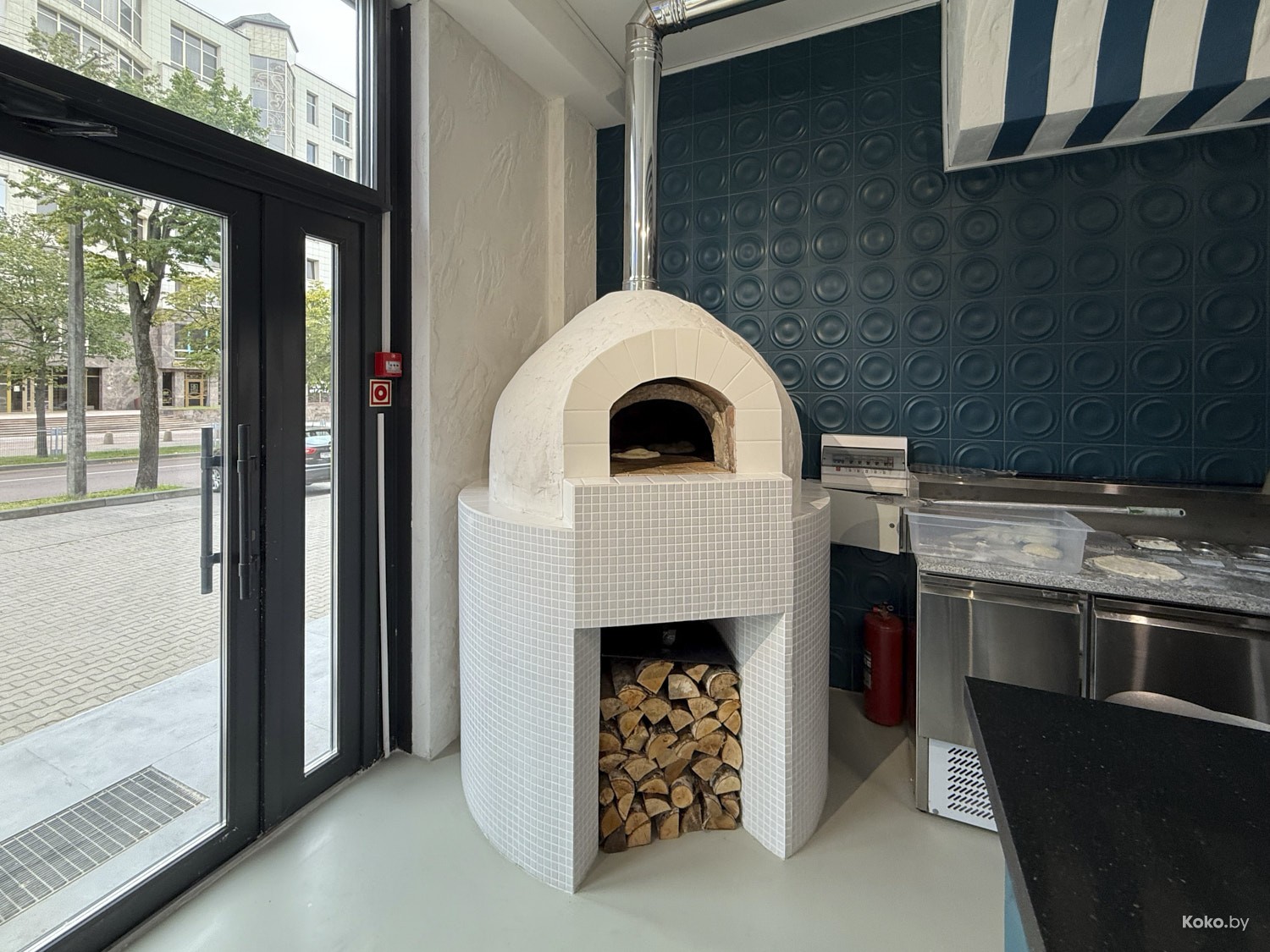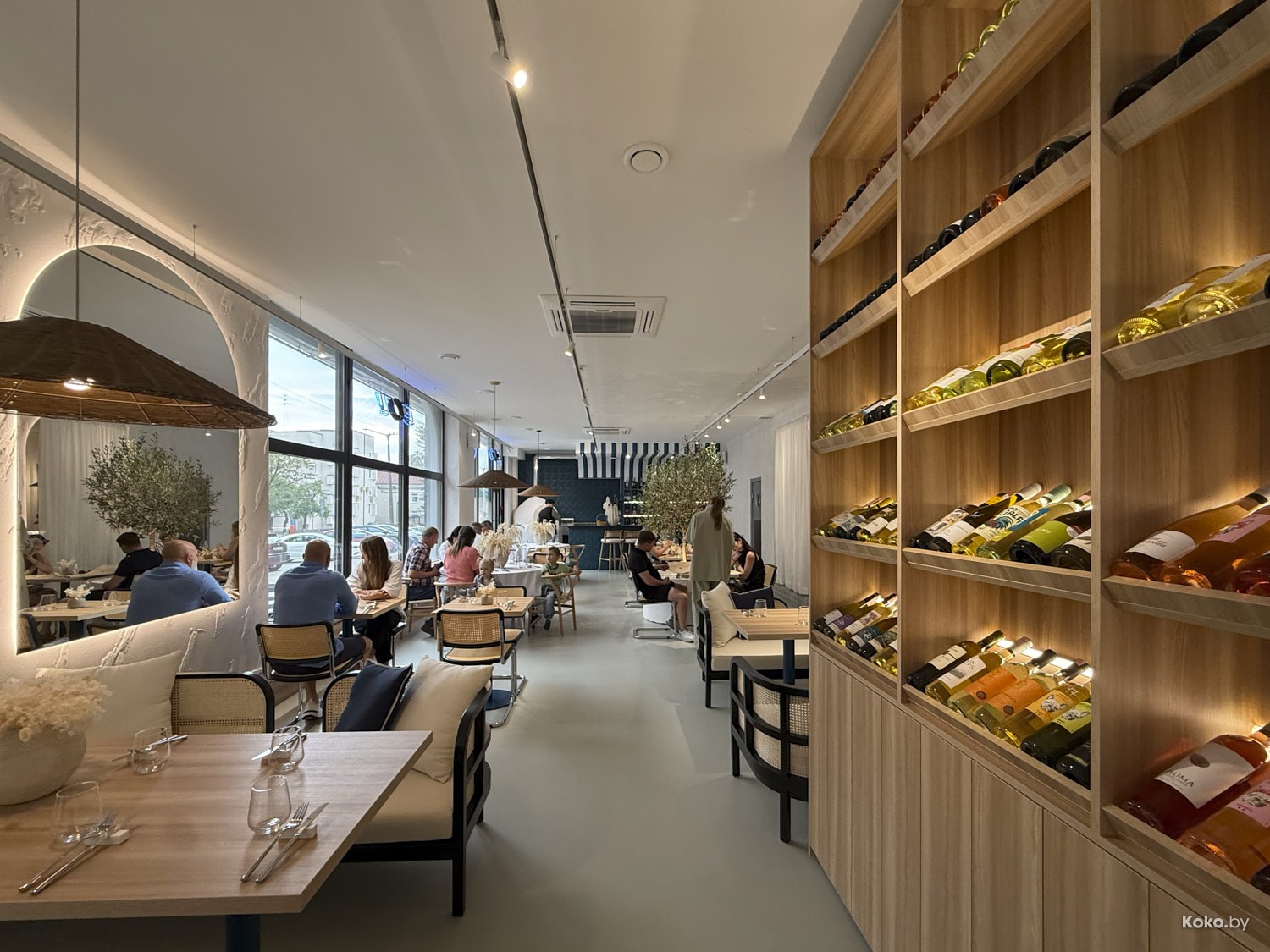 Просторное помещение с видом через сплошные окна на дом для богатых, да, окна не мешало бы хорошенько натереть. Греческое бистро в простом, но комфортном дизайне на любой случай в жизни, без пафоса, без понтов, без сильных вложений в то, что с собой не забрать.