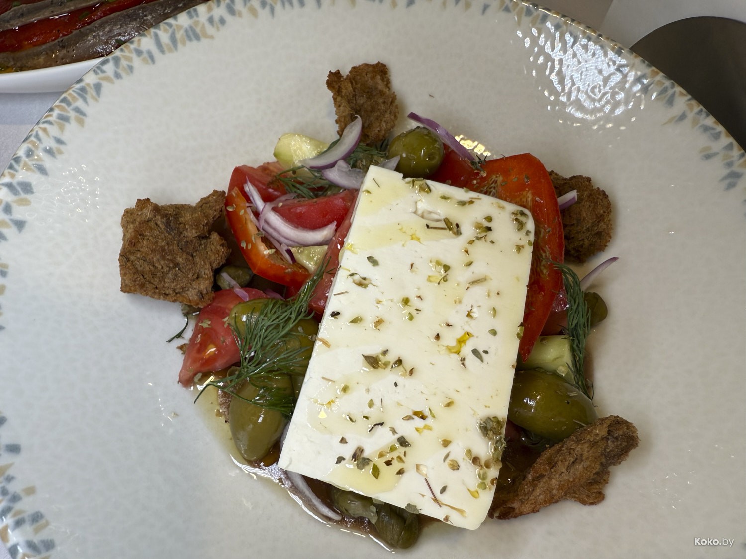 3. Салат по-деревенски из зрелых овощей в сладком бальзамическом соусе с тонким куском Феты, оливками, каперсами и рваными руками сухариками из филе чёрного хлеба. Остерегайтесь косточек.