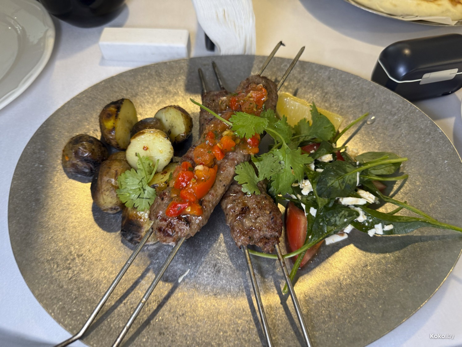6. Дабл кебаб на спицах с запечёнными в золе нашими корнеплодами за 35р выглядит сытно, мясо могло быть сочнее, можно брать смело.