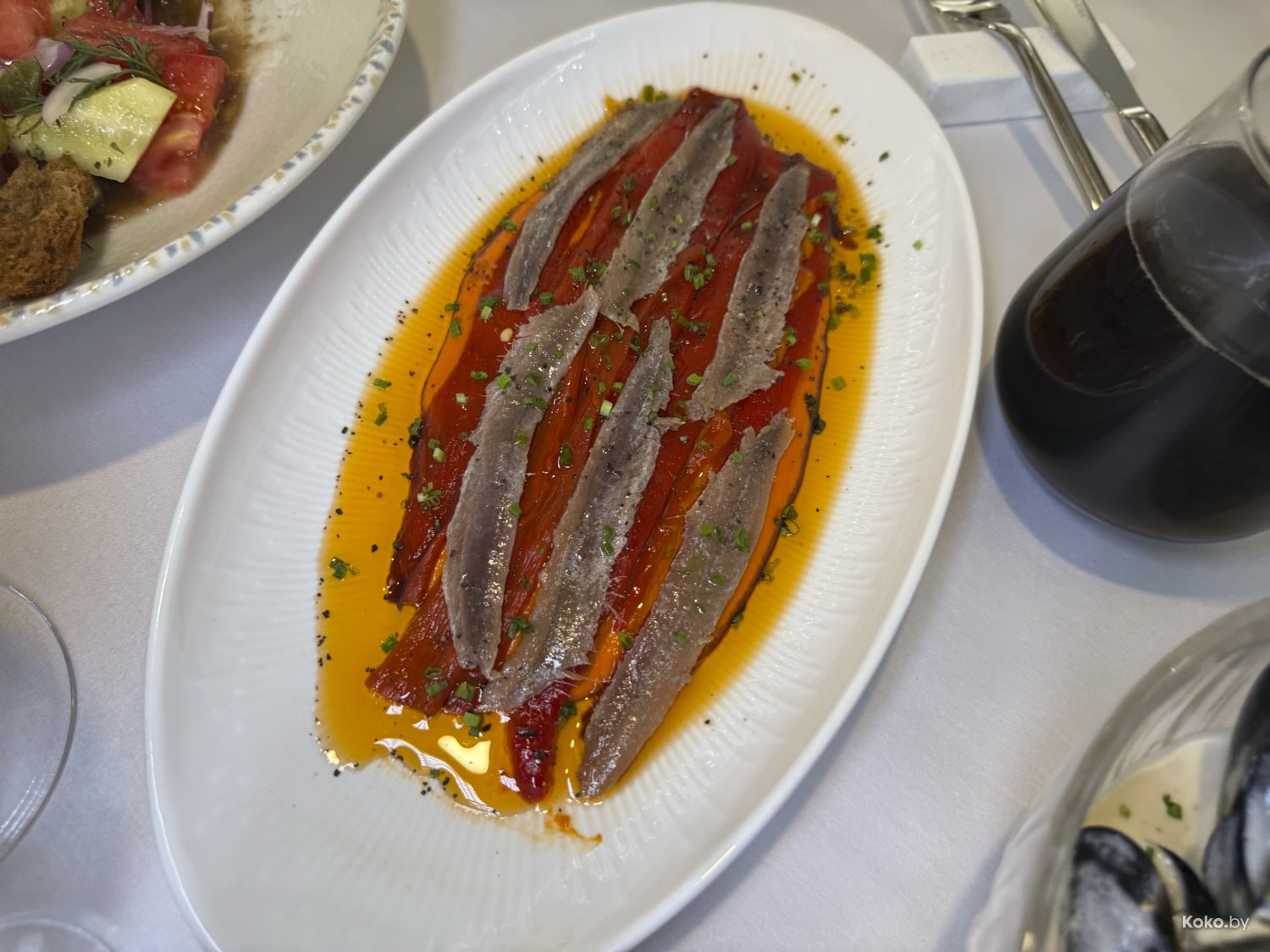 2. Кайфовая закуска из филе сладких печёных перцев с солёненькими анчоусами на оранж соусе ромеско из печёных перцев со специями.
