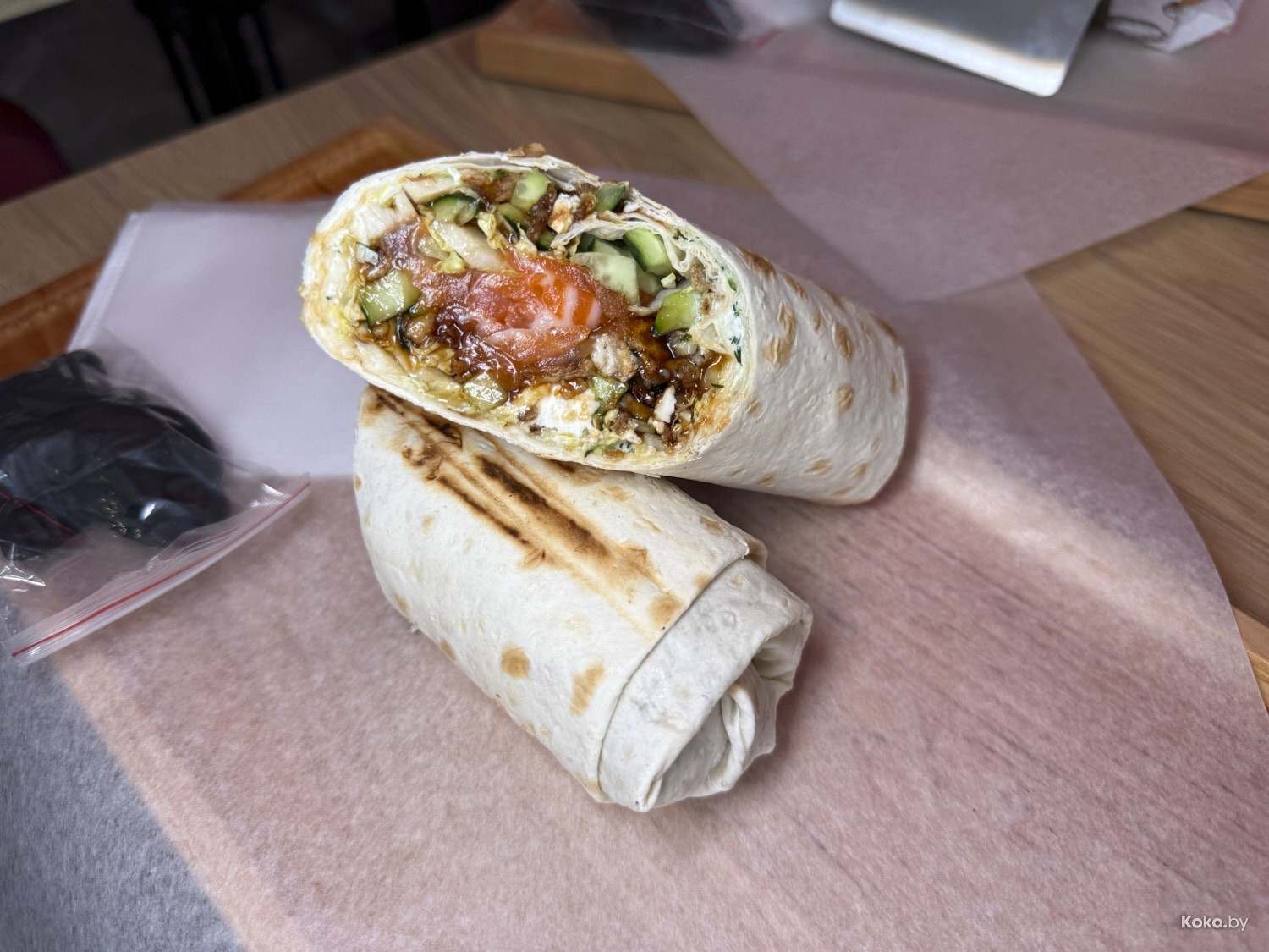 1. Лосось с овощами и сыром фета в сладко-липком соусе терияки больше ролл, чем шаурма. Цвет рыбы здоровый, порция, как в ролле Калифорния за 18р у «Марлина», скрутили туго в хрустящий лаваш, с соусами баланс, не течёт, не брызжет, в руках в букет не превратилась.