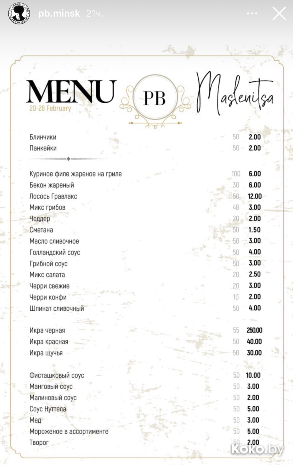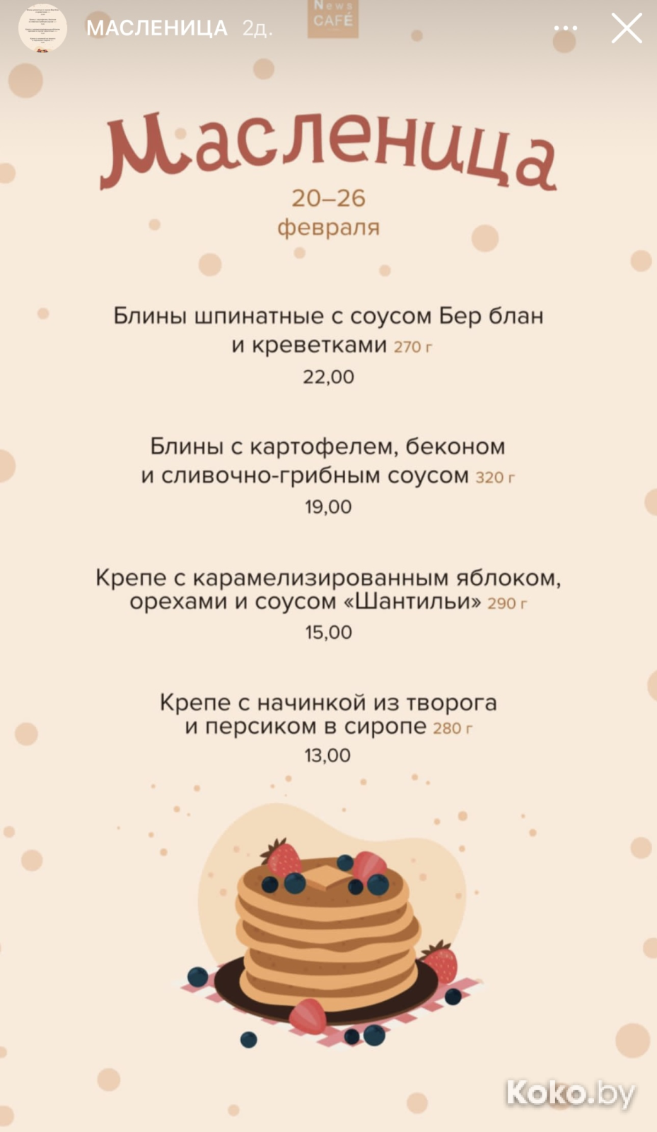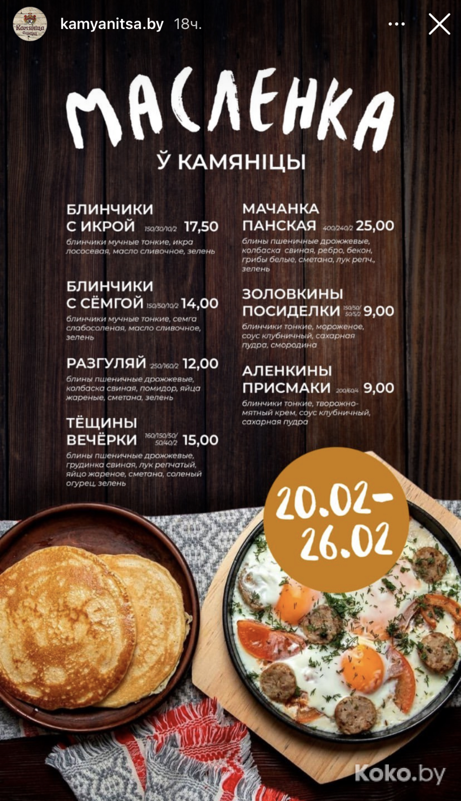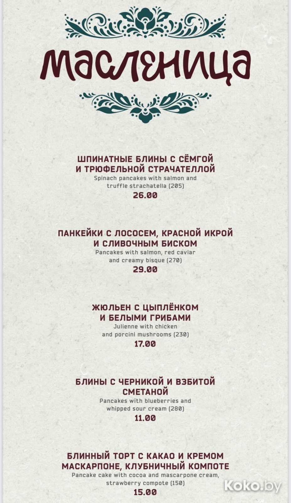 Отмечают языческую Масленицу с 20 по 26 февраля перед Великим постом, в конце приносят в жертву чучело. А для заведений очередной отличный маркетинговый повод, чтобы на семь дней ввести в меню разные блины задорого. Чтобы вам не искать, я быстренько пробежался и собрал блинное меню почти всех заведений. Кому не лениво, можете нажарить блины дома, мы в прошлую субботу приготовили мачанку по-жасминовски.