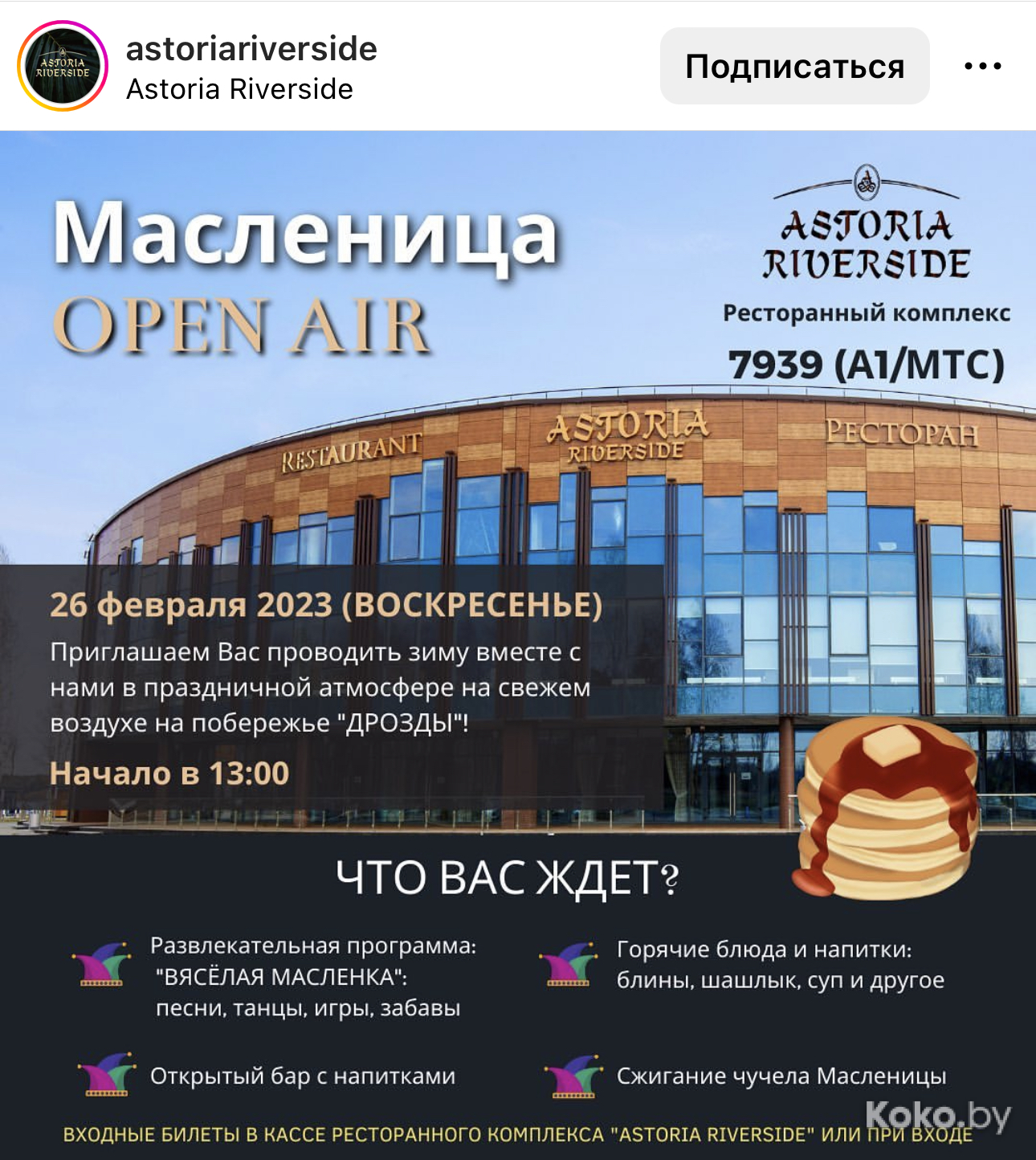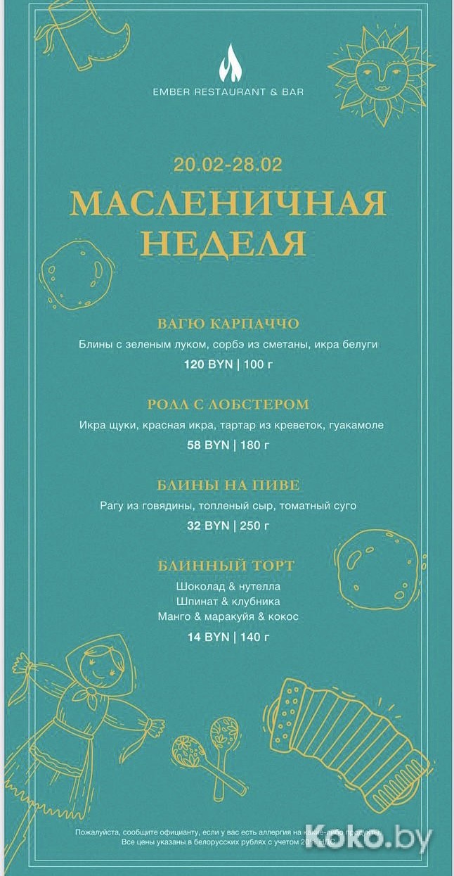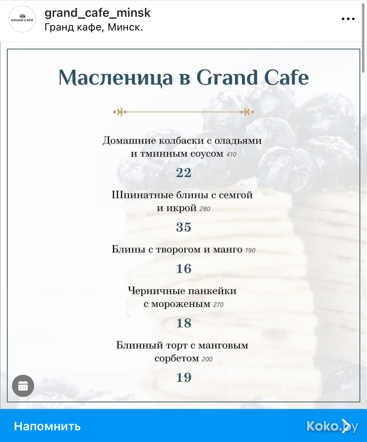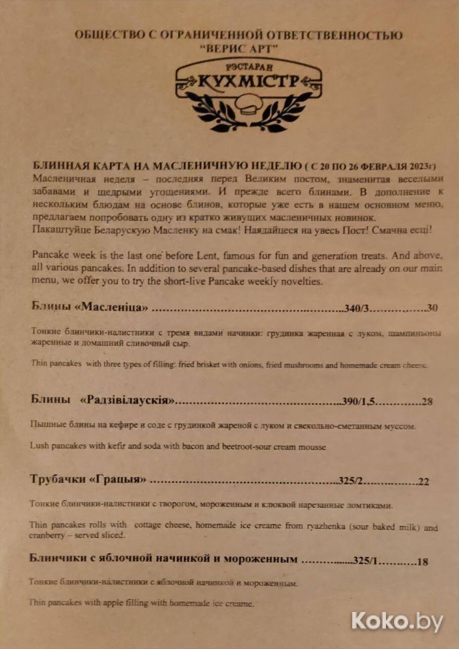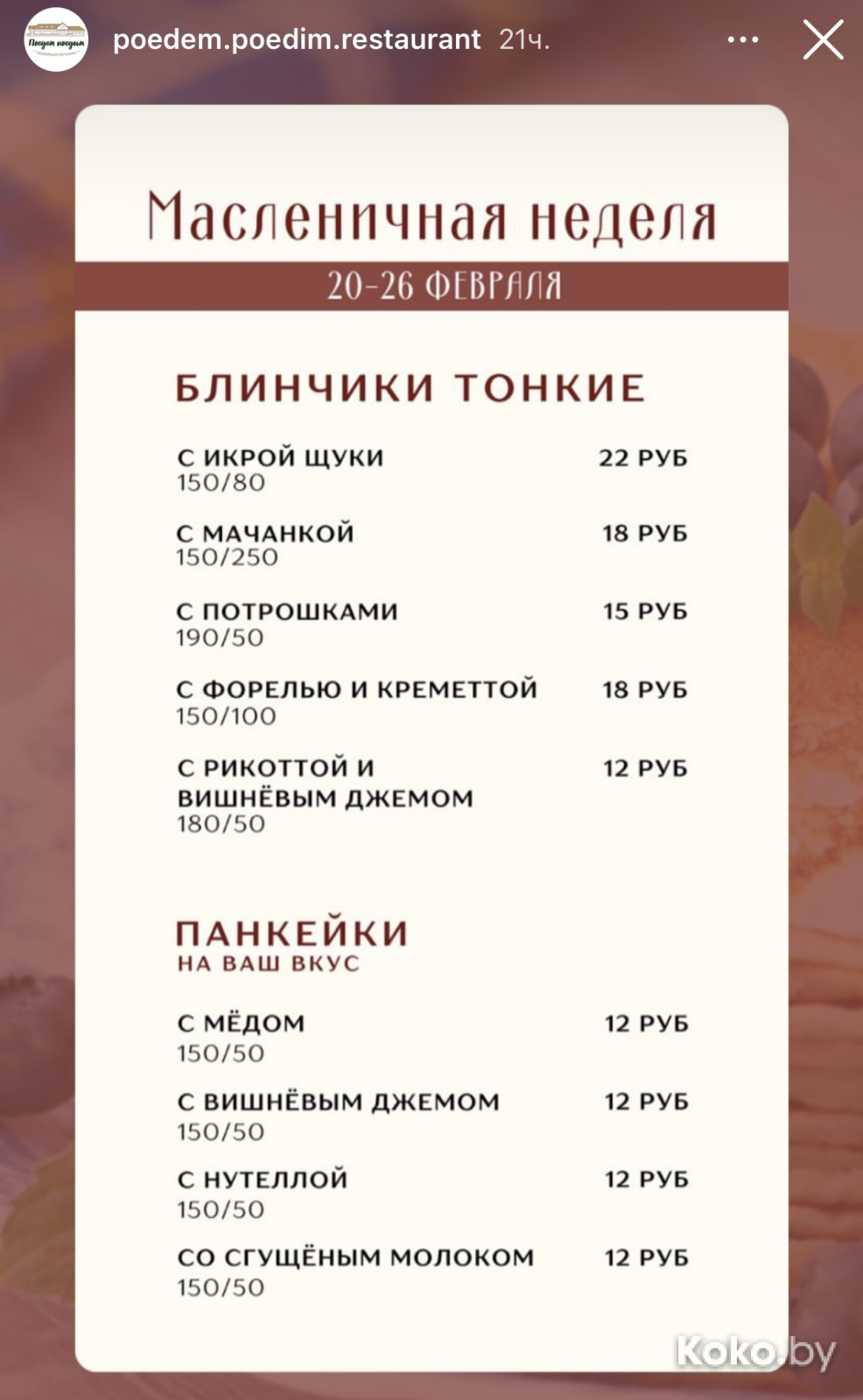 Отмечают языческую Масленицу с 20 по 26 февраля перед Великим постом, в конце приносят в жертву чучело. А для заведений очередной отличный маркетинговый повод, чтобы на семь дней ввести в меню разные блины задорого. Чтобы вам не искать, я быстренько пробежался и собрал блинное меню почти всех заведений. Кому не лениво, можете нажарить блины дома, мы в прошлую субботу приготовили мачанку по-жасминовски.