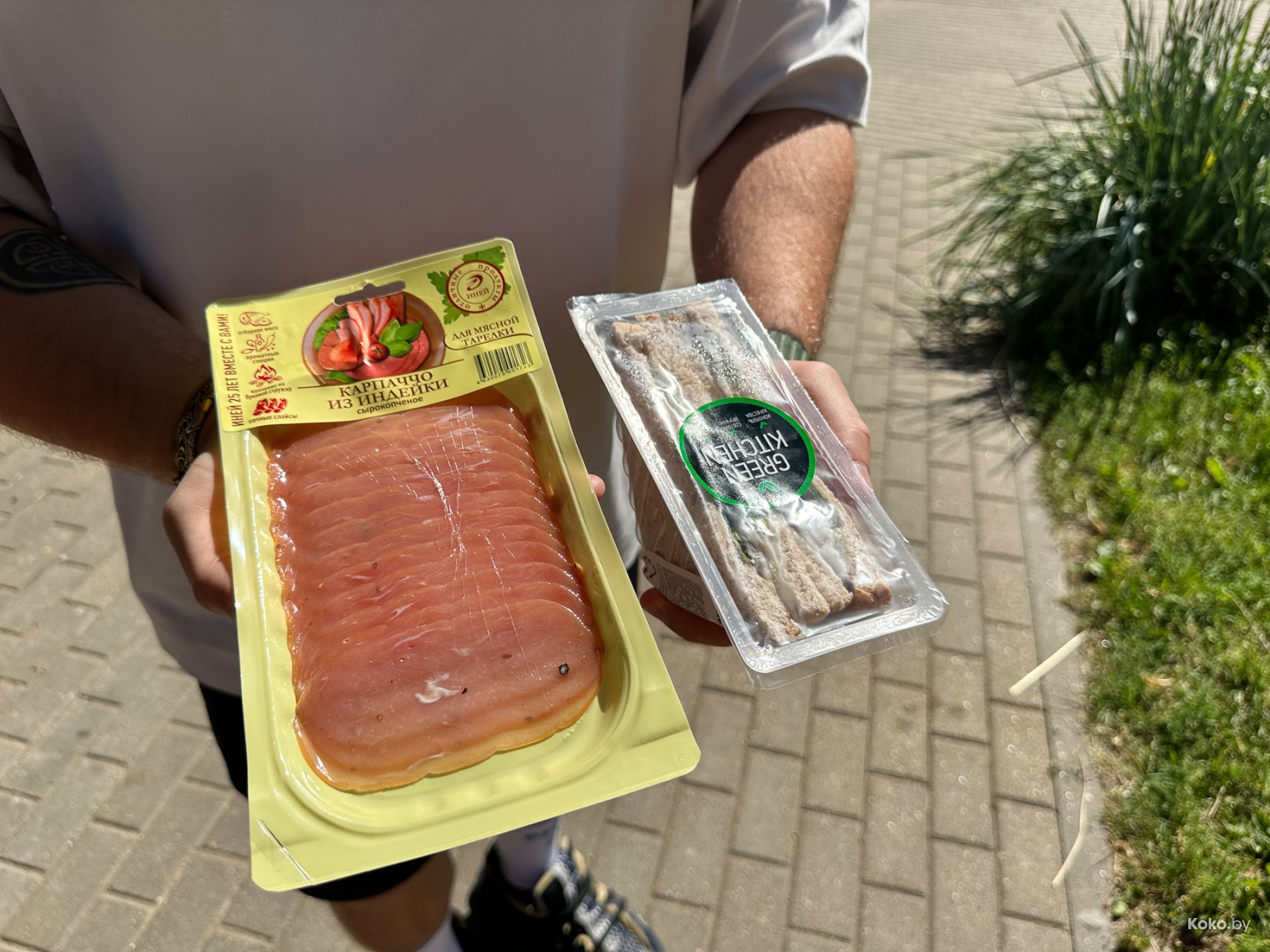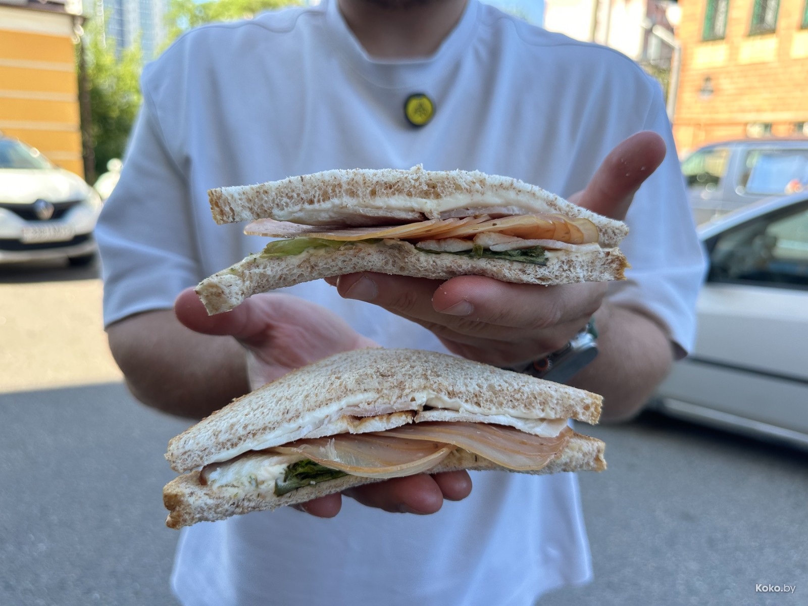 Утром следующего дня в «Короне» собрали два бутера на лучшем хлебе с семечками из «Дражина» и мраморной индюшачей ветчины. Получилось 12р за два вкуснейших сэндвича на 9 кокобаев.