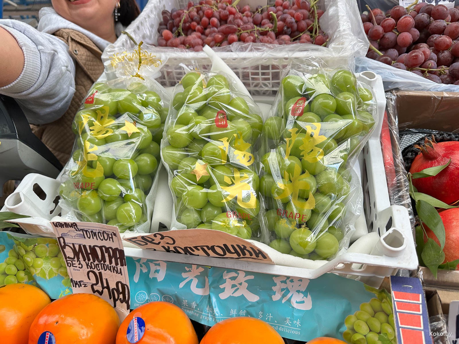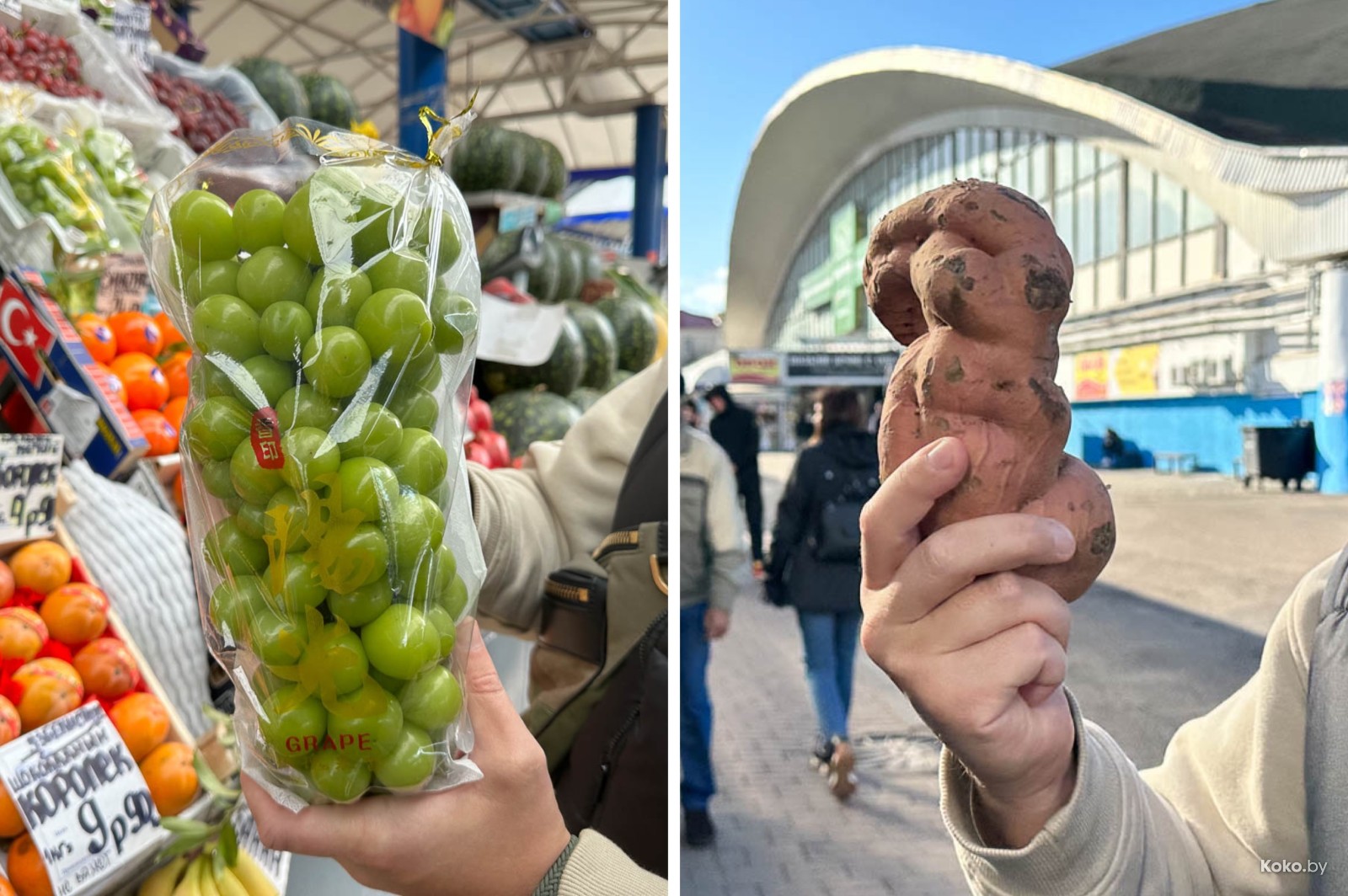 Получив наводку от комаровской бабы Раи, мы оперативно отправились на овощные ряды. И действительно, кто бы мог подумать, что белорусский батат, он же сладкий картофель, растёт на наших огородах, и не только вырос, но ещё и в четырнадцати сортах. Кроме этого, завезли, как с картинки изумрудный, размером с мячик для гольфа виноград из Поднебесной. За бататом только с грядки советую поторопиться, его мало, а следующий сезон с прилётом грачей.