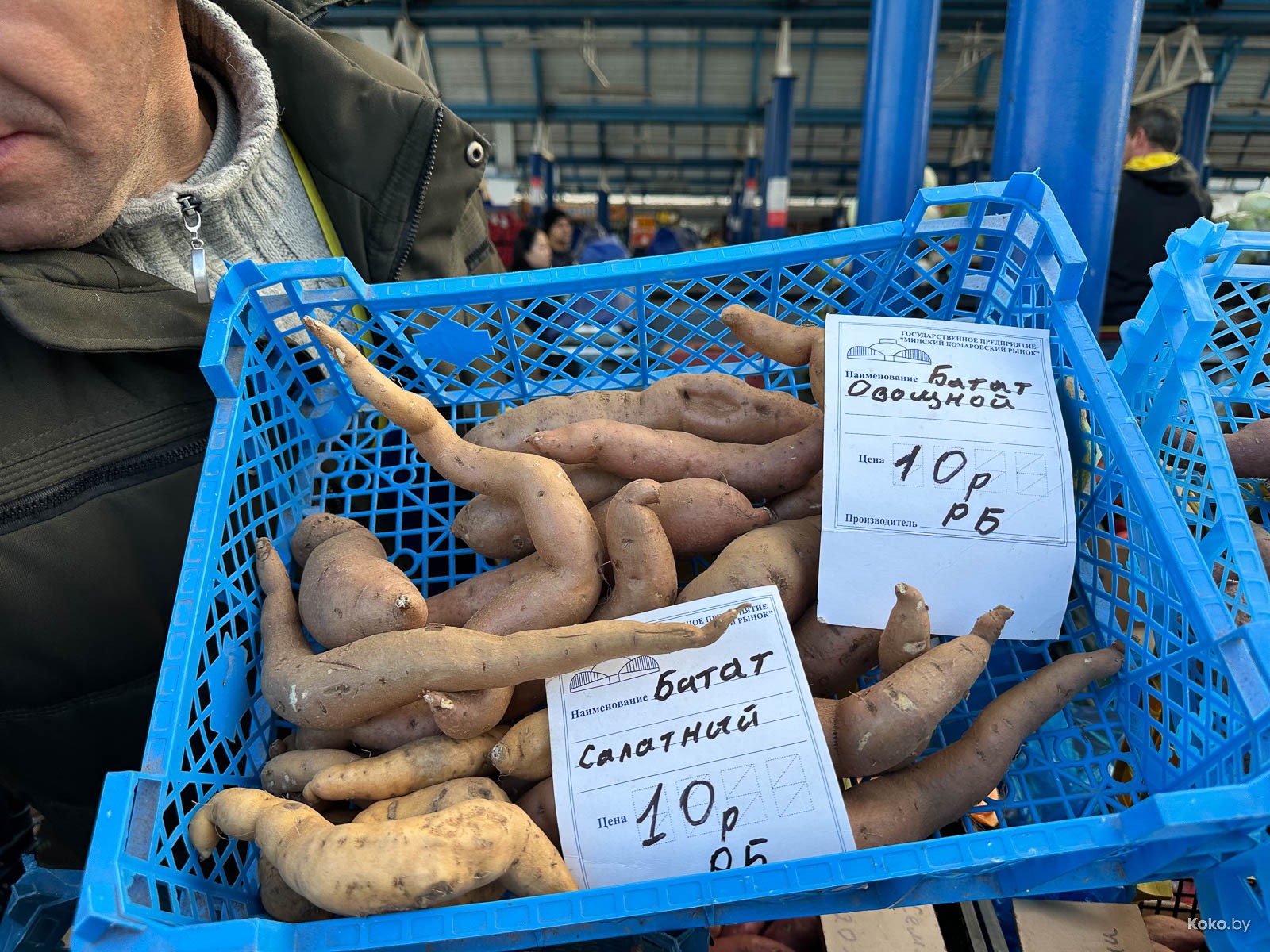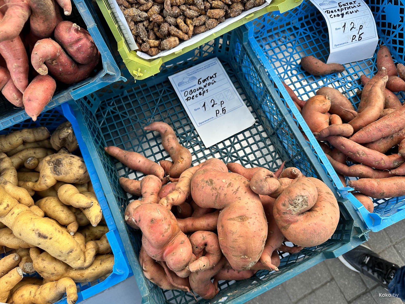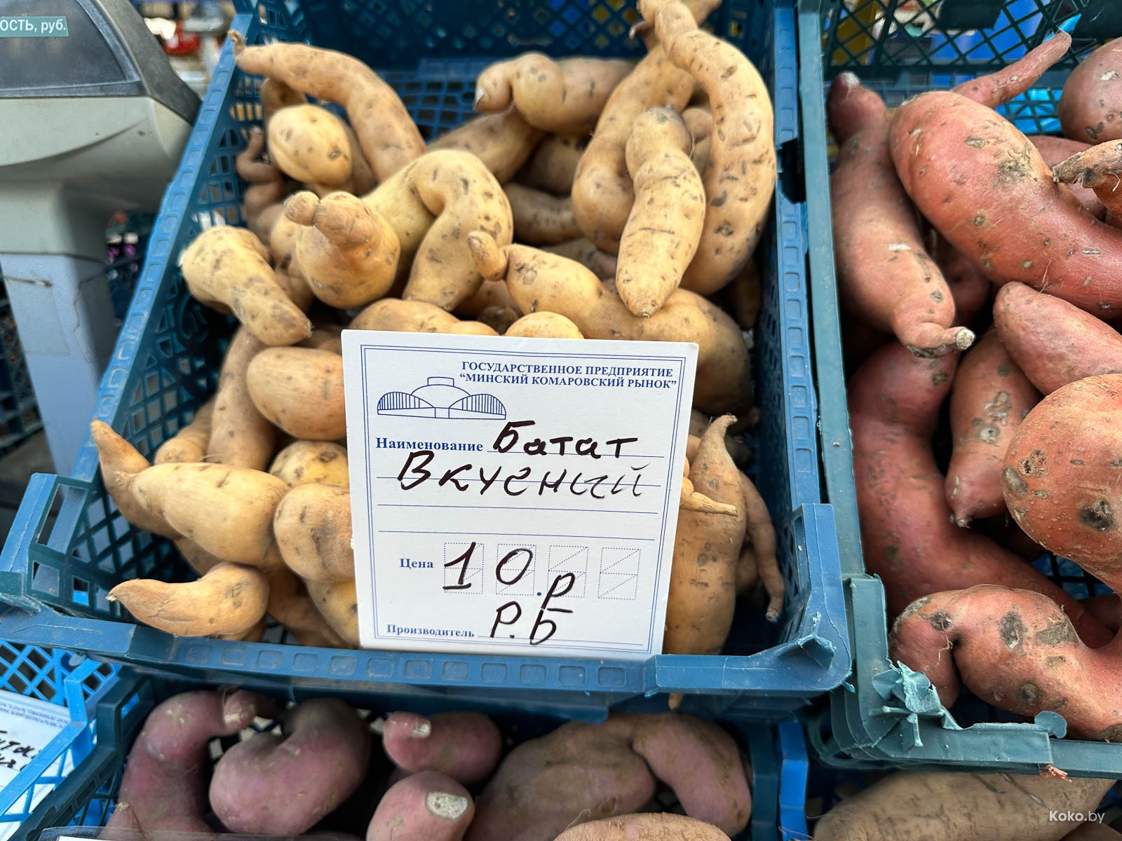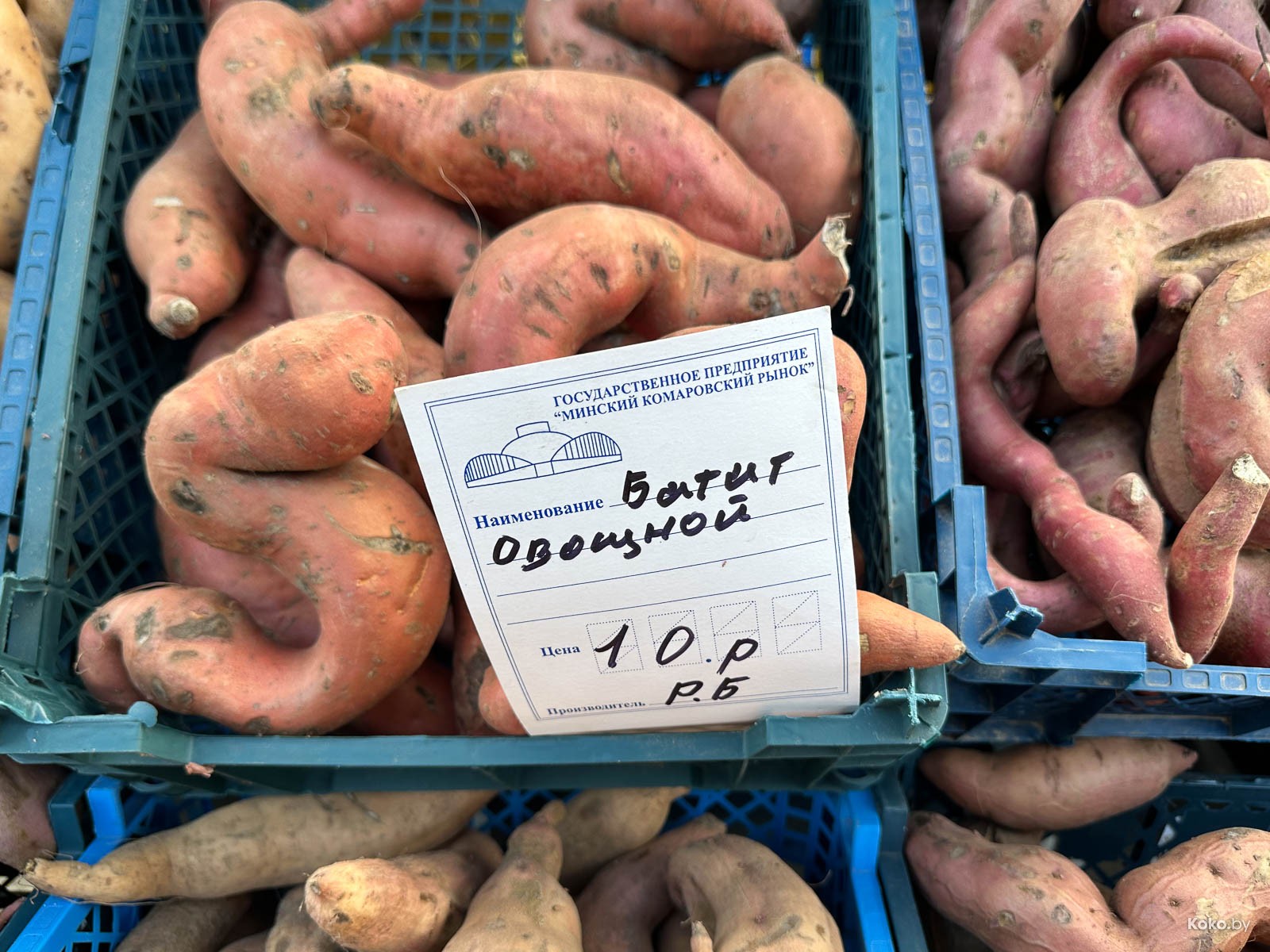 Нашли залежи батата на открытом овощном рынке, первый ряд, ориентир - жёлтая будка с кофе. Выглядит белорусский батат, как Мандрагора Гарри Поттера, цена вопроса от 10 до 12р за кг.