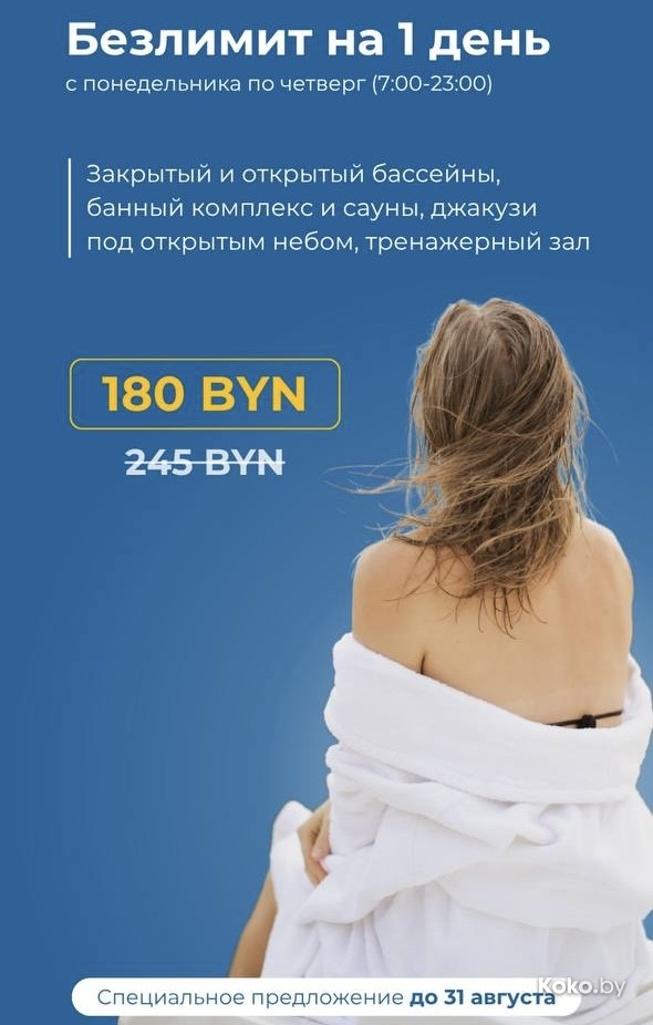 По будням до 31 августа безлимит в СПА 180р вместо 245р.