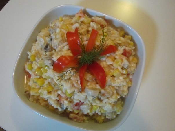 Вареный , обжаренные до готовности, кукуруза, варенные шампиньоны, вареные яйца, мелко нарезанные, соус ( сметана, , сыр на мелкой терке, чеснок два зубчика пропущенные через чесночницу, укроп, соль, черный по вкусу).
