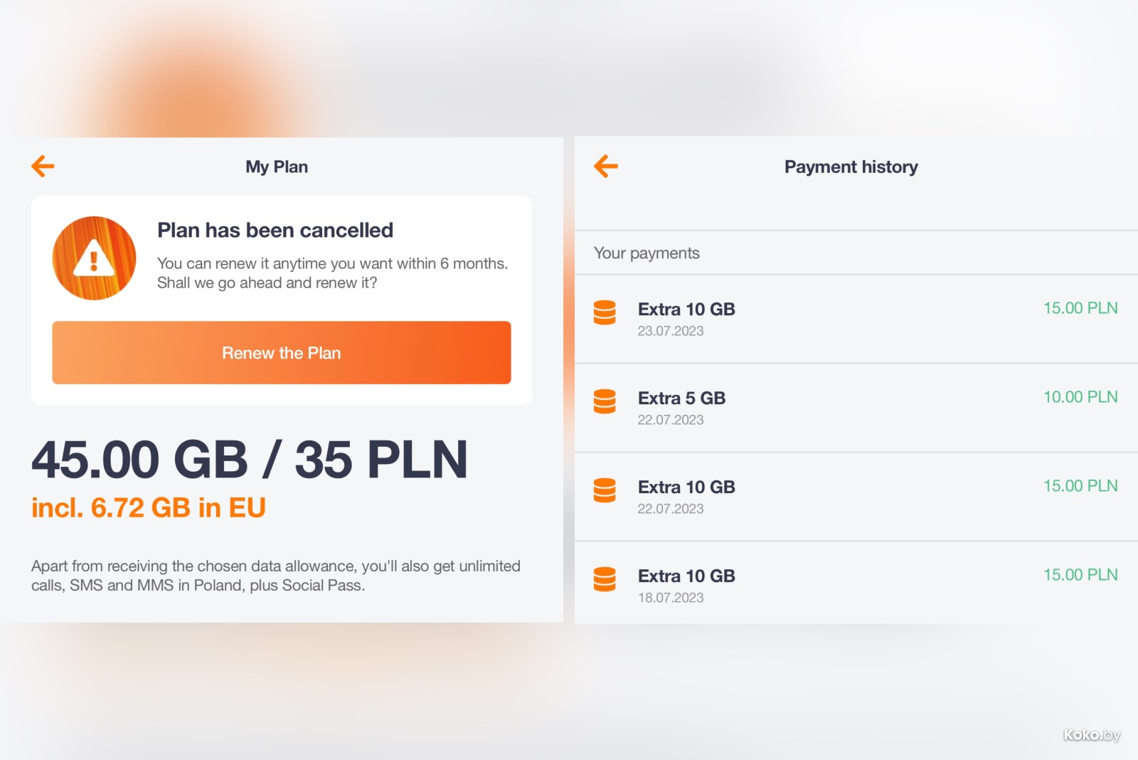 По приезде обязательно отключите в мобильном приложении план, иначе каждый месяц будут списывать по 35 злотых/22byn.