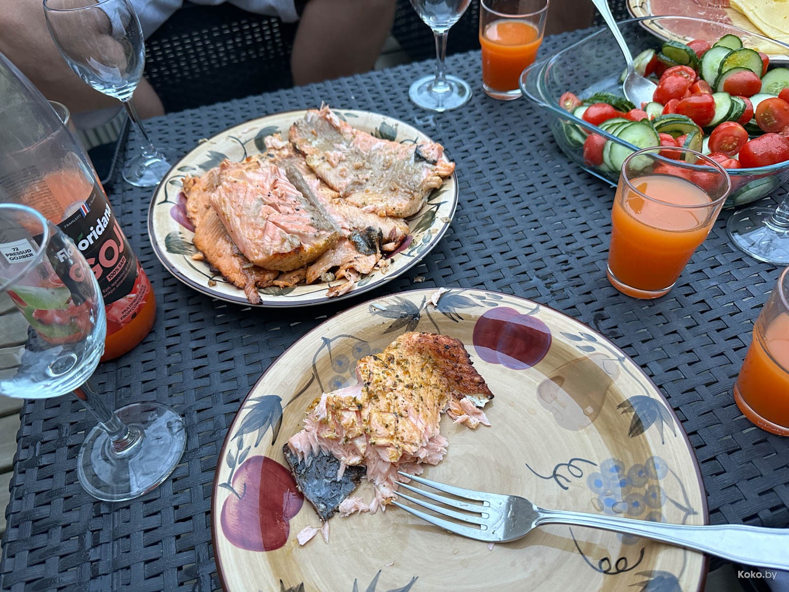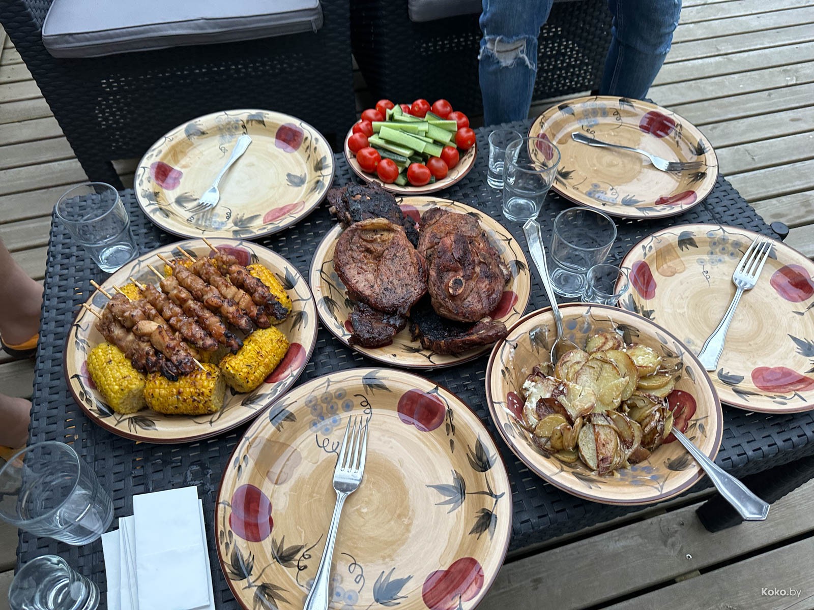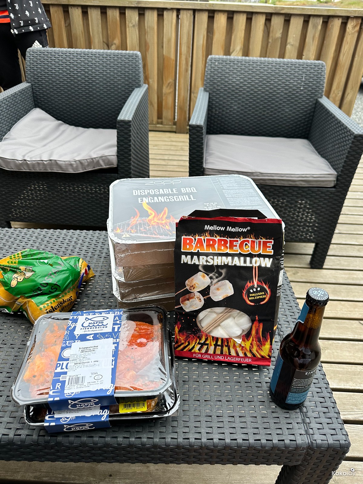 Пример ужина: одноразовый саморазжигающийся гриль за 3 евро, 400 гр лосося, замаринованного в травах с 30% скидкой - 12,25 евро (3 пачки), 1 кг молодой картошки - 3,8 евро, коробка томатов черри - 4,22 евро. Примерно по 15 евро с человека. Из дьютика на столе Егермейстер.