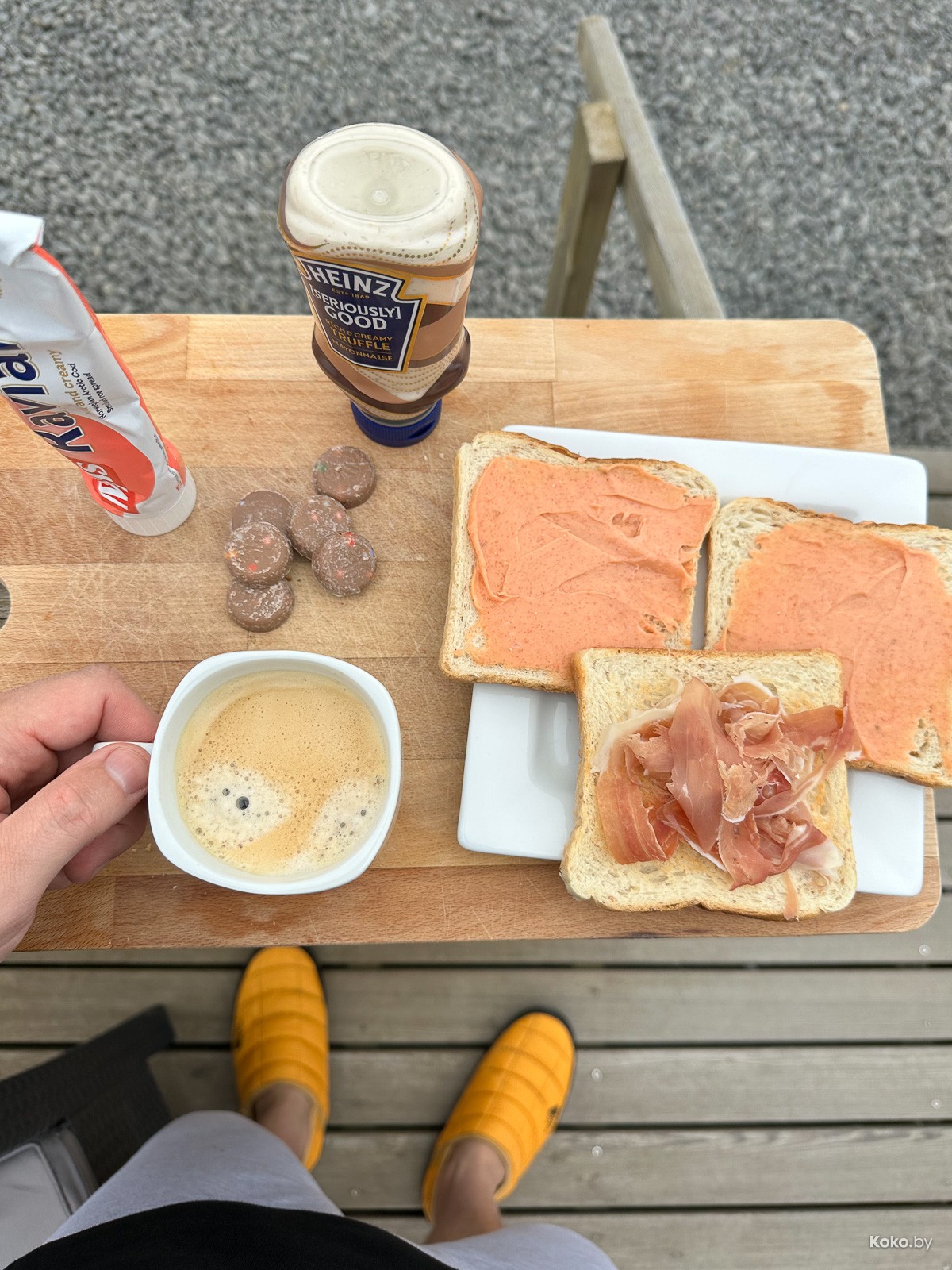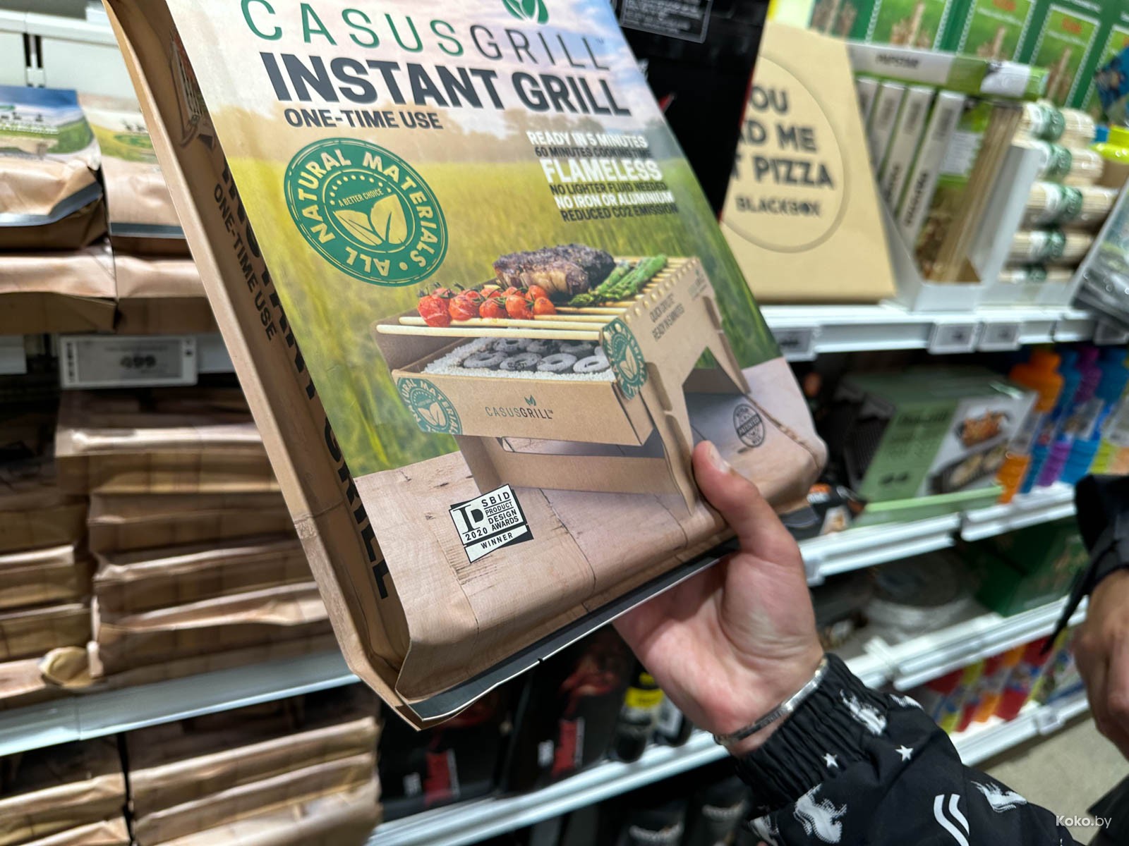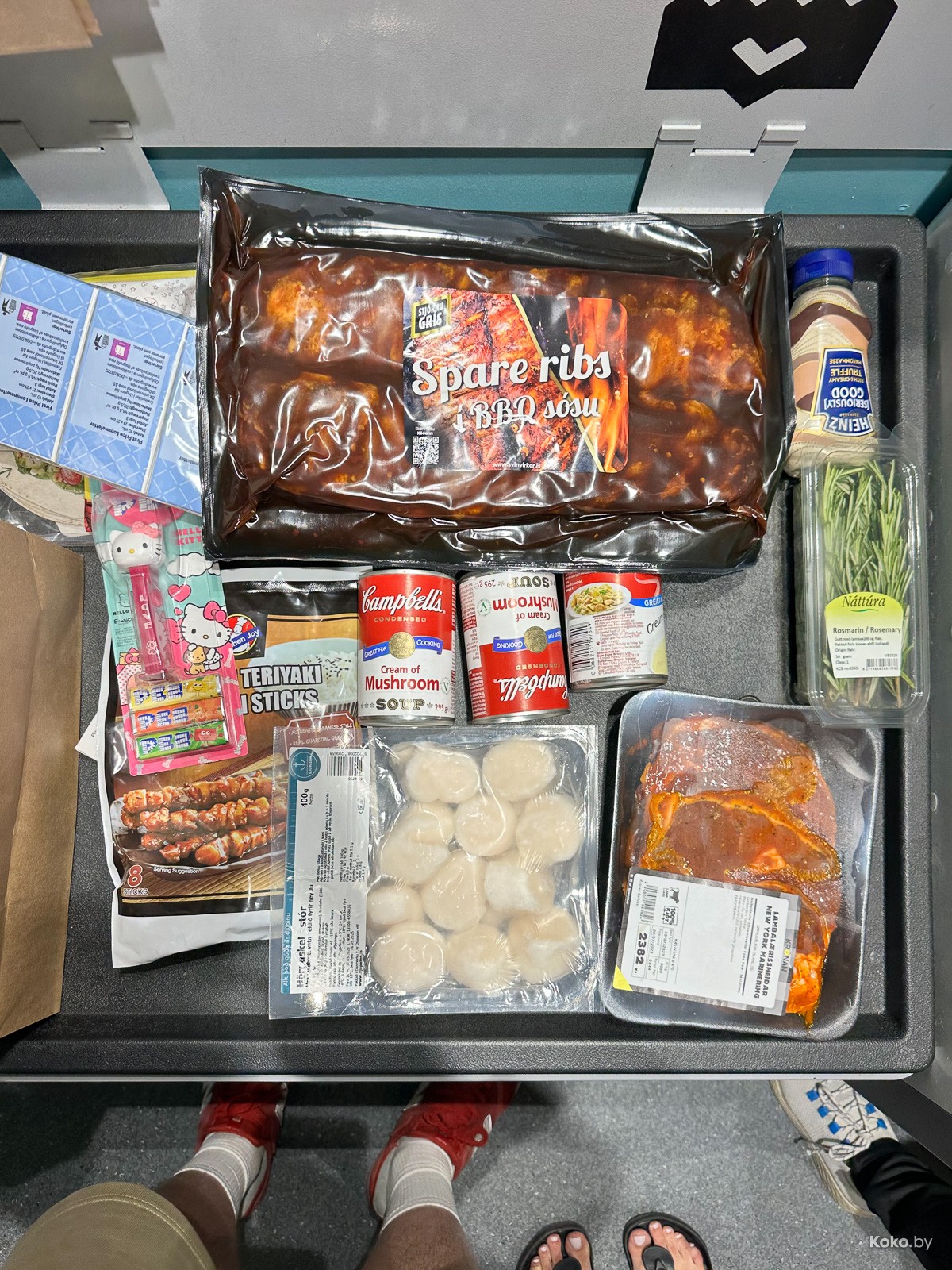 Пример ужина: одноразовый саморазжигающийся гриль за 3 евро, 400 гр лосося, замаринованного в травах с 30% скидкой - 12,25 евро (3 пачки), 1 кг молодой картошки - 3,8 евро, коробка томатов черри - 4,22 евро. Примерно по 15 евро с человека. Из дьютика на столе Егермейстер.