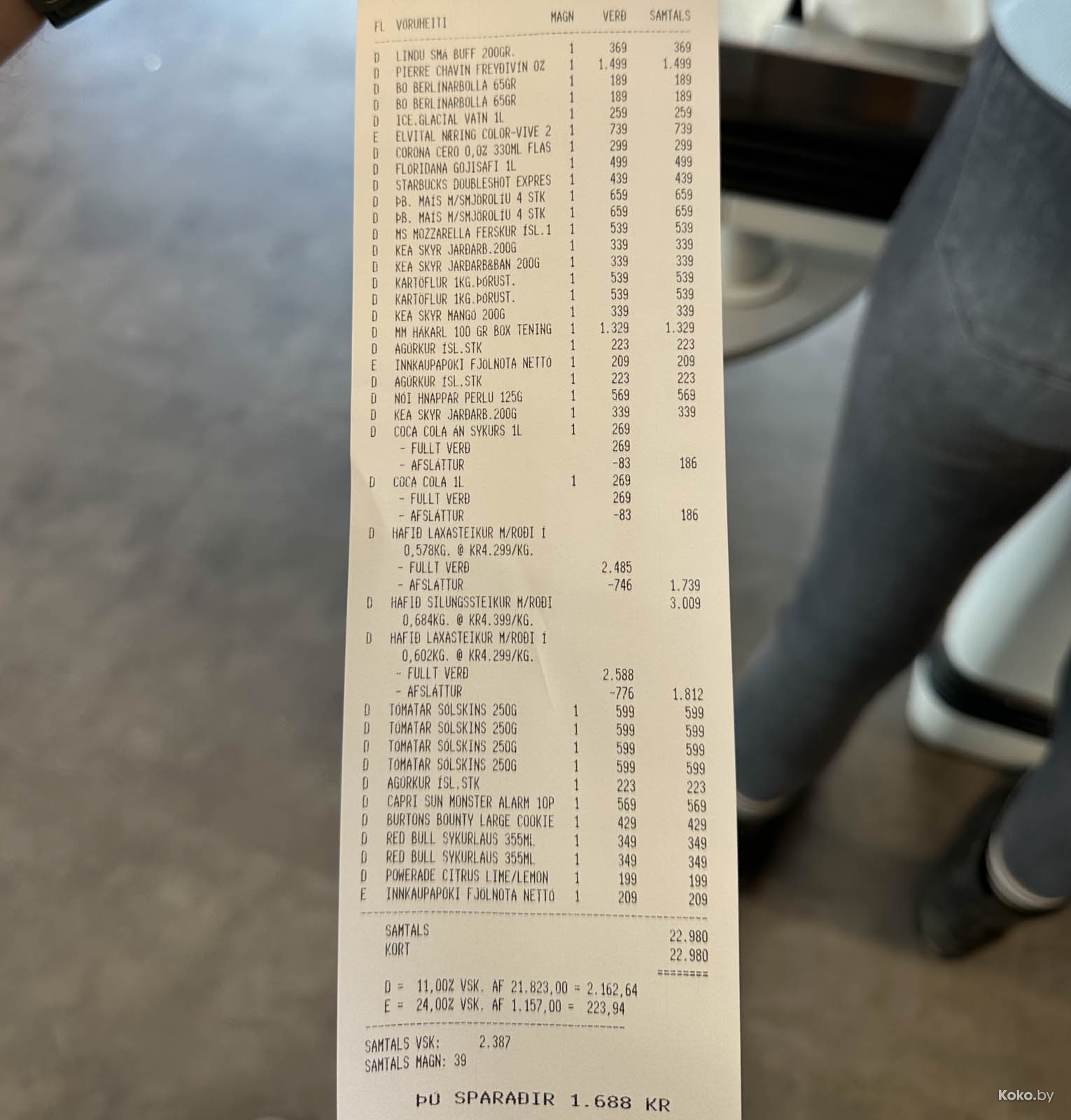 ИТОГО: тур в Исландию без еды на 3-их - 3900 евро, перелёты (один чемодан до 25 кг, всем увеличенные места) и переезды на автобусе - 1640 евро, расходы на питание, кофе, энергетики, походы по местным заведениям, набить тату и сувениры - ещё 1800 евро на всех. Сэкономить можно только на перелёте и питании, если брать сэндвичами по 5 евро из магазина и готовить дома на мангале, то тур получится дешевле.