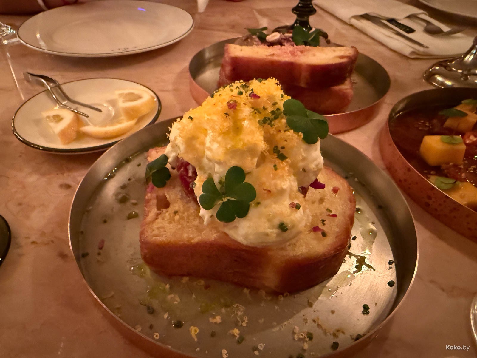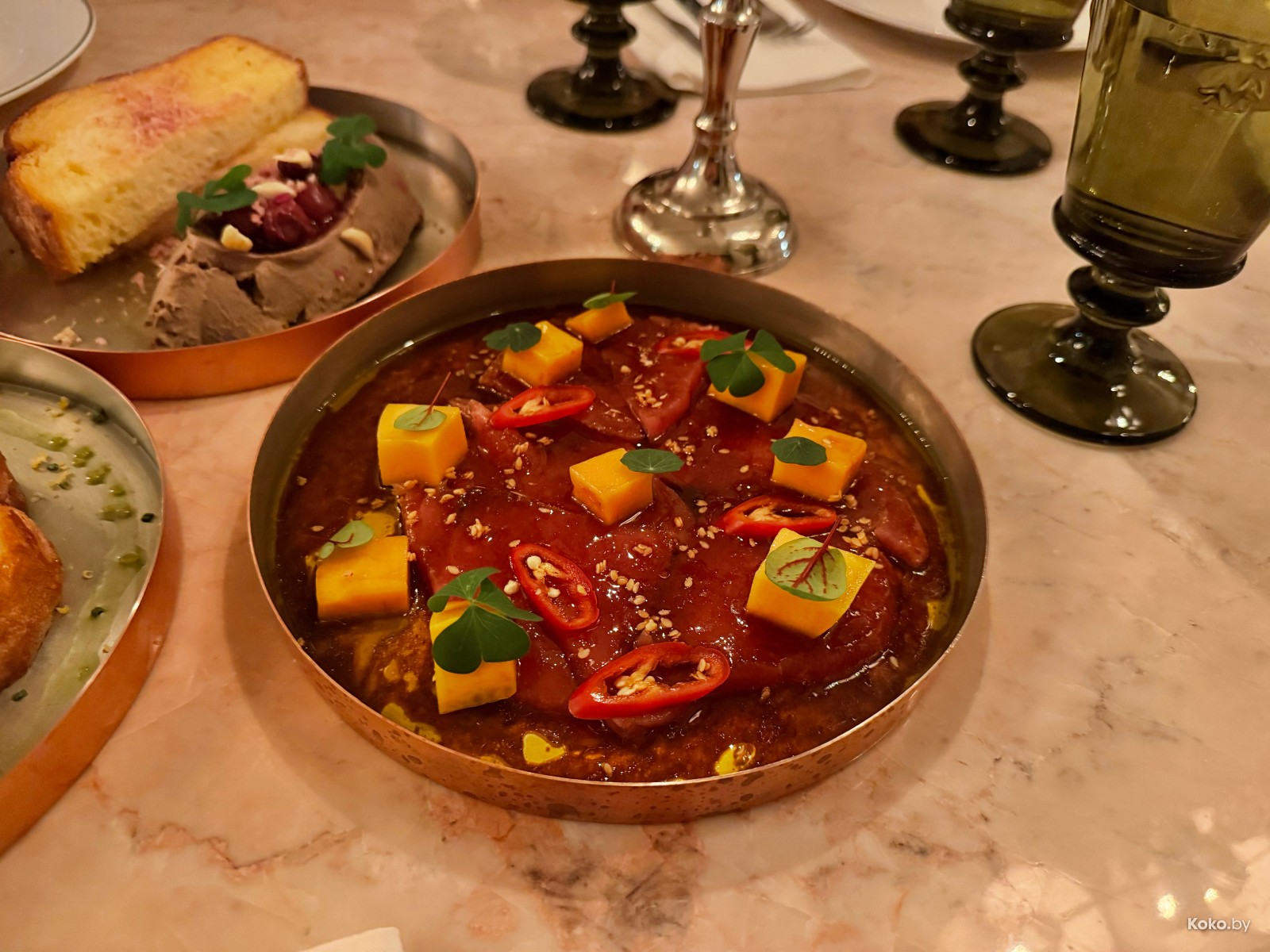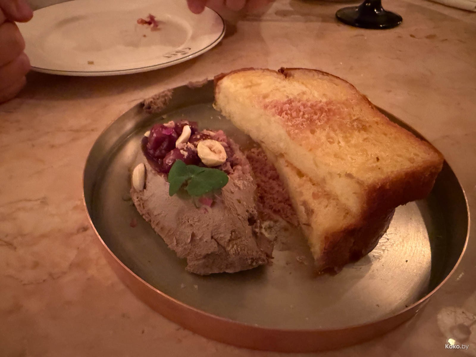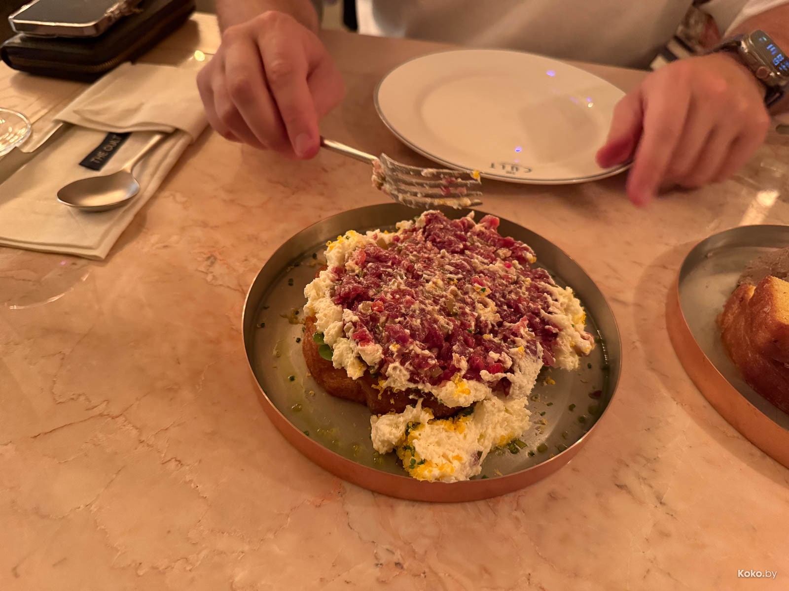 2. Тартар из свежей говядины на бриоши под трюфельным муссом за 35р. Хлеб сухой, нарубленное мясо зачем-то скатали в колобка, заправка резкая, никто не осилил доесть. Не нужно усложнять простое блюдо.