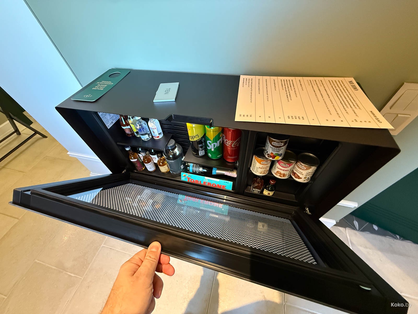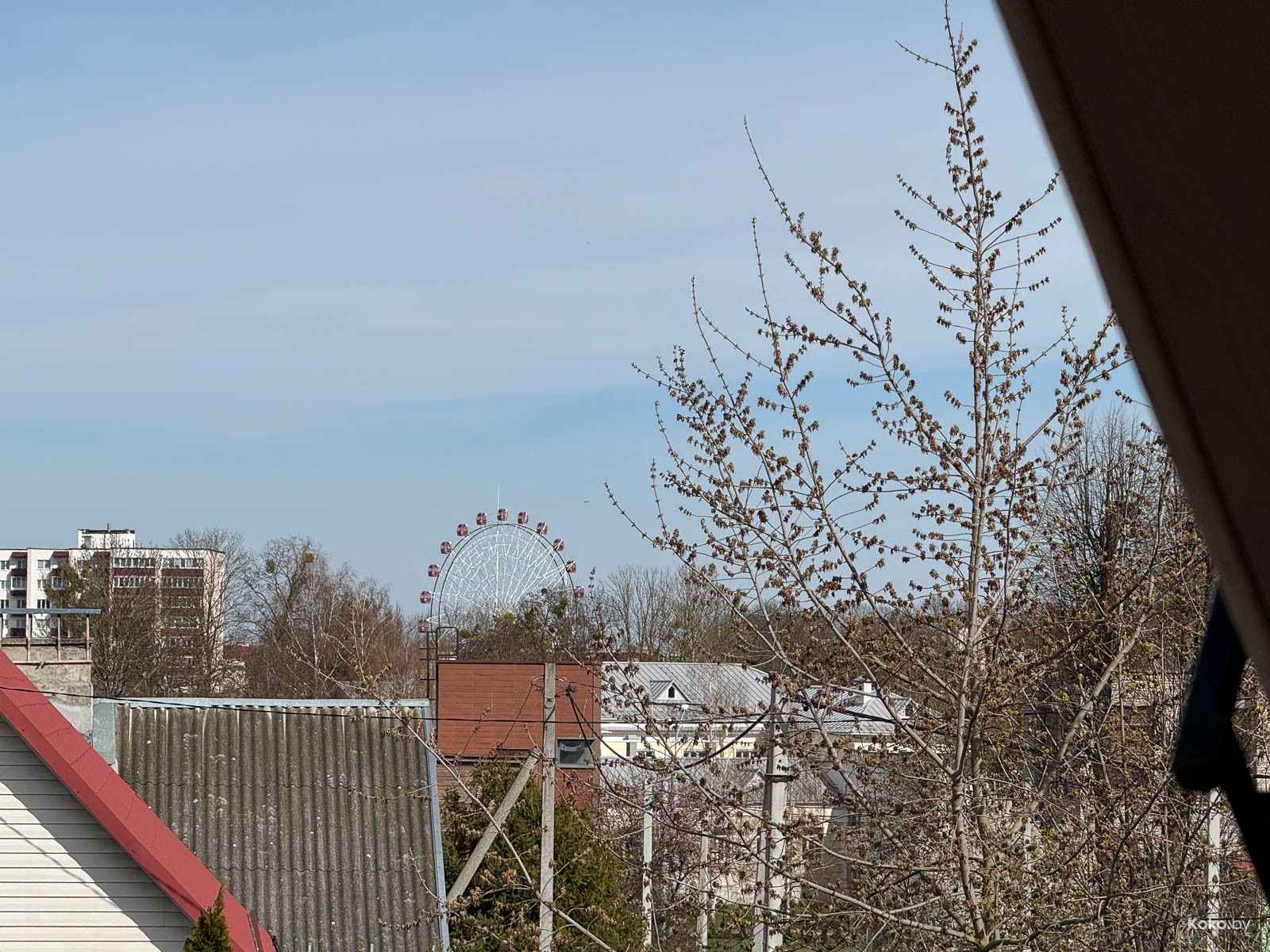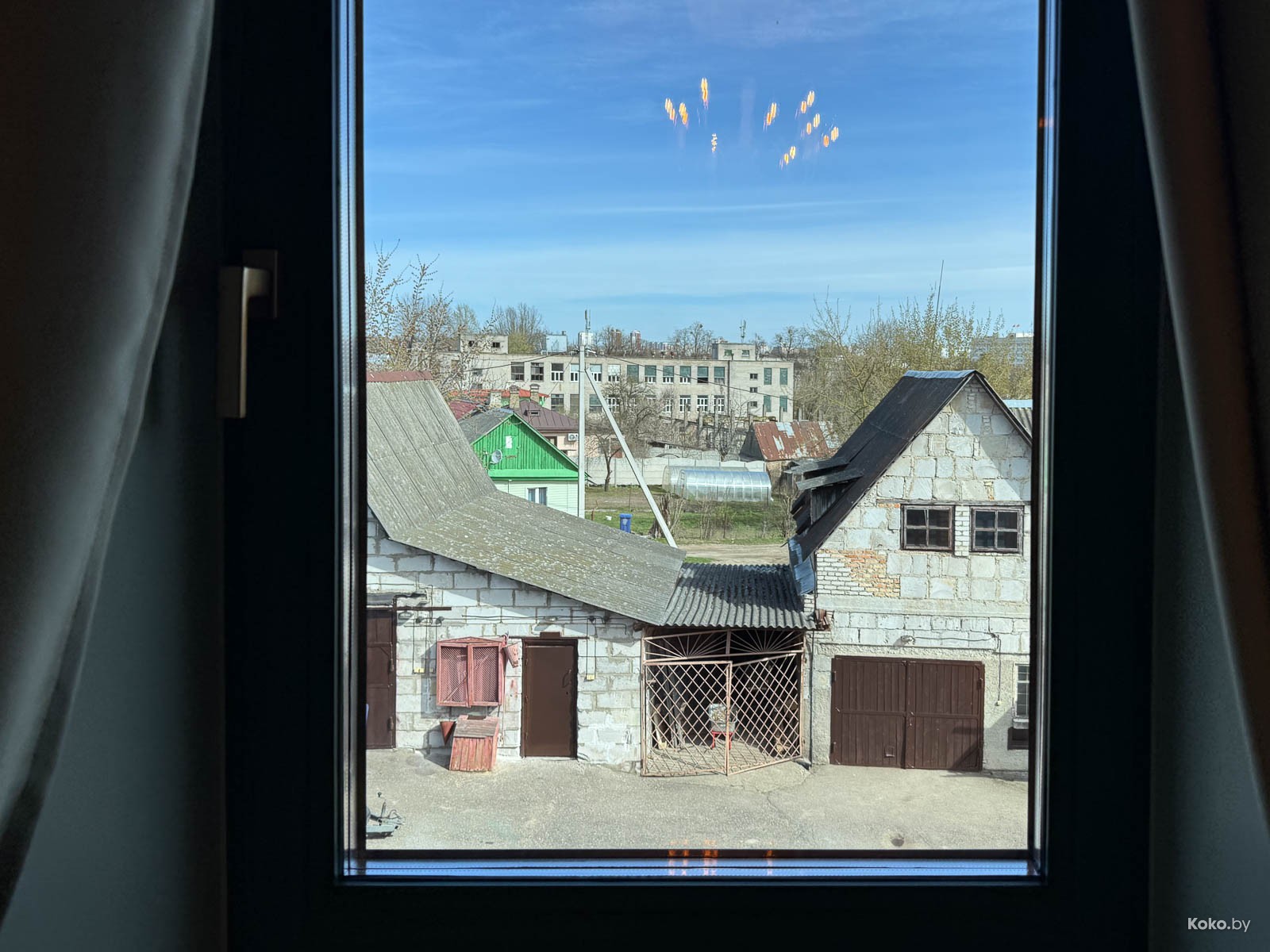 Узкая лестница привела нас на третий этаж под крышу. Номер просторный, свой мини-бар за деньги, шкафы, большая кровать, балкон с деревенским видом на частный сектор, в ванной на полке Дайсон.
