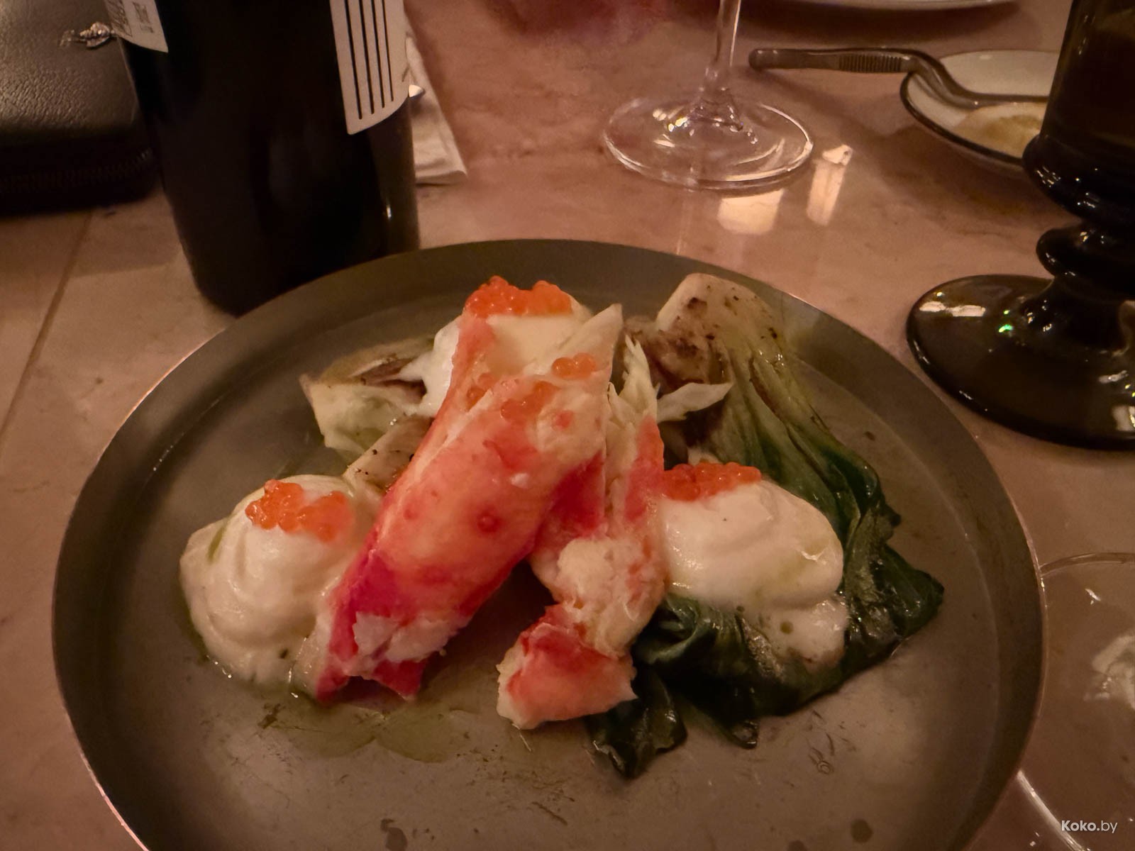 1. Быстрее всего приготовили фалангу краба на капусте пак чой в соусе шампань за 65р. Тёплое мясо краба идеально сочетается с чем угодно, вкусная комбинация, но что за странный выбор посуды под деликатес.