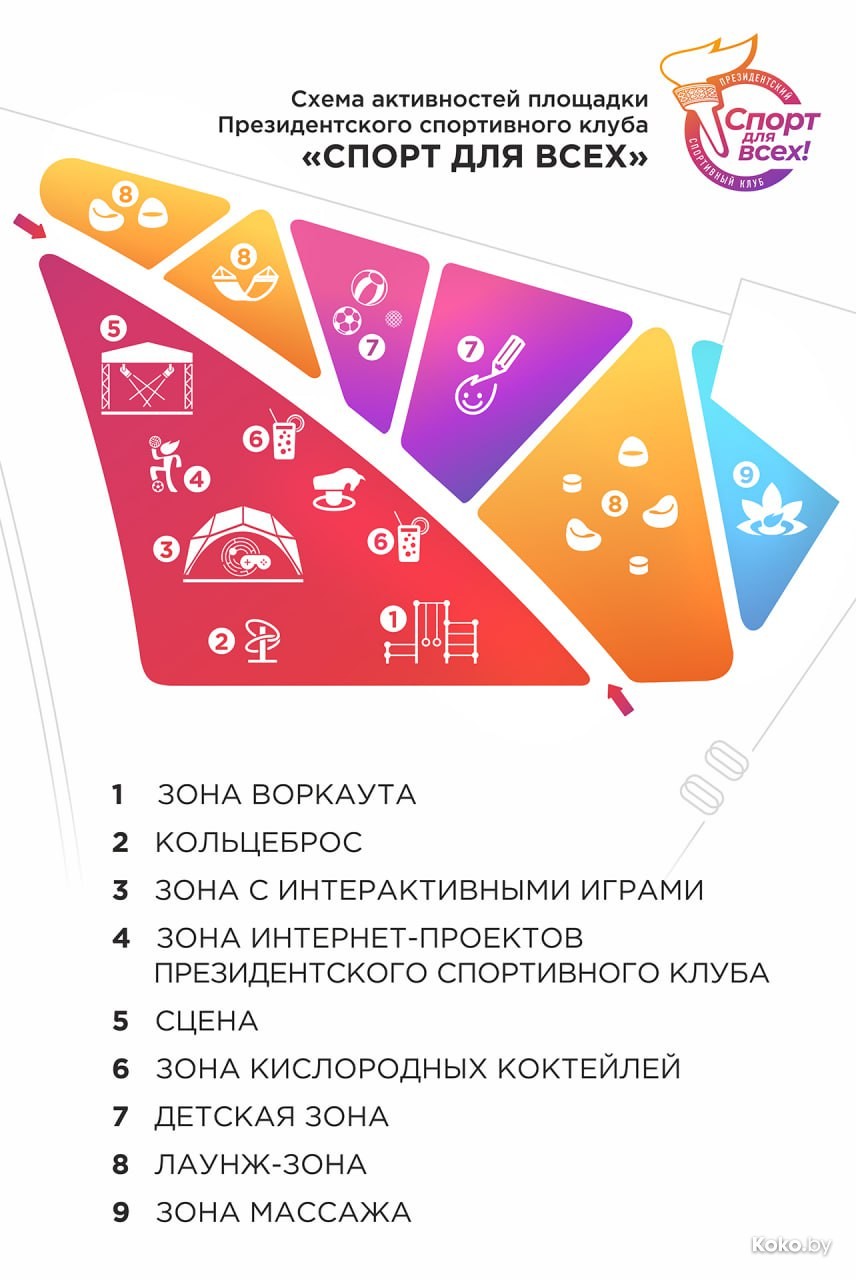 Городское мероприятие пройдёт в рамках Минского полумарафона Президентского спортивного клуба, где представят свою спортивно-развлекательную площадку под лозунгом «Спорт для всех». По традиции будут интересные конкурсы с призами, активности, зоны отдыха для самых маленьких, холодные кислородные коктейли, для участников забега организован профессиональный массаж. Вход - свободный, встретимся 8 сентября в сквере на стадионе «Динамо».