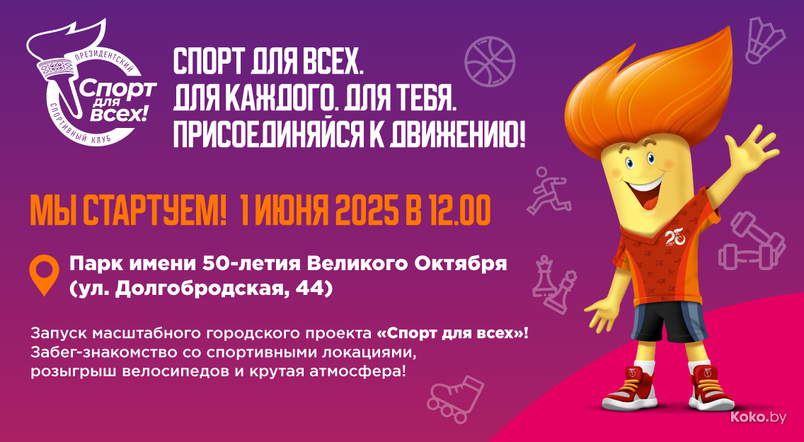 Занимайтесь любимым спортом бесплатно в удобное время с командой профессиональных тренеров на пяти специально оборудованных локациях по Минску. С 1 июня и всё лето в городе организуют спортивные площадки для всех желающих в рамках масштабного городского проекта «Спорт для всех» в прямом смысле этого выражения. Более 80 активностей на всех площадках на любой вкус и уровень подготовки плюс розыгрыш 20 велосипедов.