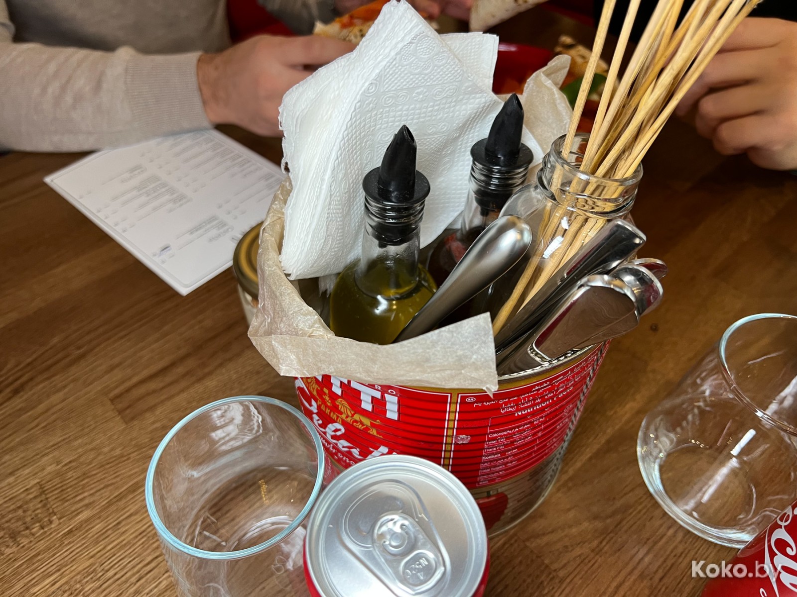 Мы пришли, когда пицца уже лежала на столе. Помещение уютное, с высокими потолками и минимальными вложениями денег, вентиляция воздух сосёт исправно, запах ни палёных дров ни обугленного теста рецепторы не раздражает. Миленько обыграли подставку для приборов и масла, банки из-под помидоров получили вторую жизнь.