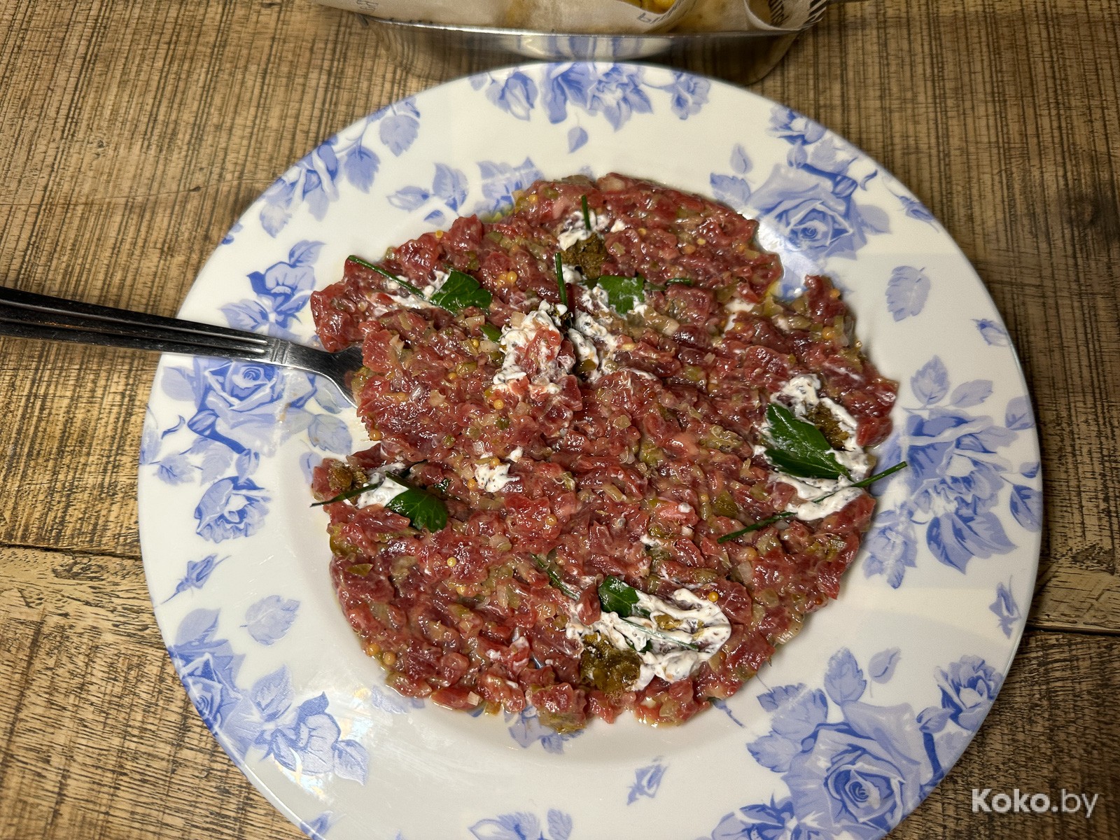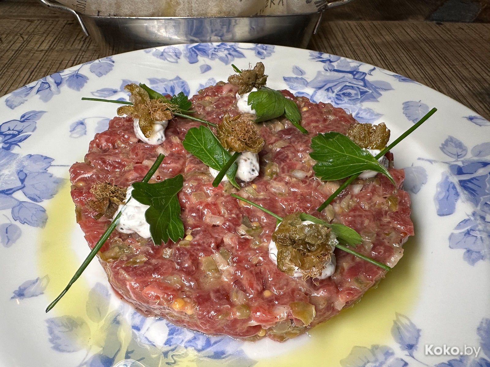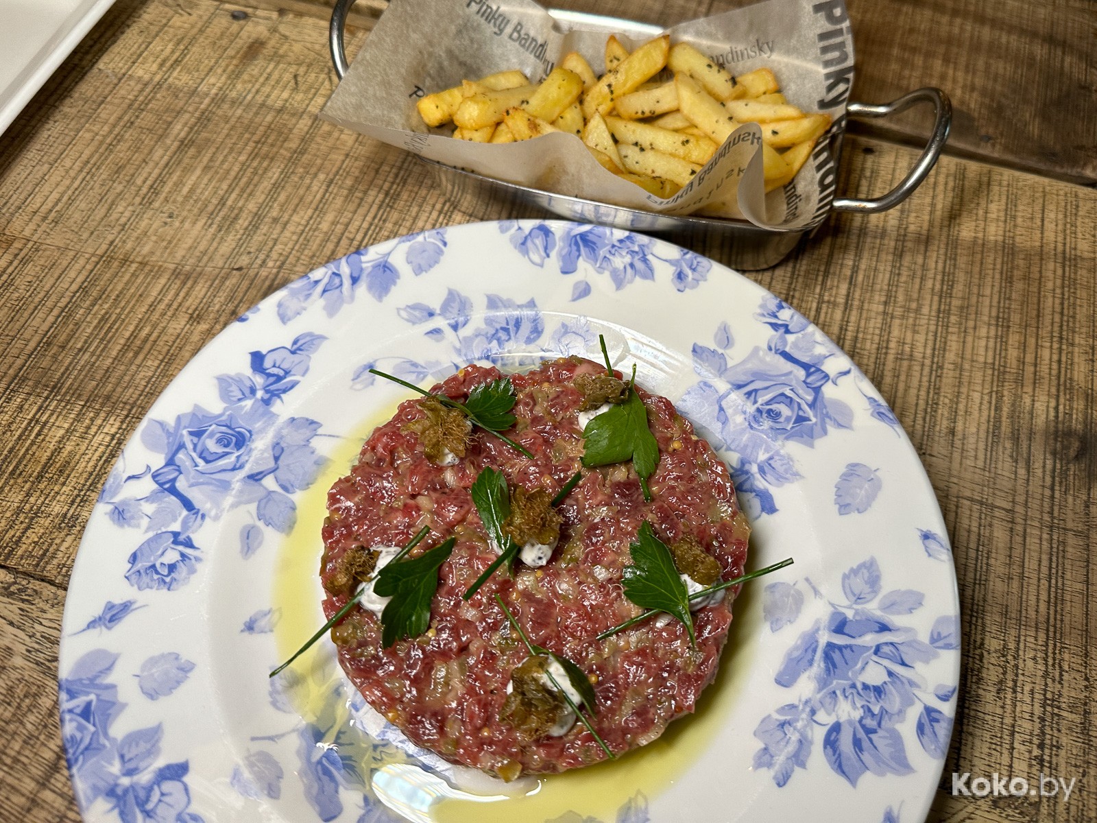 3. Написано, что тартар весит 350г, поэтому 26byn. Выглядит многообещающе много: красивая текстура мяса, сладко-пикантный соус, капли из сливочного сыра, идёт под картошку фри с трюфелем, типа по-французски. Порубили и заправили говядину на 8 кокобаев!