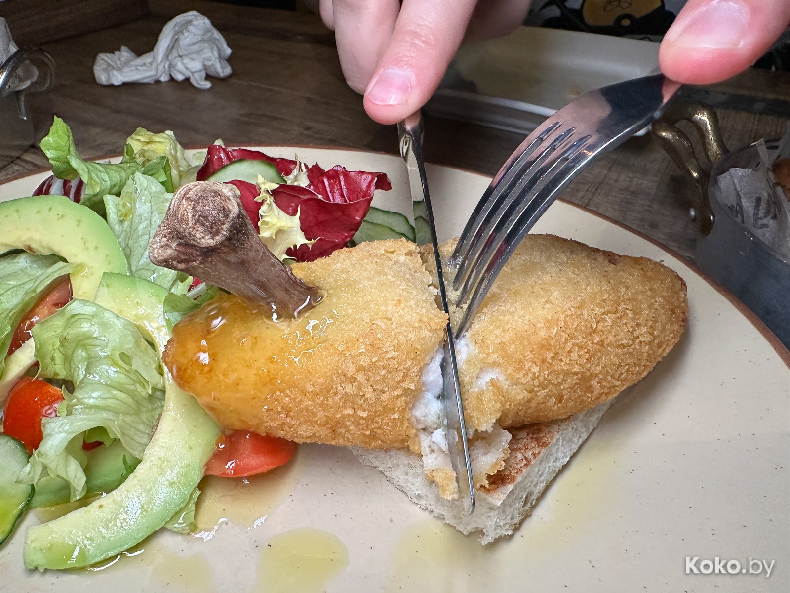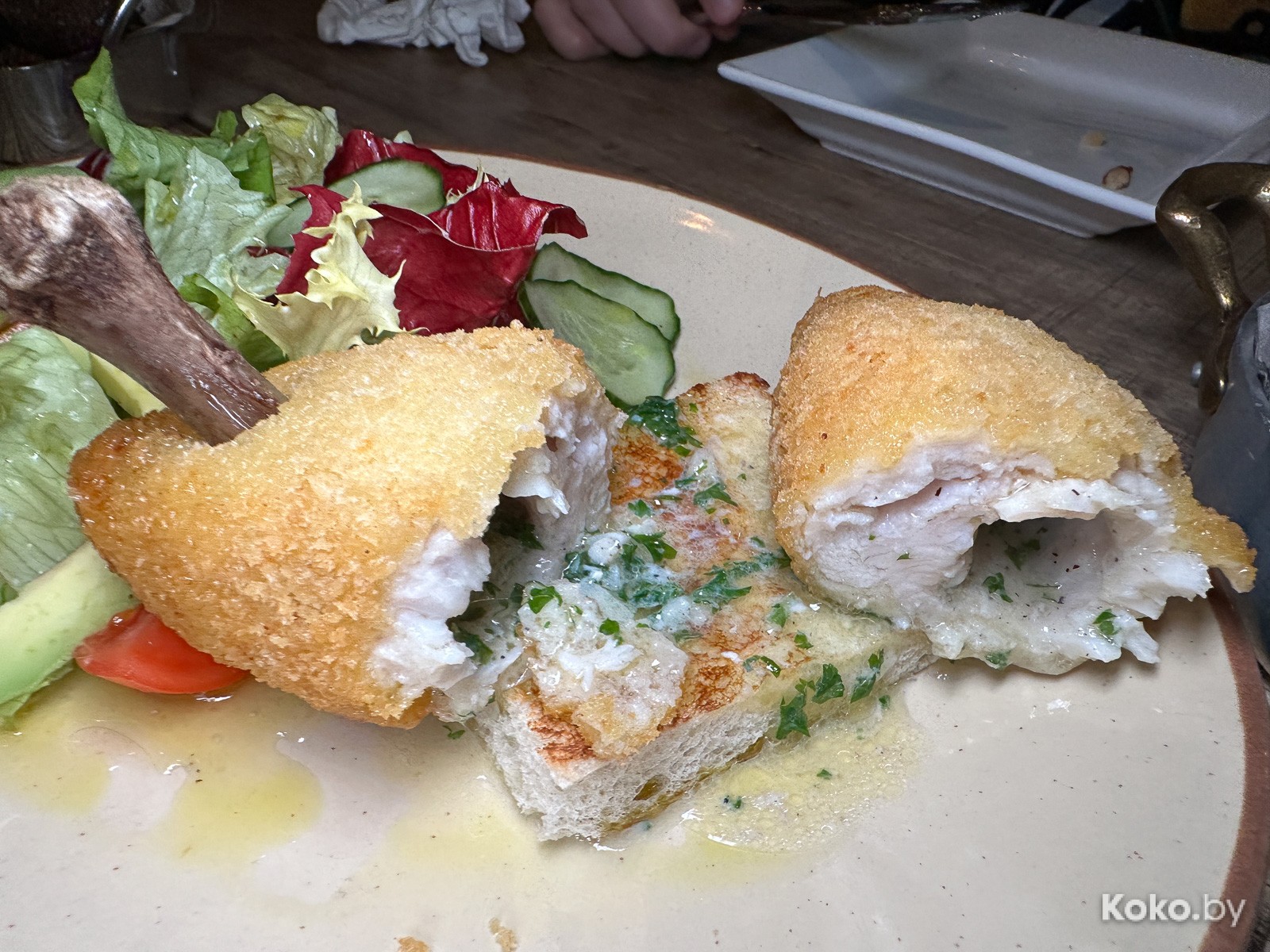 4. Хрустящая котлета по-киевски костью наружу, на белом хлебе, с летним салатом по-буржуйски. Из разреза сразу вытекает горячее сливочное масло с травами. Филе нежное, сочно, подача красиво, но с вас 24byn за жареную курицу. Второй раз всё равно заказал бы.