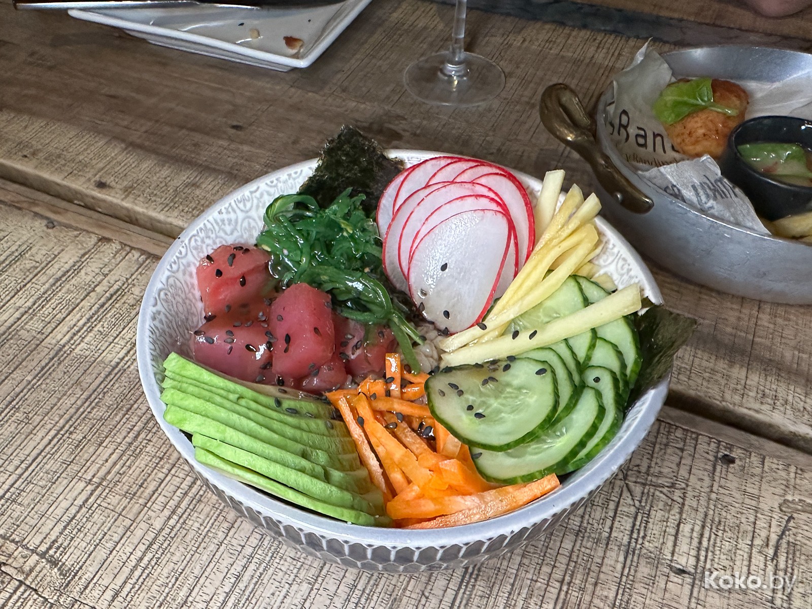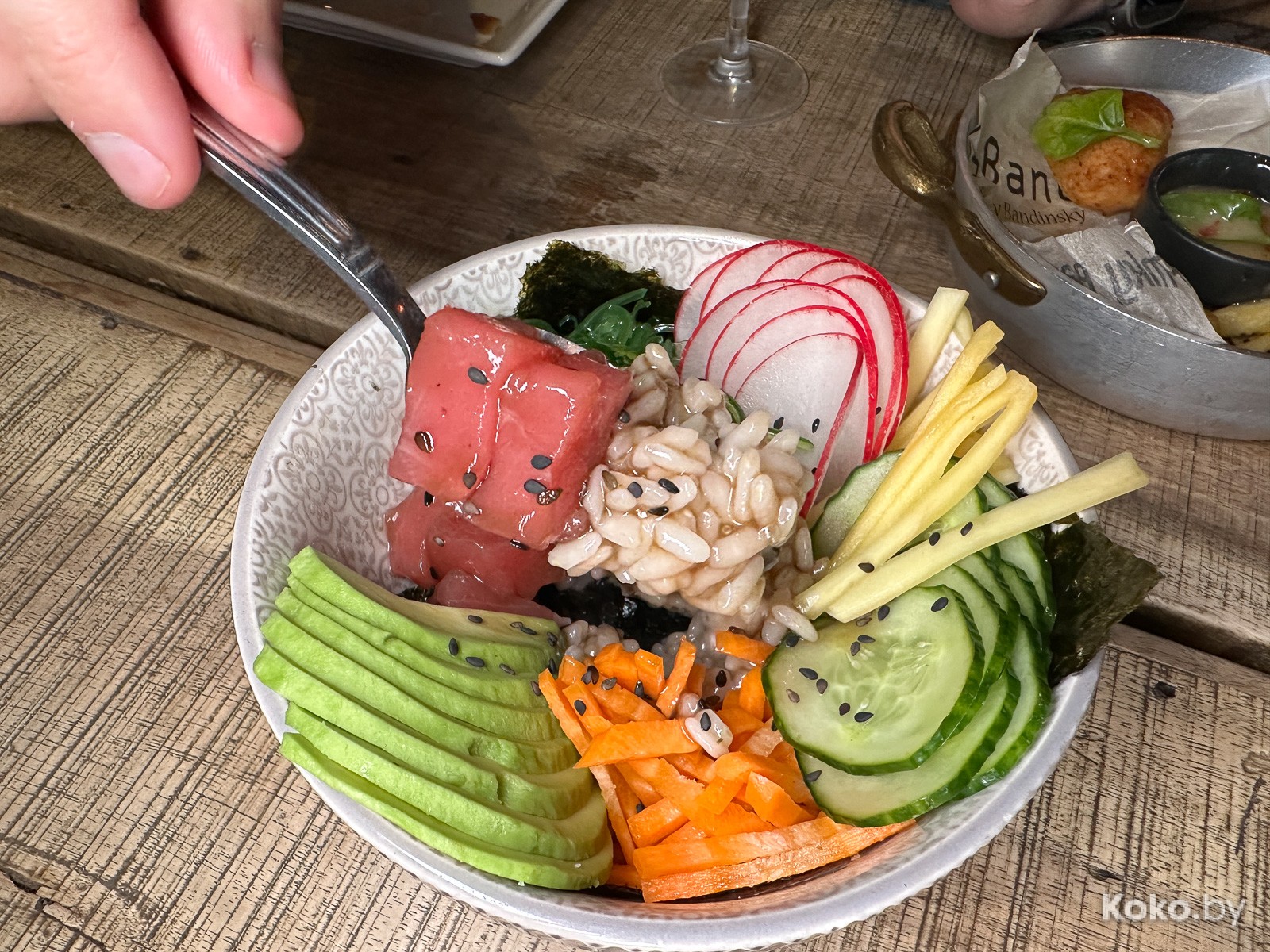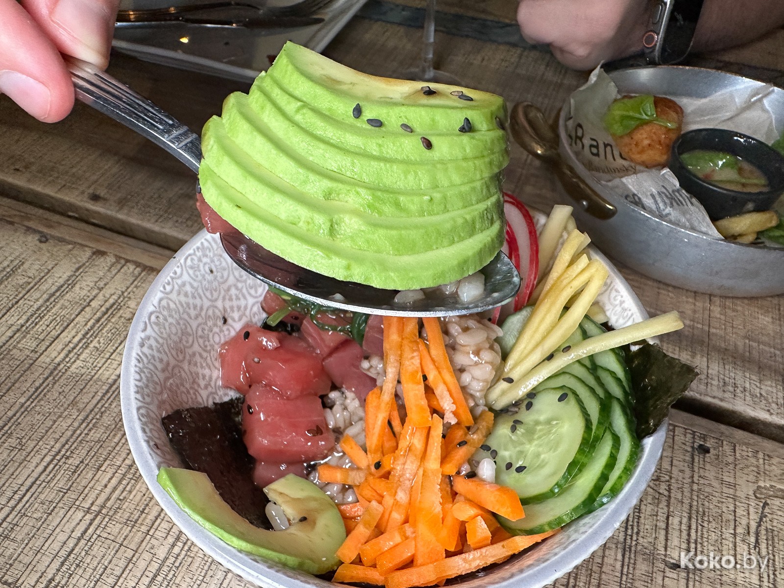 5. Рис в соусе с маринованным тунцом в шести овощах. По бодрой рыбе и авакадо, можно предположить, что за качеством продукта следит строгий дядя, цены ставит тоже он. Попрошу 26byn за суши наружу.