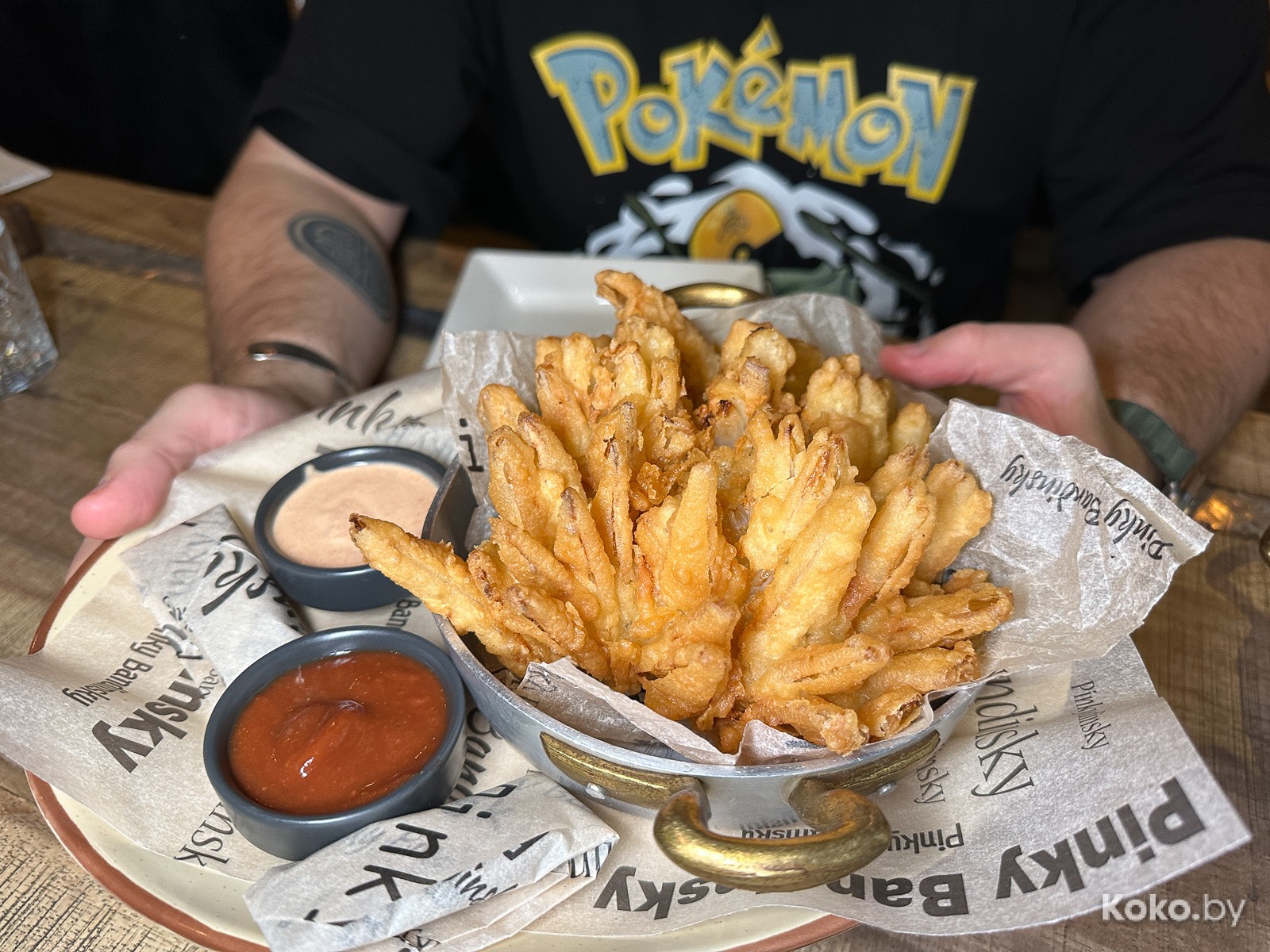 6. Просили по готовности - пожалуйста, вот ваша кувшинка из жареного лука во фритюре, может водочки с пивом к нему желаете? (шутка-мишутка). Хз, где они достали такую здоровенную, сладкую луковицу. Очень похожа на ту, что готовил нам Нусрет в своём ресторане Стамбула.