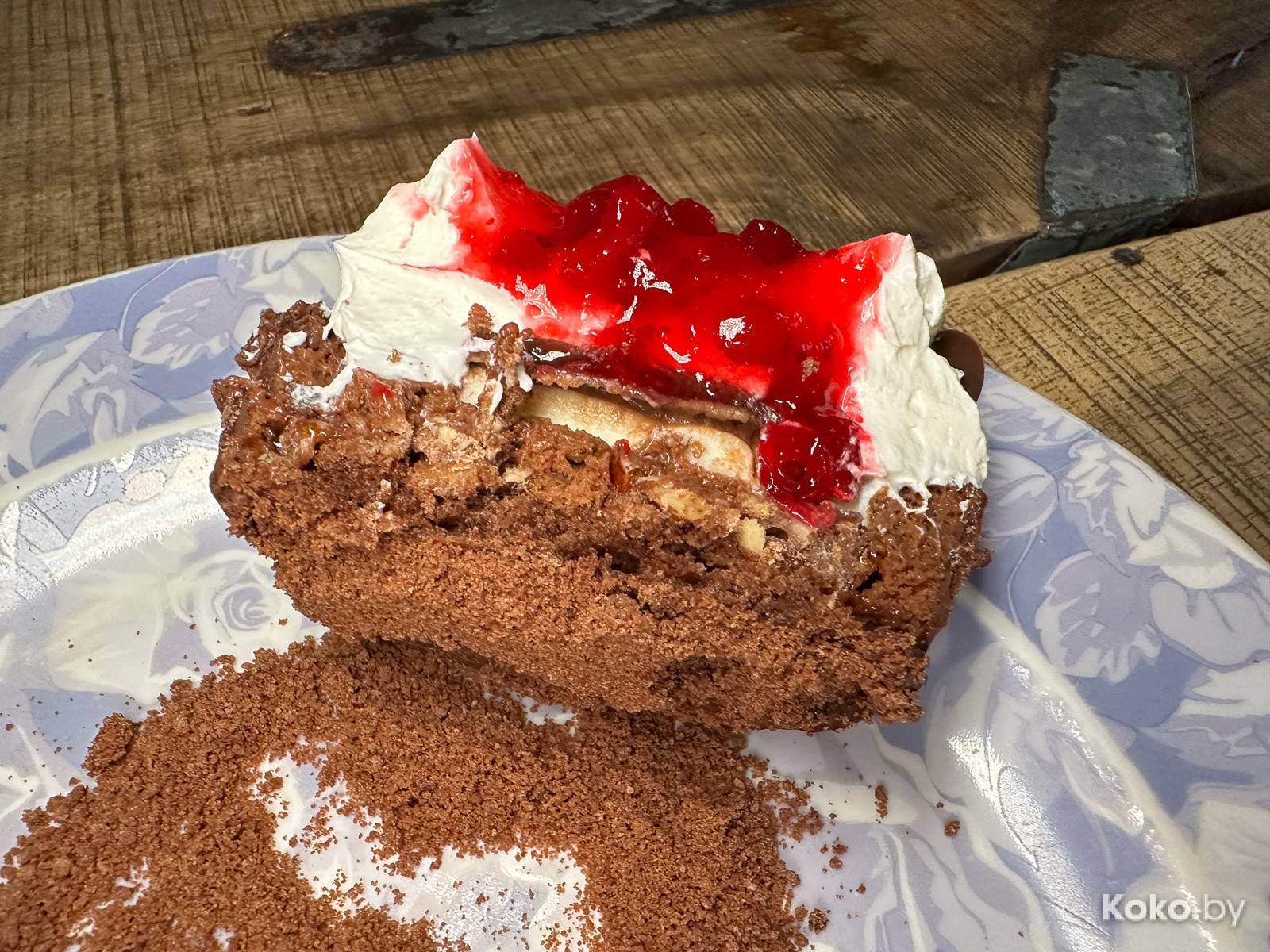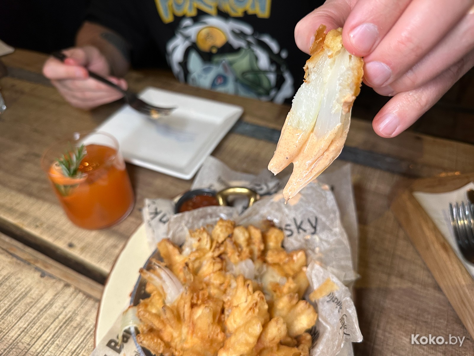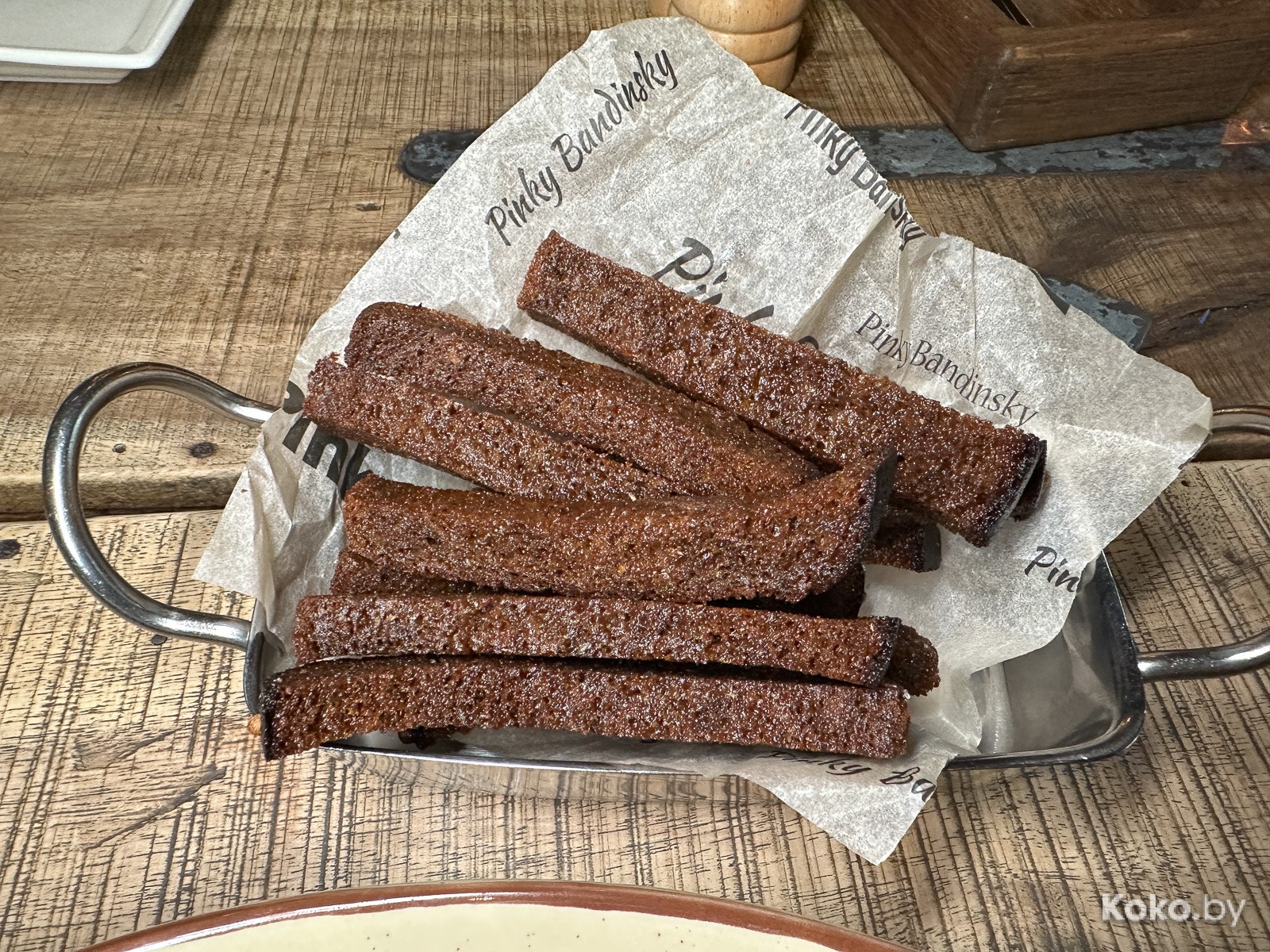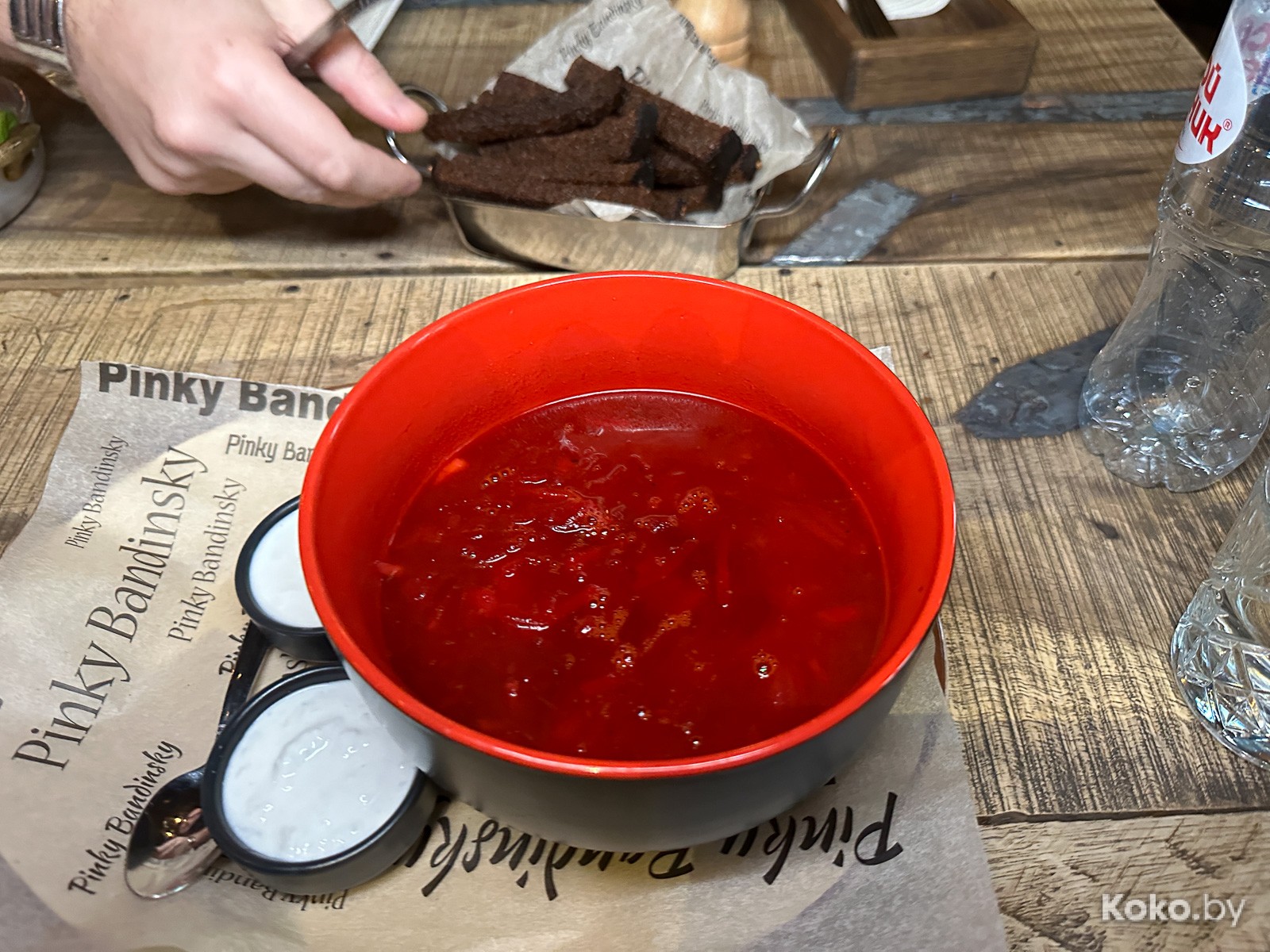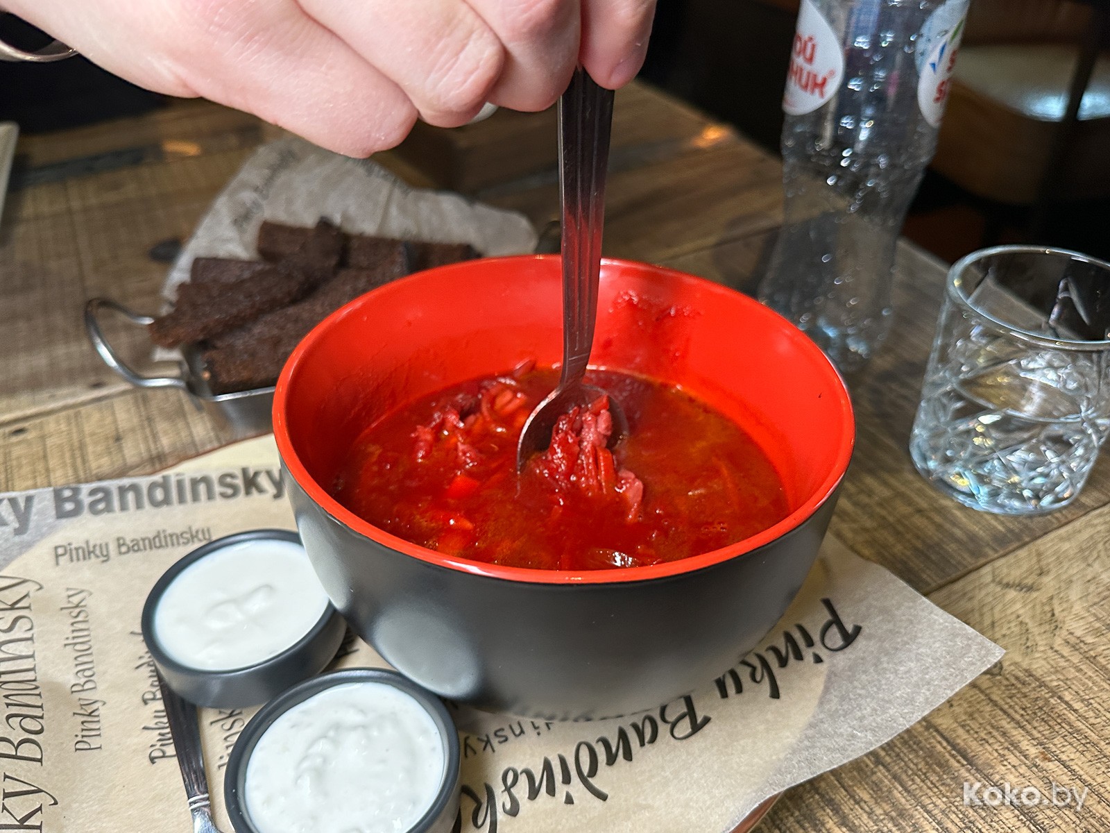 1. Быстрее всего получился не лук во фритюре, его как замученную закуску вынесли до десертов. Пиала борща с элементами мяса за 17byn подаётся с гренками из филейной части чёрного хлеба со сметанным соусом голубой сыр. Шахтёрская порция, мягкий, нежирный, я бы сказал, овощной бульон, по балансу выровняли кислое со сладким.