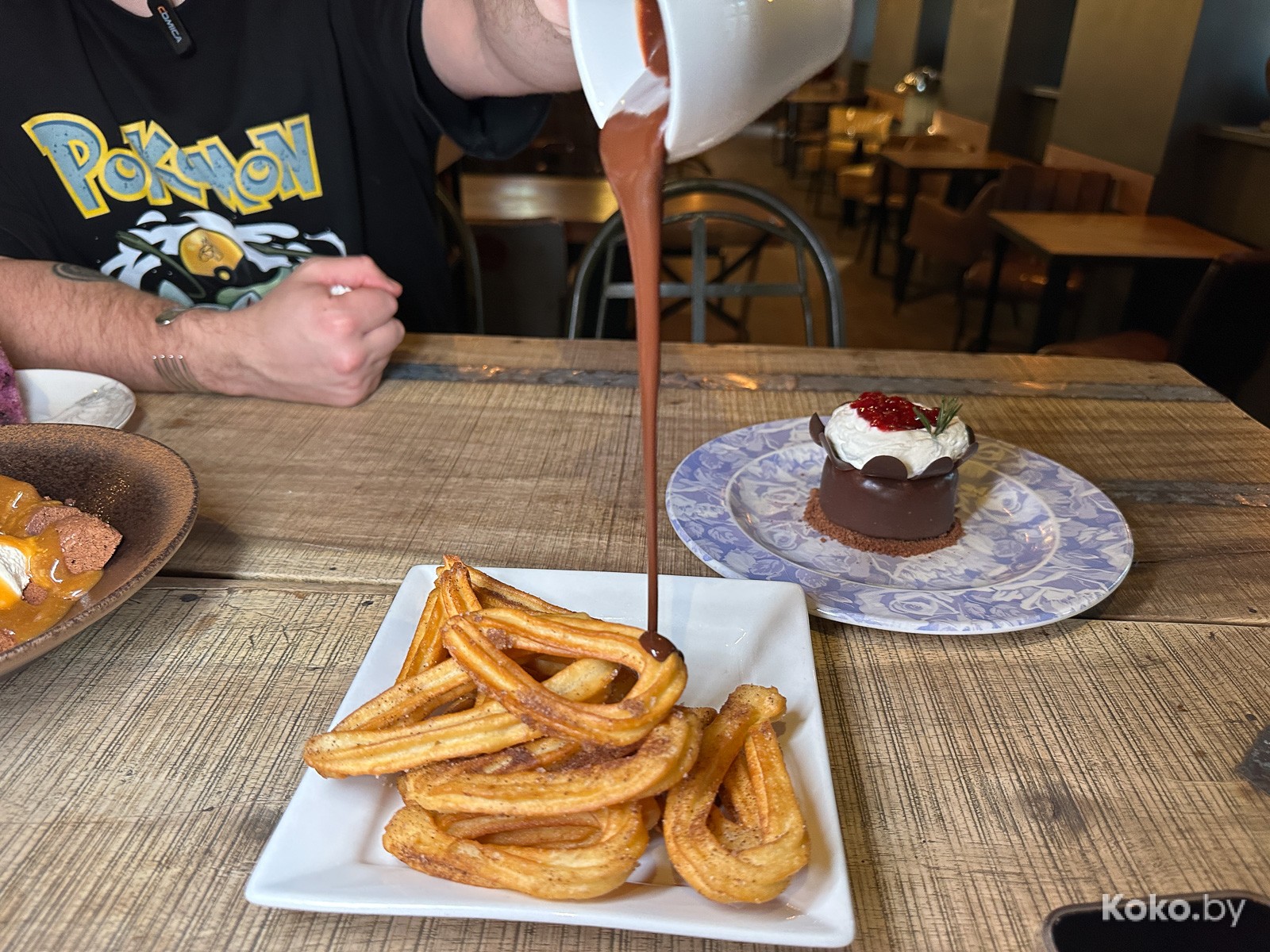 Из четырёх десертов один испанский не стыд, другой дико сладкая могилка на сухом брауни, третий вкусно красит язык, а четвертый - шоколадный цветок с хрустящим ореховым пралине - пушка. Вот вам загадка, хотя каждый десерт хорош по-своему, реально вам шепчу.