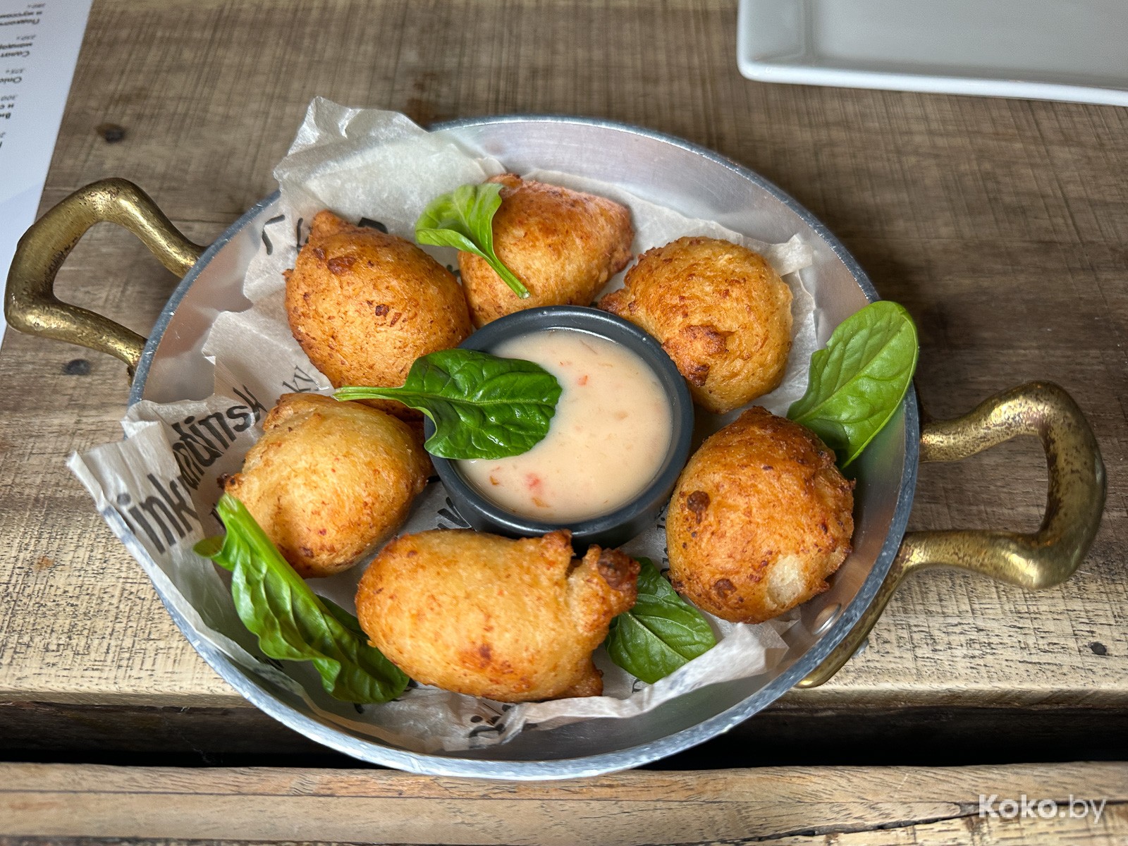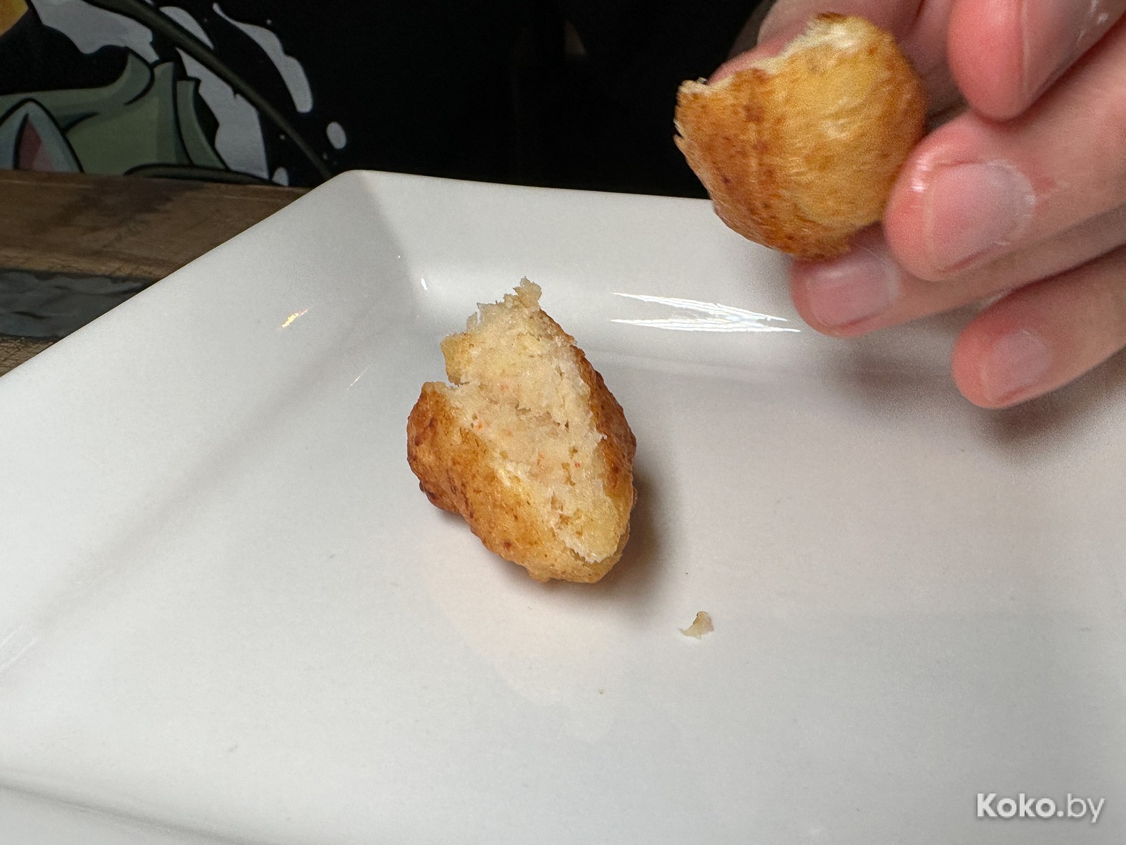2. Из раздела Джанк-фуд за 14byn золотистые пончики со вкусом краба, нужно макать в сливочный, больше сладкий, чем кислый соус. Мучные колобки закрывают углеводное окно, по ощущениям как теста поел.
