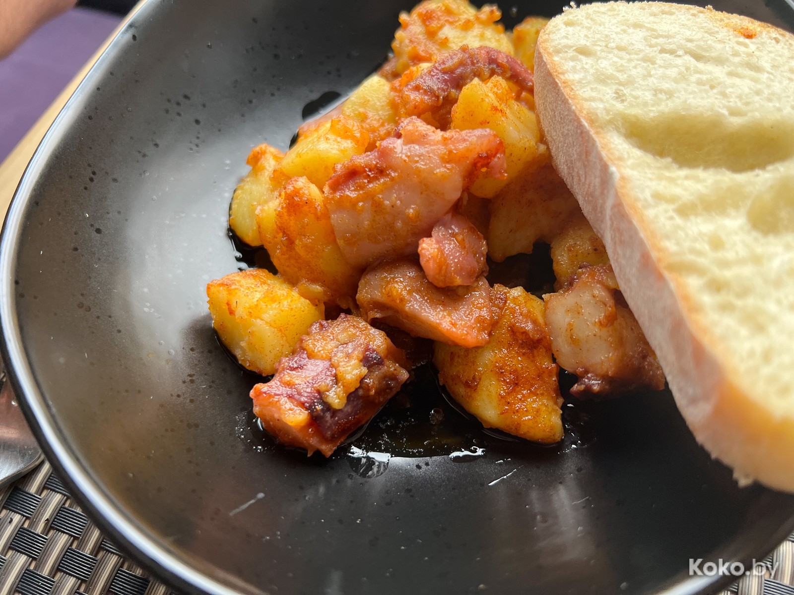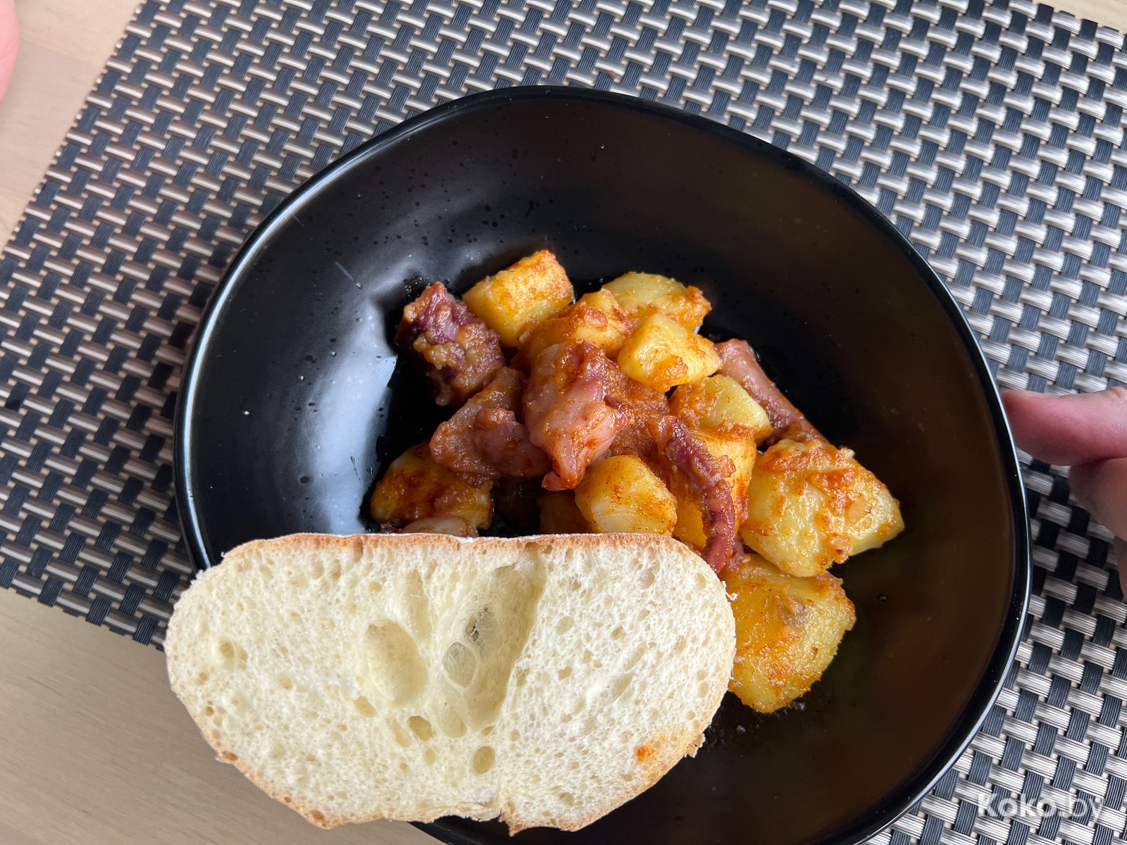 2. В тарелке жаркое по-бобруйски из картошки со щупальцем кальмара. Подаётся с куском хлеба, можно было и макароны закинуть, гулять так гулять! Блюдо пресное, как из больничного меню. Выкинутые 19byn.