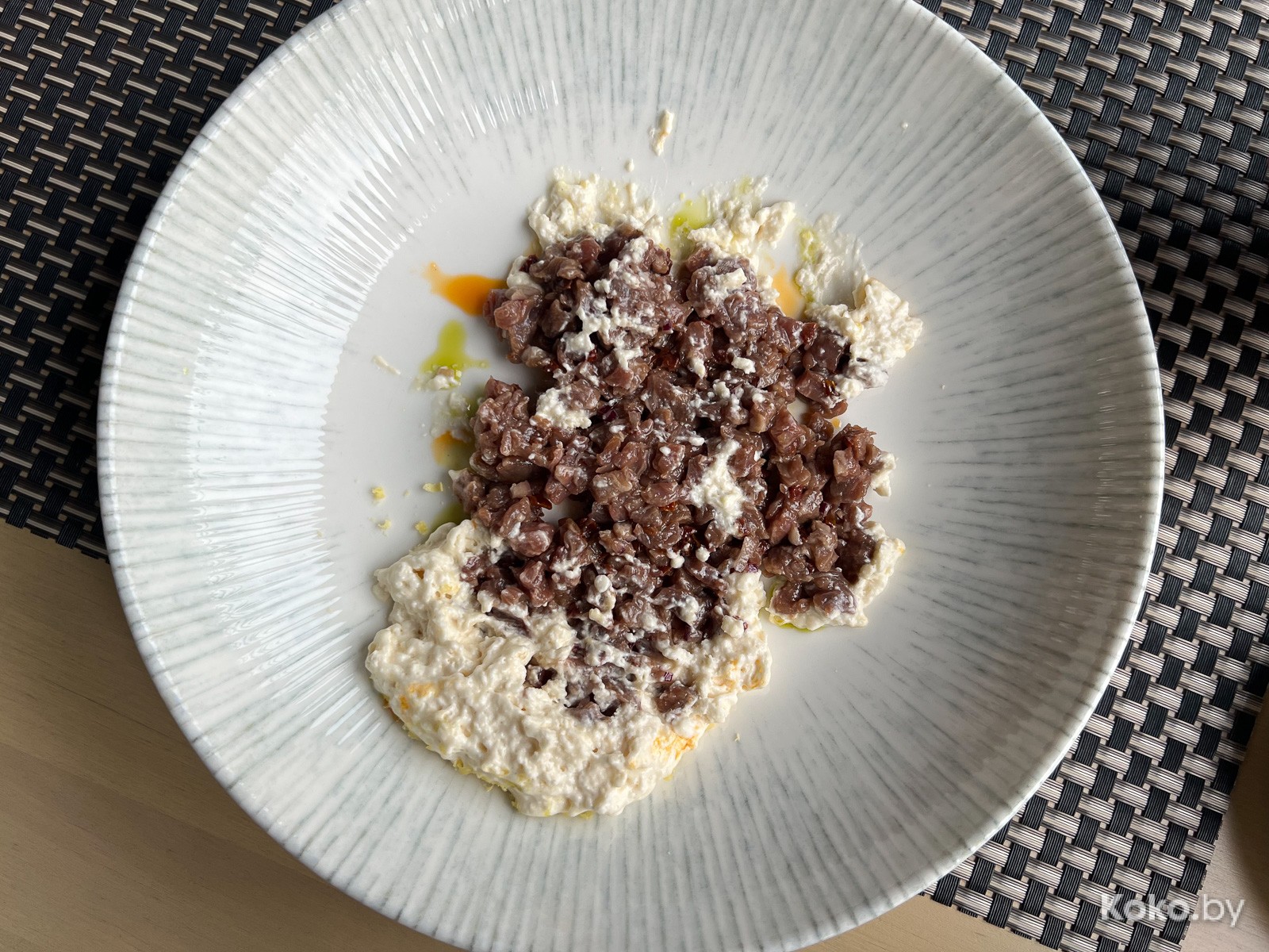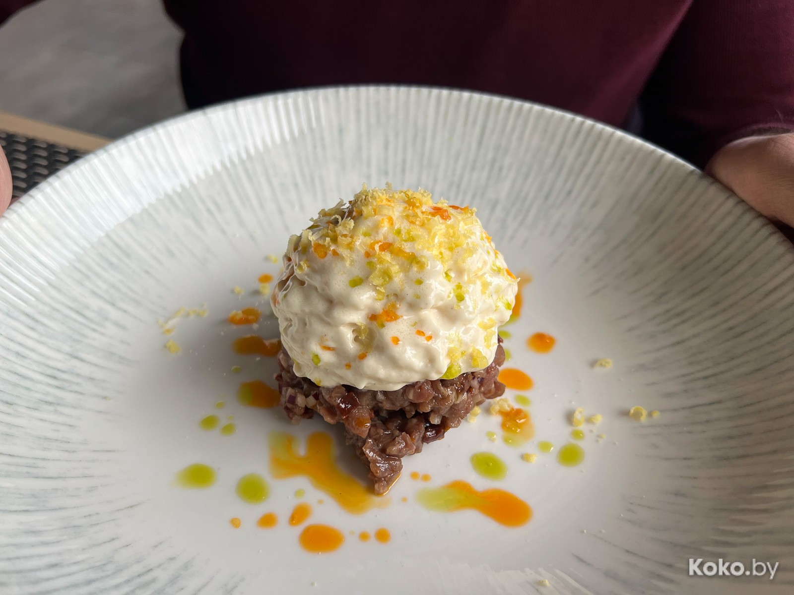 4. За 16byn страшного цвета тартар под сырно-луковым муссом, надеюсь, эта говядина не лаяла. Не нужно выпендриваться, делайте классику с раздельной подачей, и будет вам счастье, в тартаре главное - вырезка!