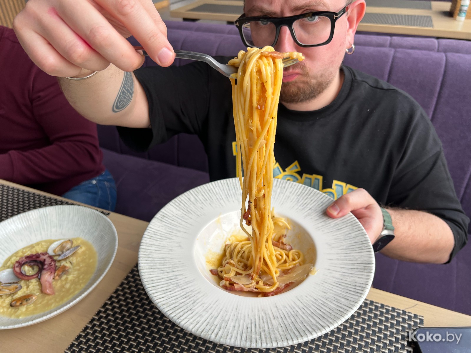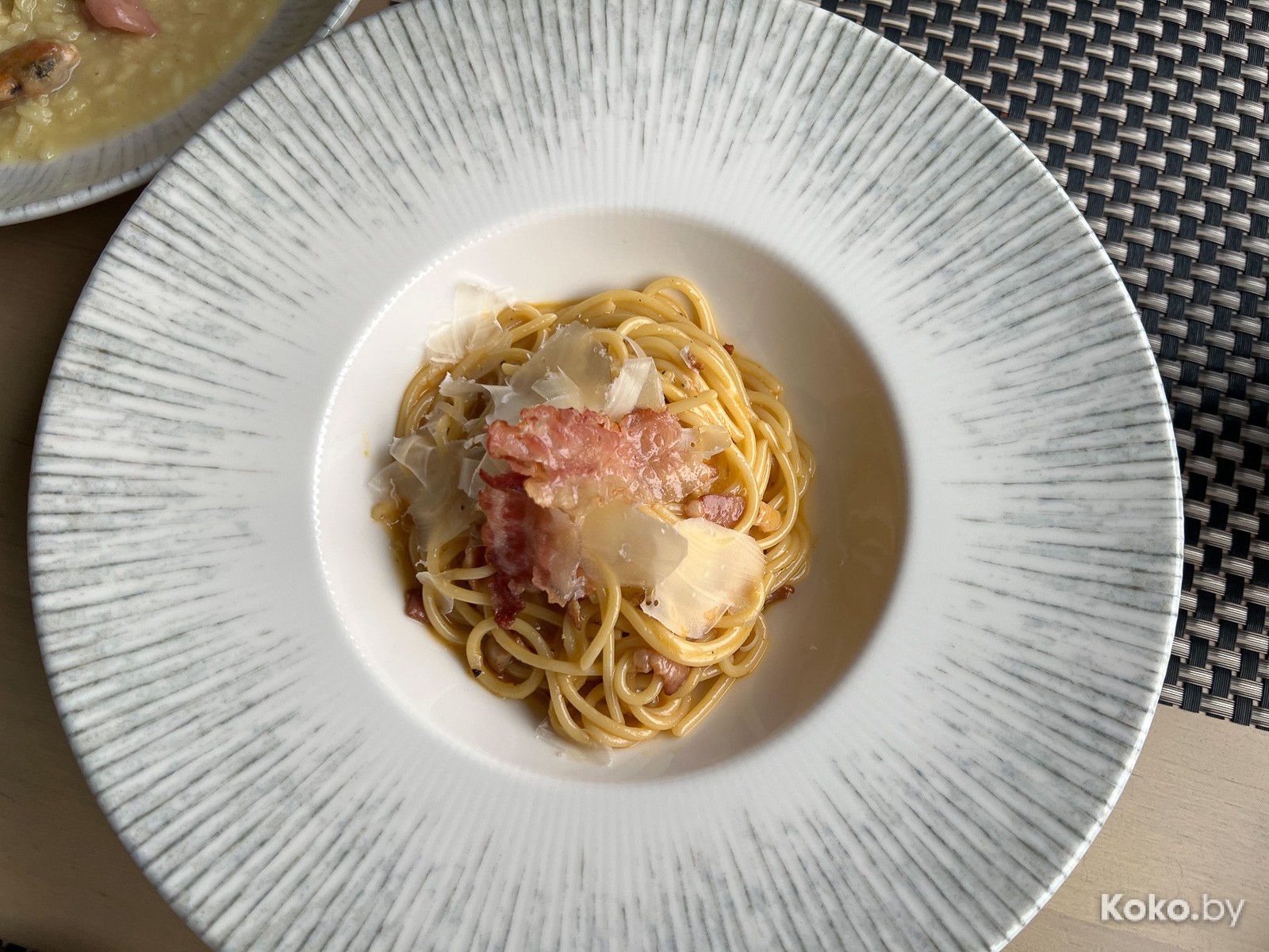5. Карбонара выглядит смачно! Правильный соус на яичных желтках нежно обволакивает честную порцию спагетти аль денте, под ними хрустящая грудинка, сверху сыр. За 14byn можно смело брать.