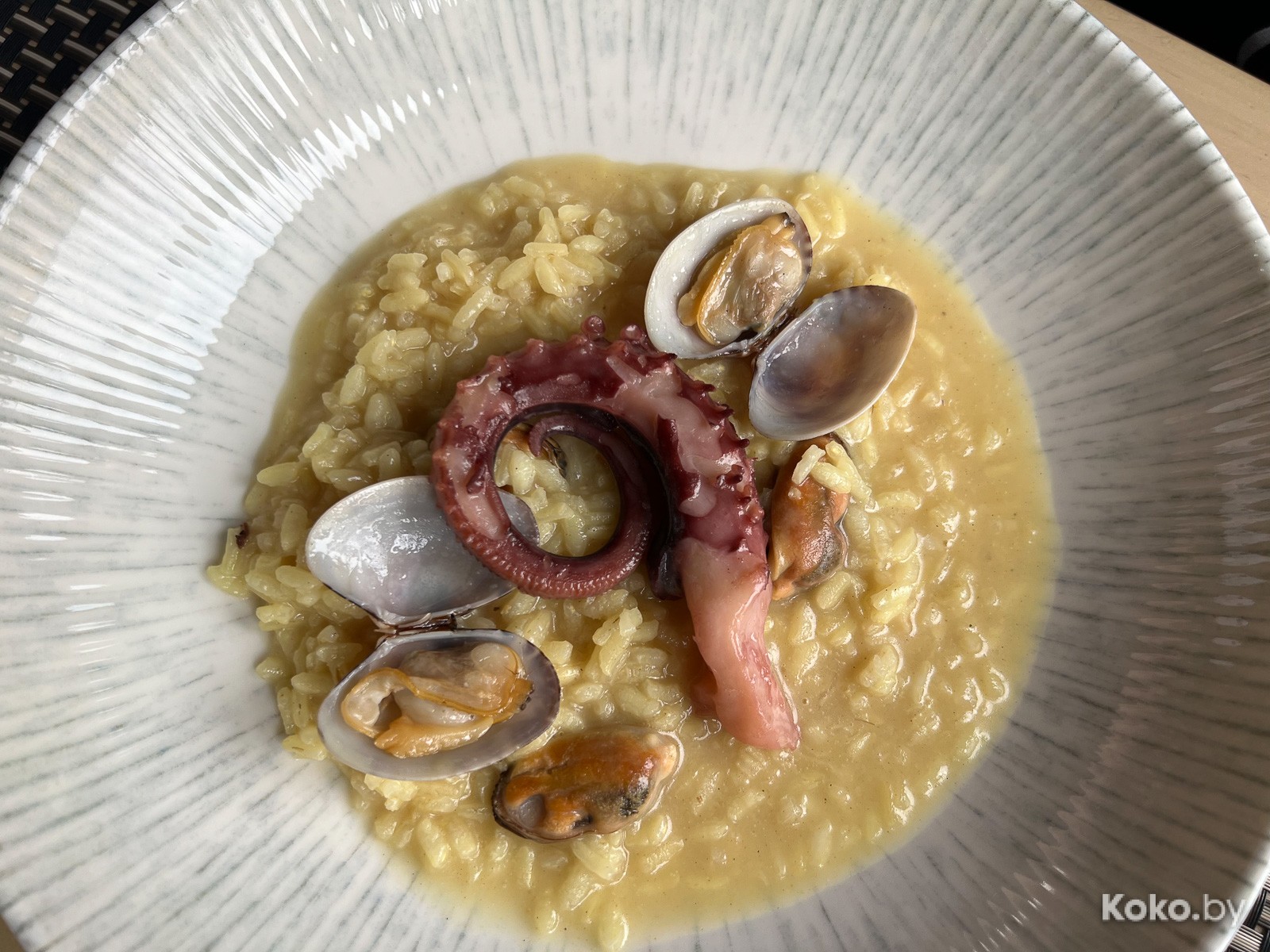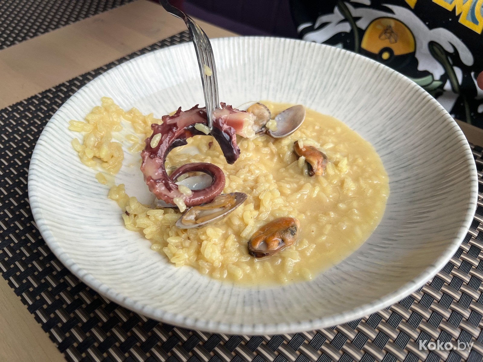 6. Когда на стол резко поставили ризотто с мориками, я чуть заикой не стал. Ты что такое? Рис 100% не Арборио, забыли помидоры, выглядит, как изобретение узбекских учёных из детского меню с остатками морского коктейля. Честная порция нежного щупальца кальмара, мидий с вонголе в рамках бюджета 15byn. На кухне сделали всё, что смогли, вижу, старались сделать конфетку из того, что есть на полке.
