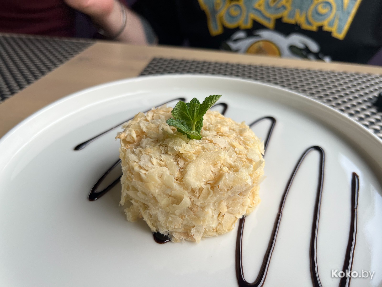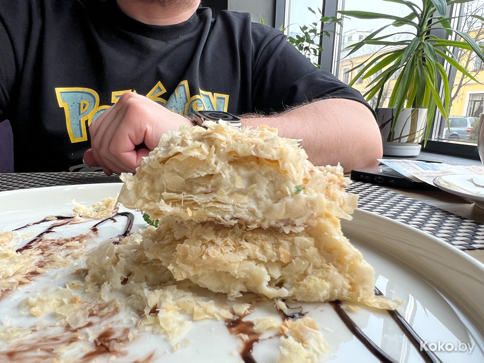 На десерт рандомно вытянули торт Наполеон за скромные 8byn. Что ж, это явно заготовка: холодный и влажный, как мечты рестораторов.