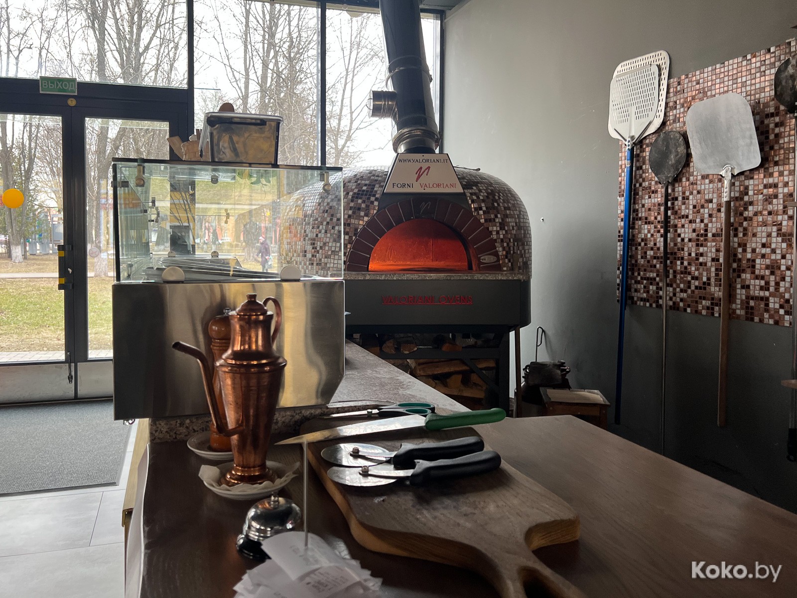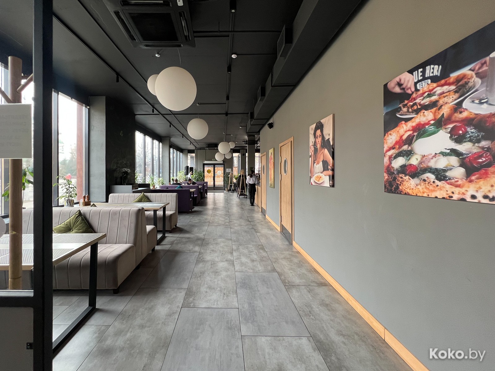 1. Пустой зал, быстрее всего получилась неаполитанская пицца из печи на дровах. На воздушном тесте тонкий слой сладкой томатной пасты, внутри поместилось пару кусочков ветчины и колбаски салями. Сочно, действительно вкусно, с вас 24byn, дороже, чем в Минске. Годнота!