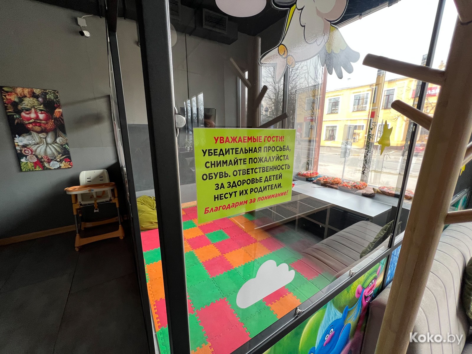 Помещение размером под свадьбы с большими окнами, мягкими диванами и детским игровым уголком, на стенах домашняя картинная галерея. По атмосфере типичное семейное кафе, вполне уютно.