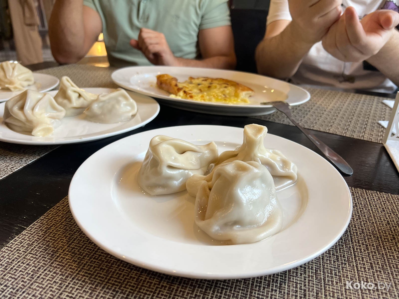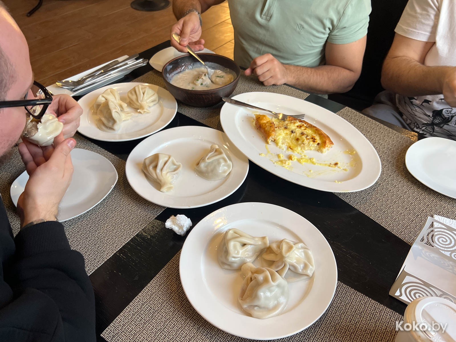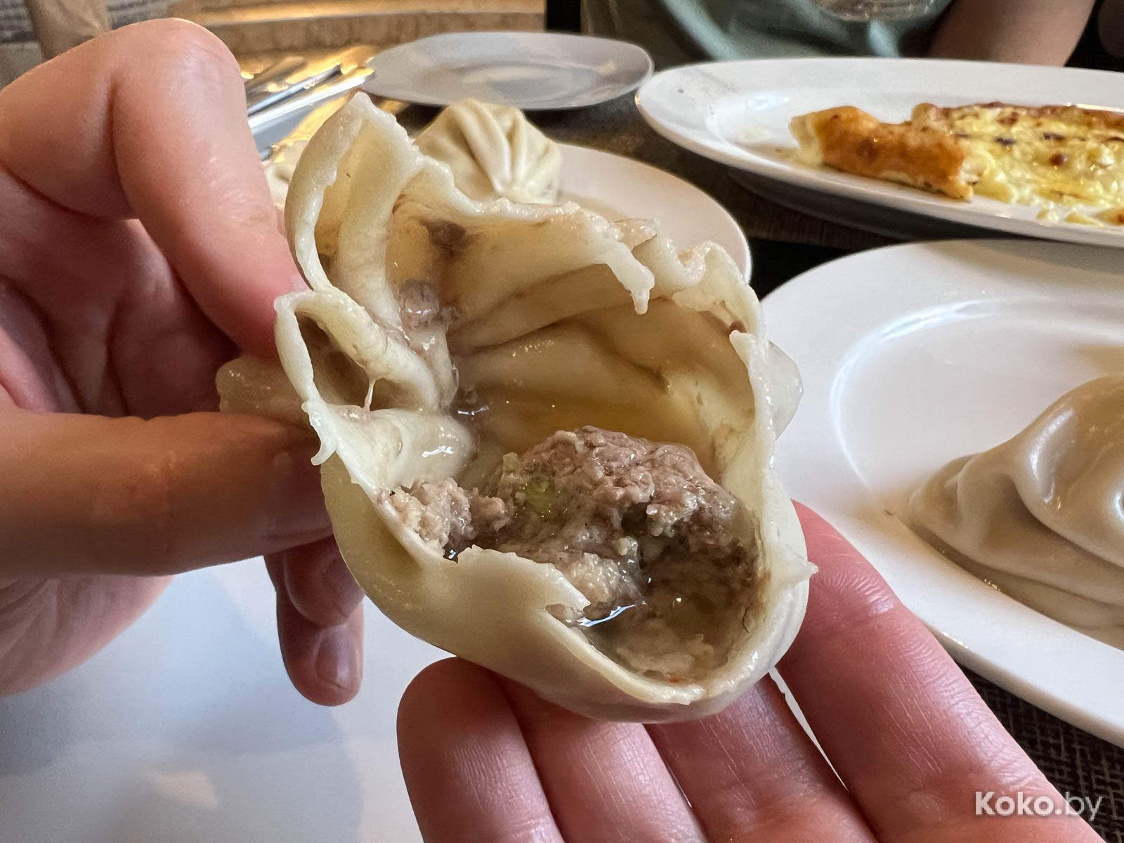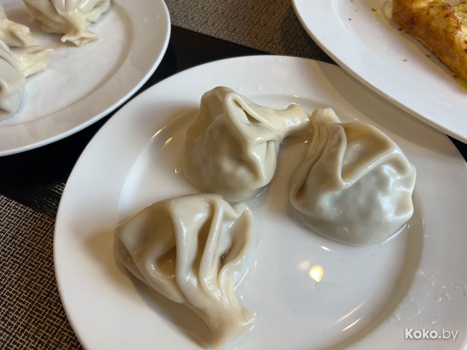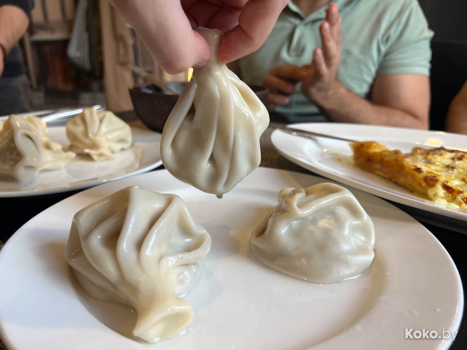 3. Дальше были разные хинкали с кулачок: с барашком за 8 штук отсчитали 16byn, с говядиной - 3 штуки за 9byn. Слепили грамотно, тесто тонкое, мяса в норме, соком по губам текут. Их хинкали на 8 кокобаев.