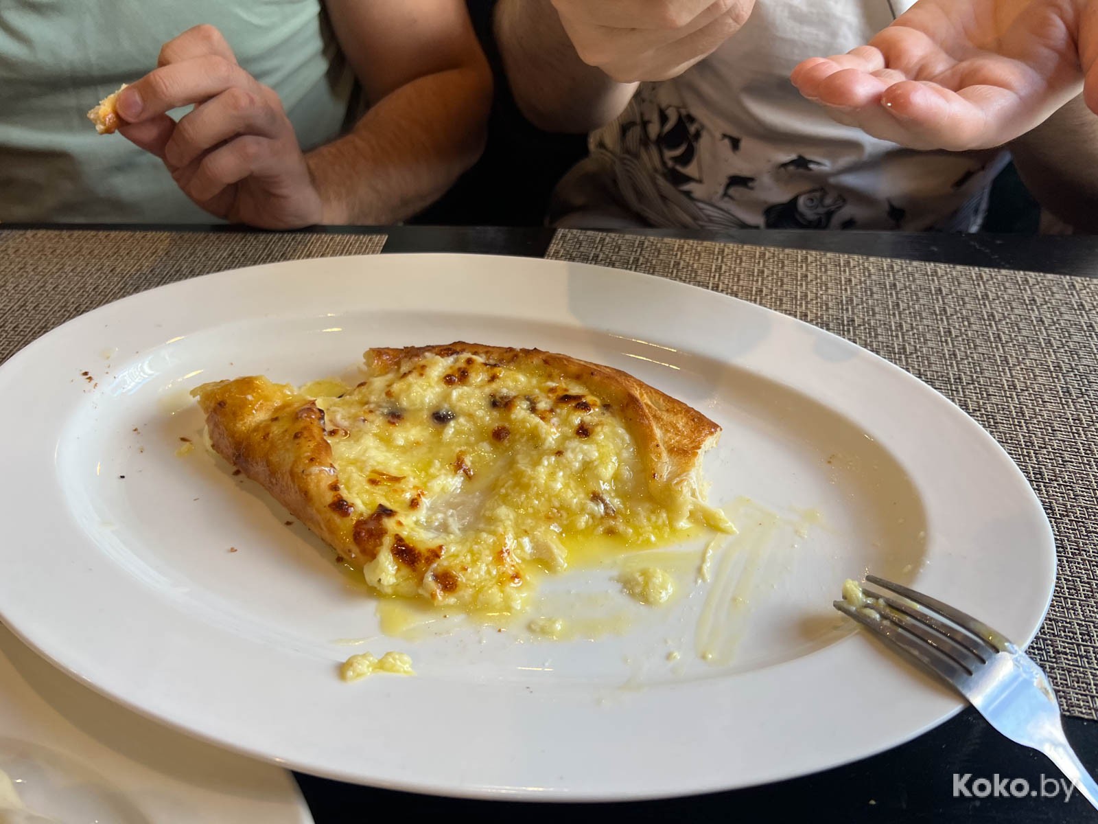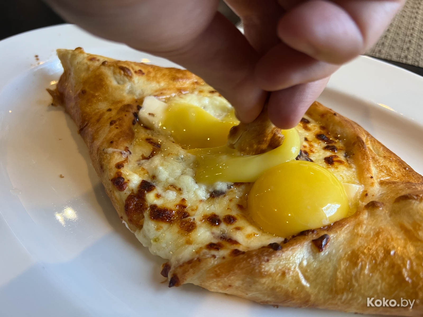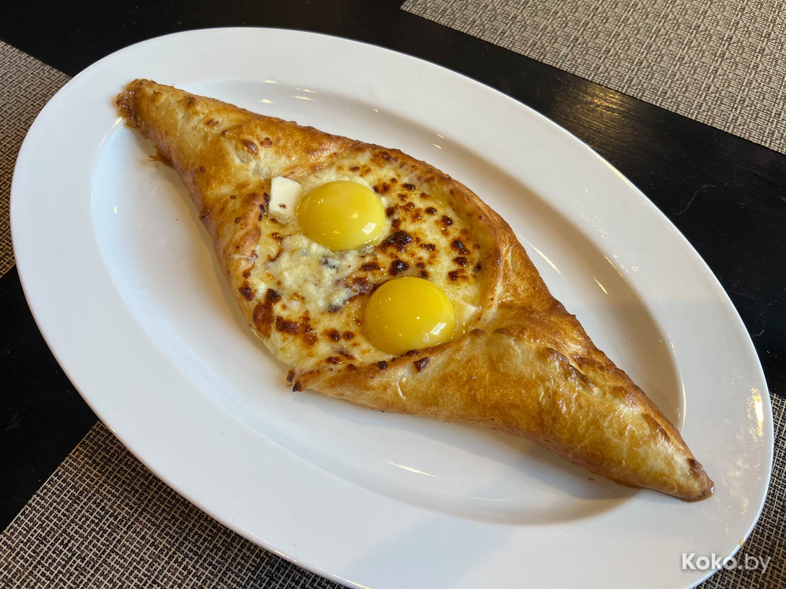 2. В форме двухместной байдарки с двумя желтками - хачапури по-аджарски за 18byn. Выглядит неуклюже, сырно, творожно, кисломолочки в борта не пожалели. Вкусно, но цену считаю на грани беспорядка.