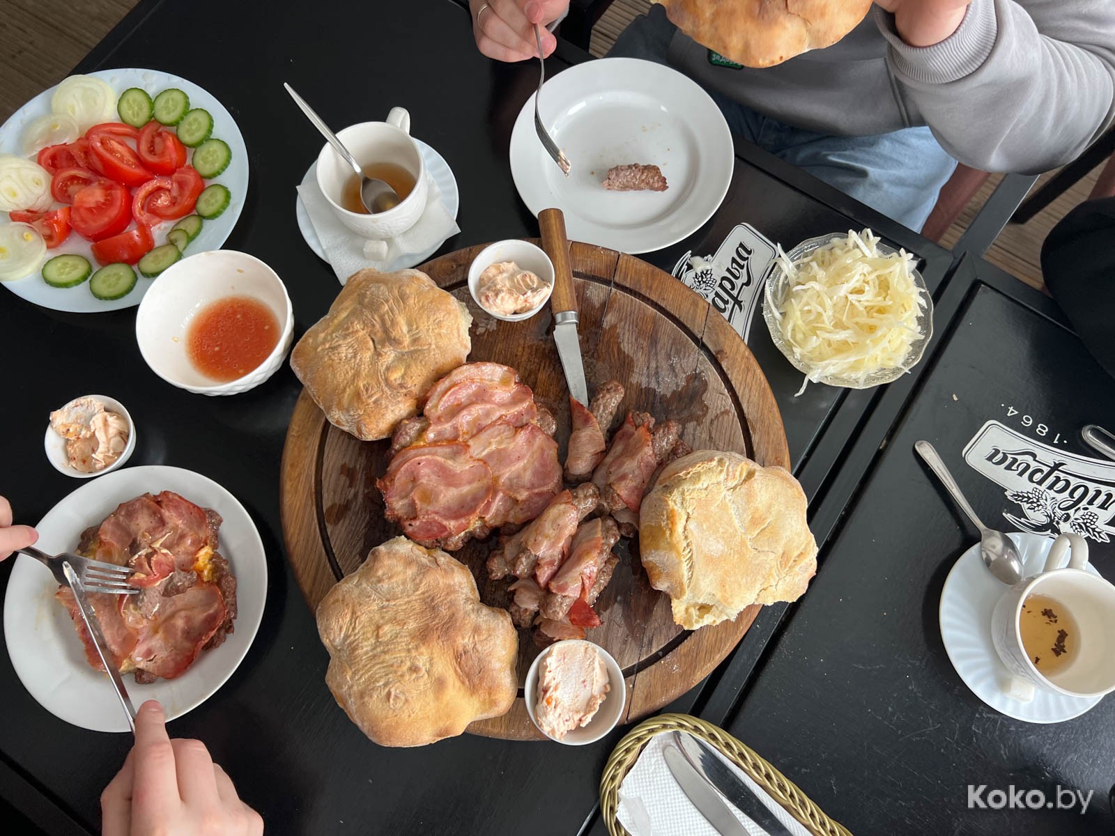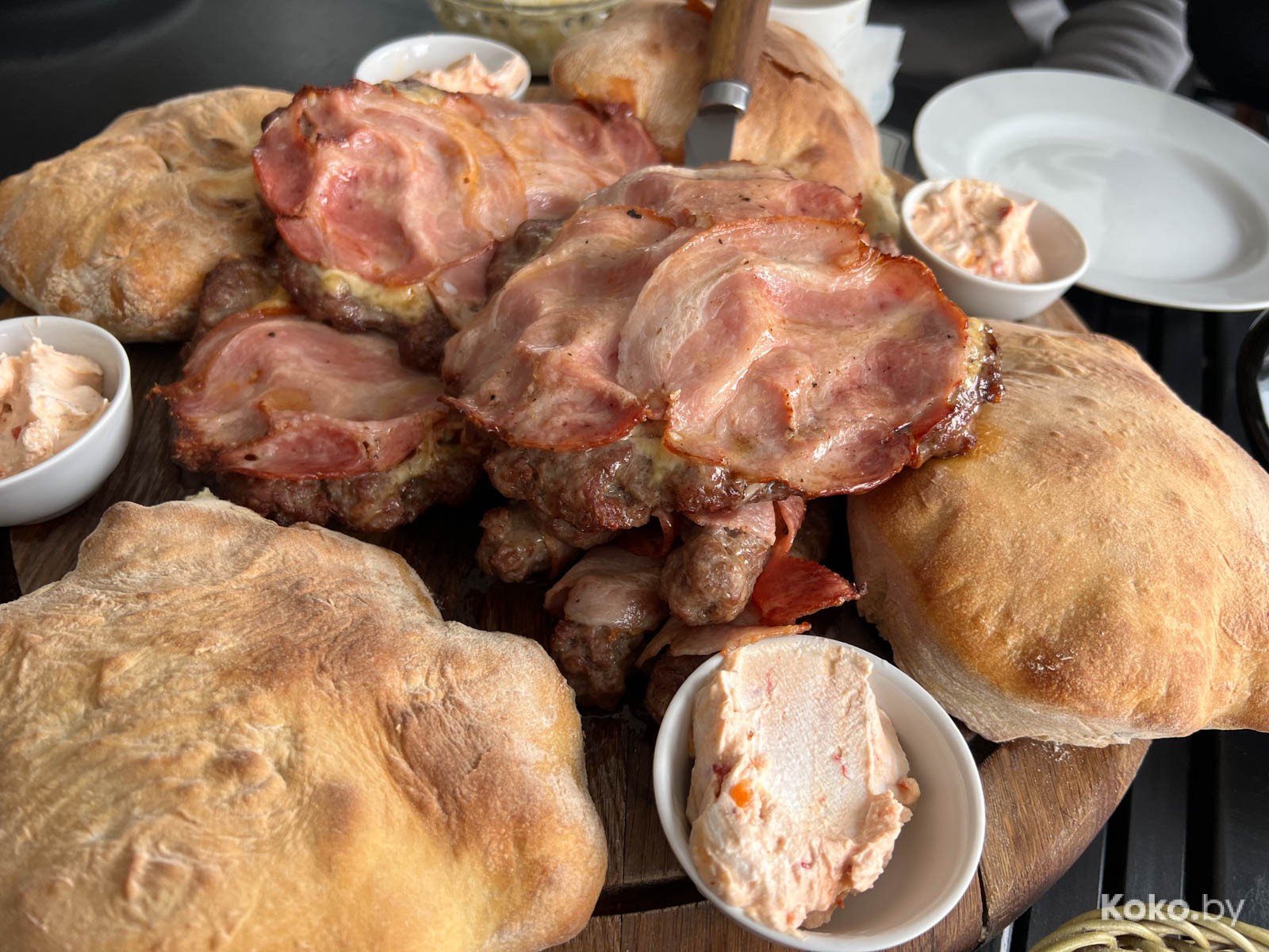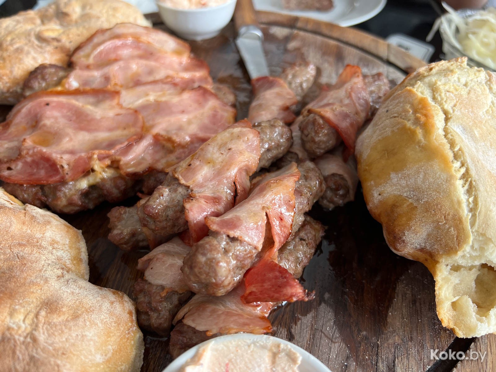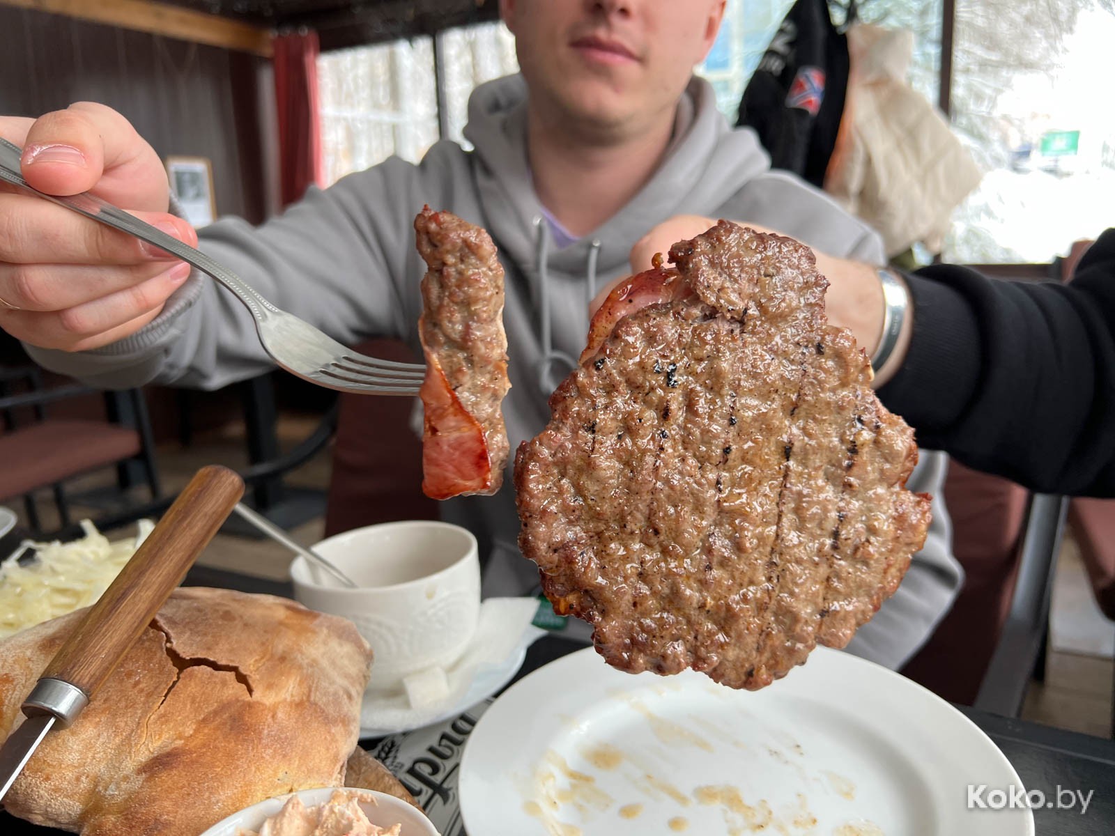 Заказали три 500-граммовые плескавицы из говядины по-гурмански - каждая по 22byn и Феде колбаски чевапчичи, завёрнутые в бекон, за 22byn. Попросил, чтобы мясо вынесли вместе на большой дружеской доске. Маринованную капусту по-домашнему и салаты - по готовности, т.к. знал, что минут тридцать местному повару понадобится, чтобы справиться с котлетами. Уверен, что он на кухне один-одинёшенек.