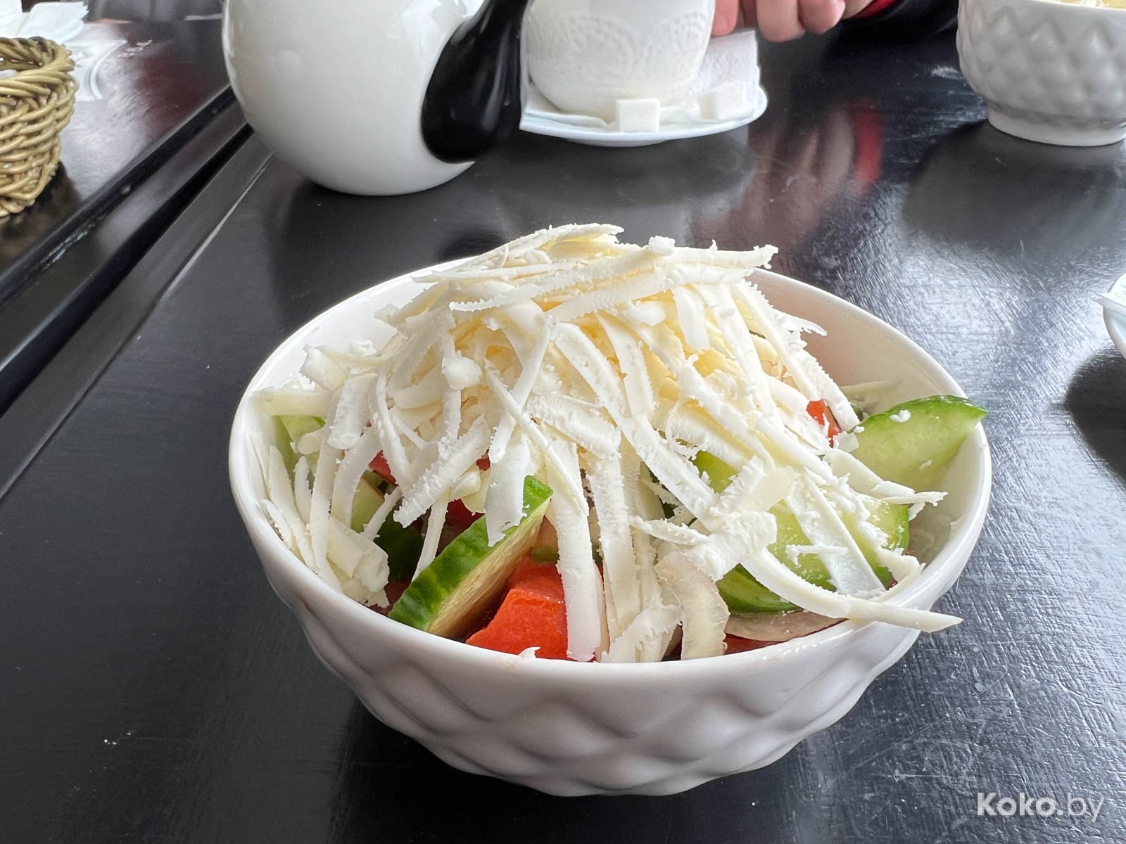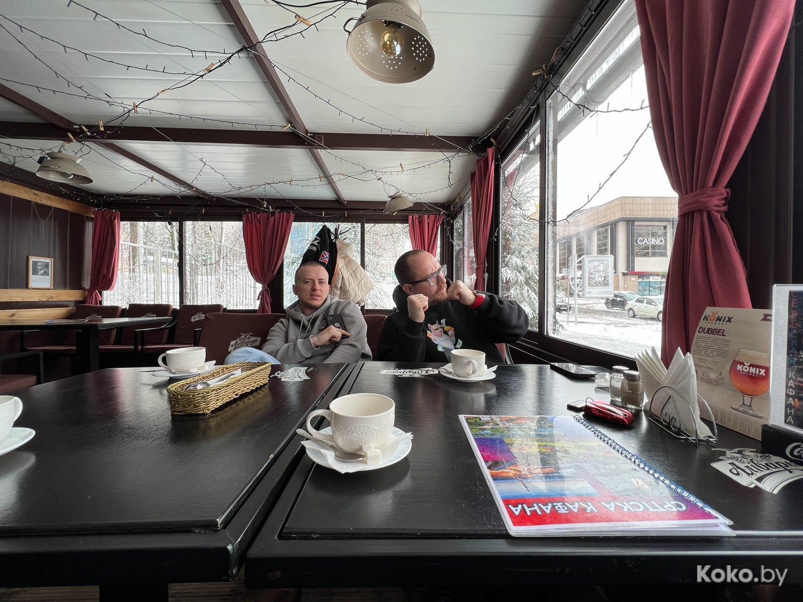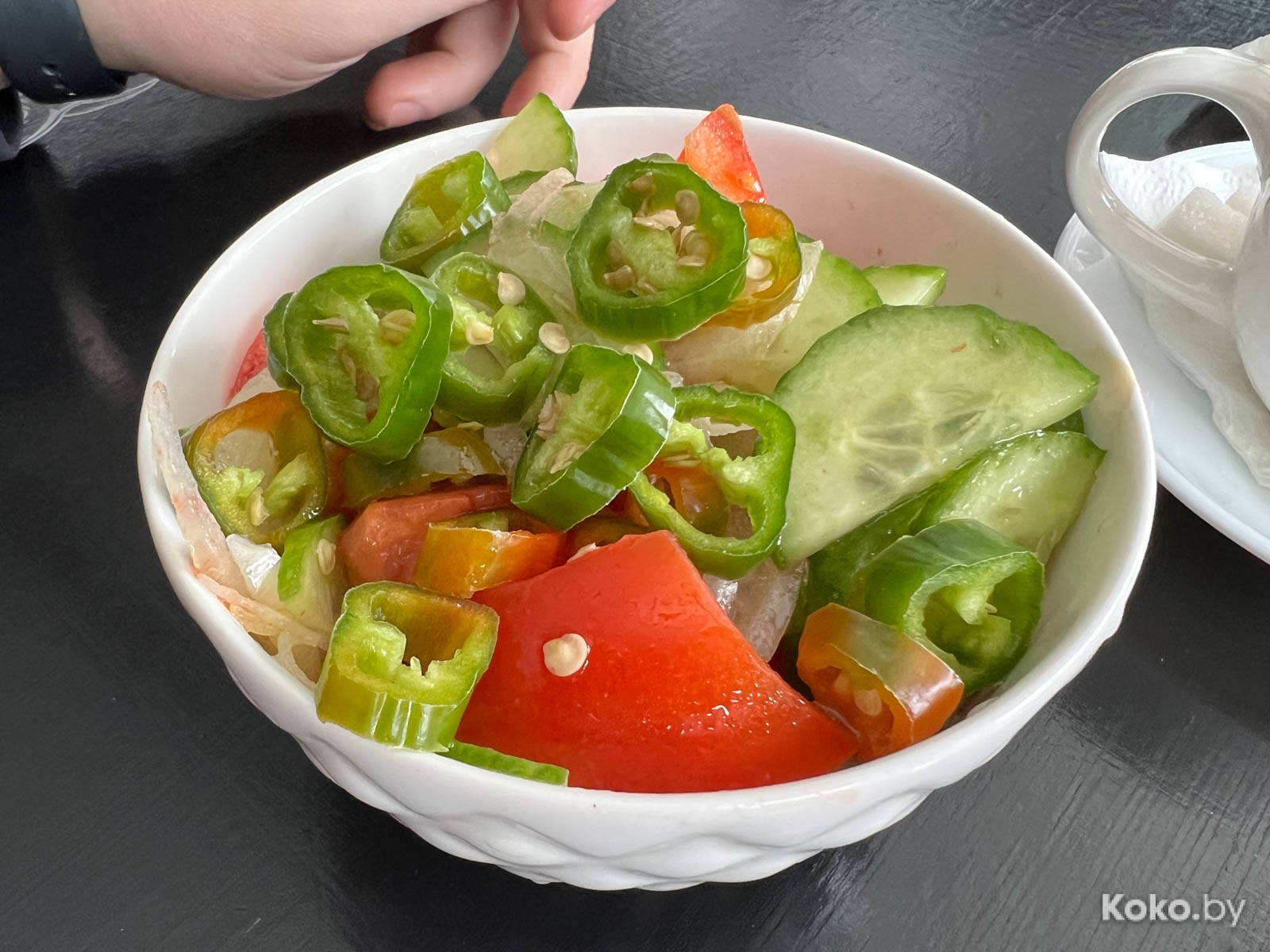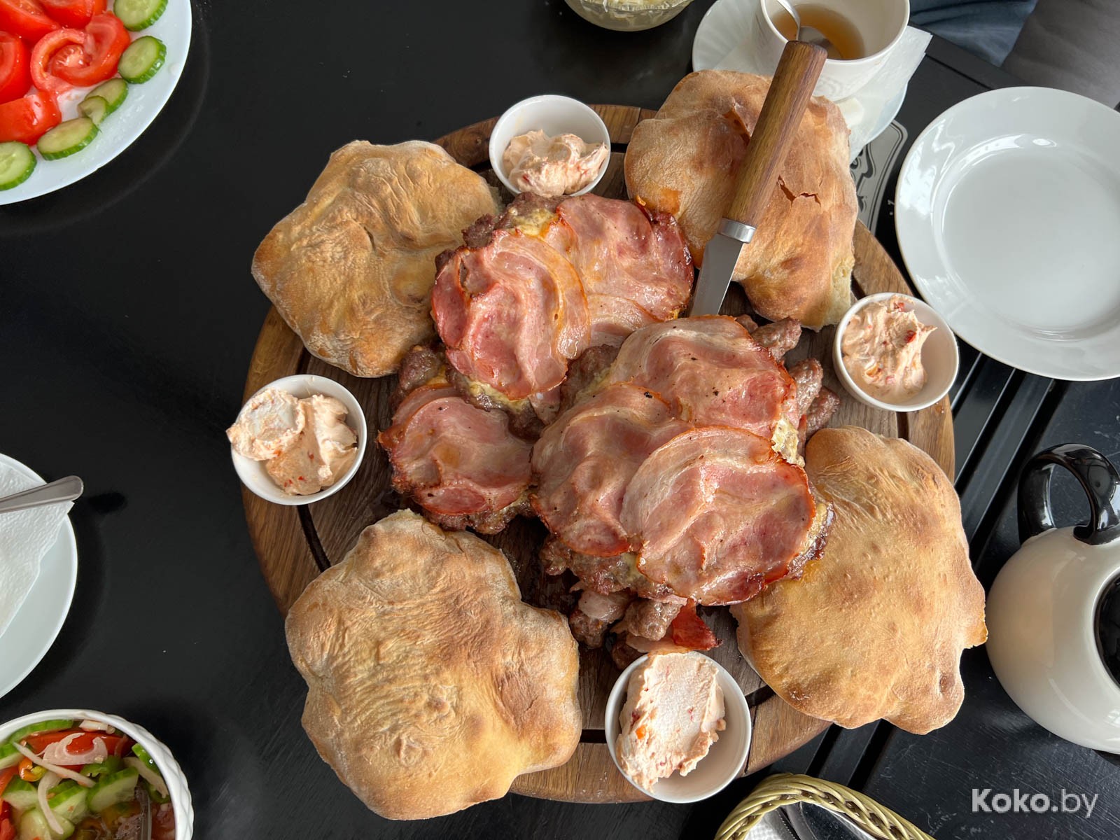 Заказали три 500-граммовые плескавицы из говядины по-гурмански - каждая по 22byn и Феде колбаски чевапчичи, завёрнутые в бекон, за 22byn. Попросил, чтобы мясо вынесли вместе на большой дружеской доске. Маринованную капусту по-домашнему и салаты - по готовности, т.к. знал, что минут тридцать местному повару понадобится, чтобы справиться с котлетами. Уверен, что он на кухне один-одинёшенек.