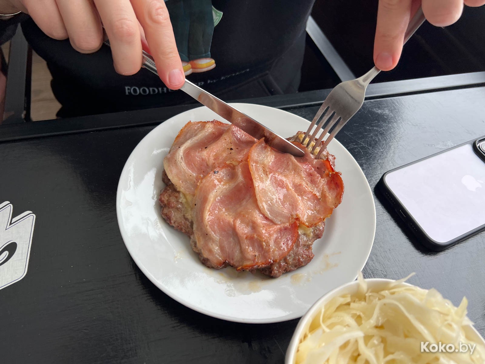 1. Тупо капуста в рассоле - огнище, хрустящая, пряная, в меру сладкая. Плескавица по-прежнему выглядит мощно, сочно, с лёгким запахом огня. Сверху на ней расплавился кусок сыра, а на нём пожаренный бекон. Супергодно, но блюдо нифига не диетическое, запивать Кокой.