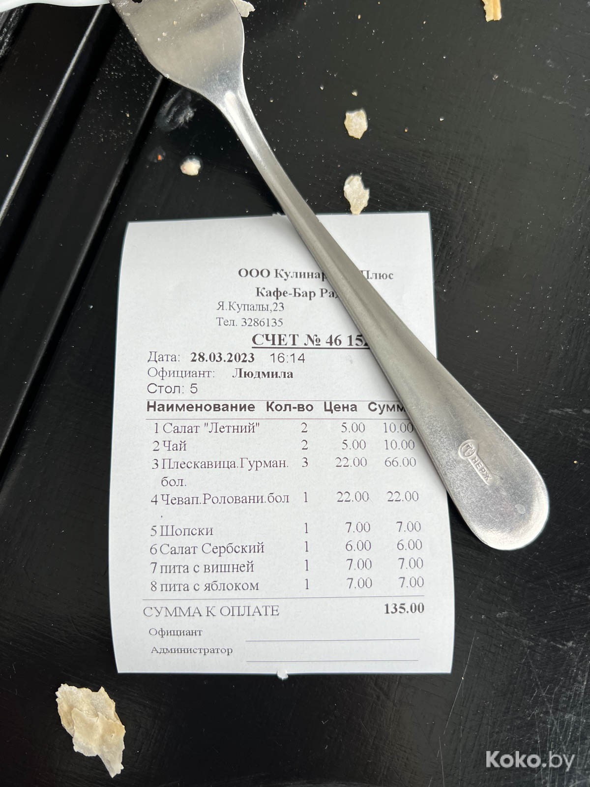 Во времена моей смутной молодости на этом месте пили пиво, курили кальян с платной заменой угля и иногда чифирили кофе. Чуть позже в кафе метр на метр плюс терраса «Радзивилл» произошли глобальные изменения, да, всё вы правильно поняли, появилась сербская кухня. Смею предположить, что новые владельцы - сербы. Предупреждаю, т.к. заведение домашнего типа с меню на четыре блюда с салатами, всё жарят из-под ножа, долго, не преувеличиваю.